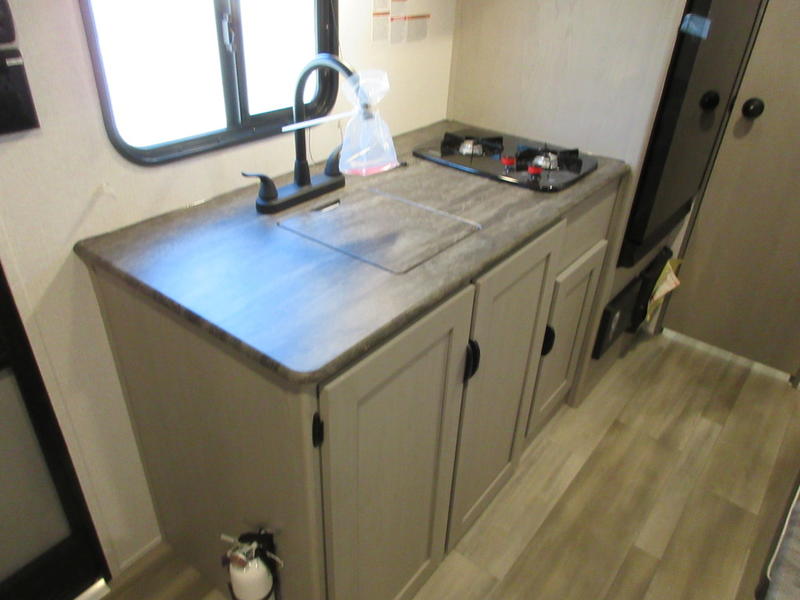 You can sleep five people in this Clipper Cadet travel trailer with the 54" x 74" bed at the front, the booth dinette, and the 28" x 72" bunks. There is a private bathroom that everyone can use to stay clean, and the chef of the group can cook meals on the two-burner cooktop in the kitchen. There is also a pantry and 3-cubic foot refrigerator that you can use for food storage. There is more storage for other types of items up by the bed, and there is a pass-through exterior storage for larger gear. When it's raining outside, simply put out the 10' power awning for protection.