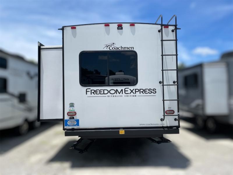 With any Freedom Express Ultra Lite travel trailer by Coachmen you will appreciate quality construction materials, such as vacuum bonded walls with Azdel composite, a 3/4 gel coated fiberglass cap with an automotive glass windshield, and a heated enclosed underbelly. Each model also features Tufflex PVC roofing, front rock guard, and E-Z Lube axles for smooth towing. Inside, you'll find kitchen backsplash, hidden hinge cabinetry, and wear-resistant vinyl flooring throughout. The power tongue jack included with the Ultra Lite Express Pack will make set-up a breeze, and each model includes back-up camera prep and they are Freedom solar ready if you plan to go off-grid. Enjoy lightweight camping with a Freedom Express Ultra Lite travel trailer today!
