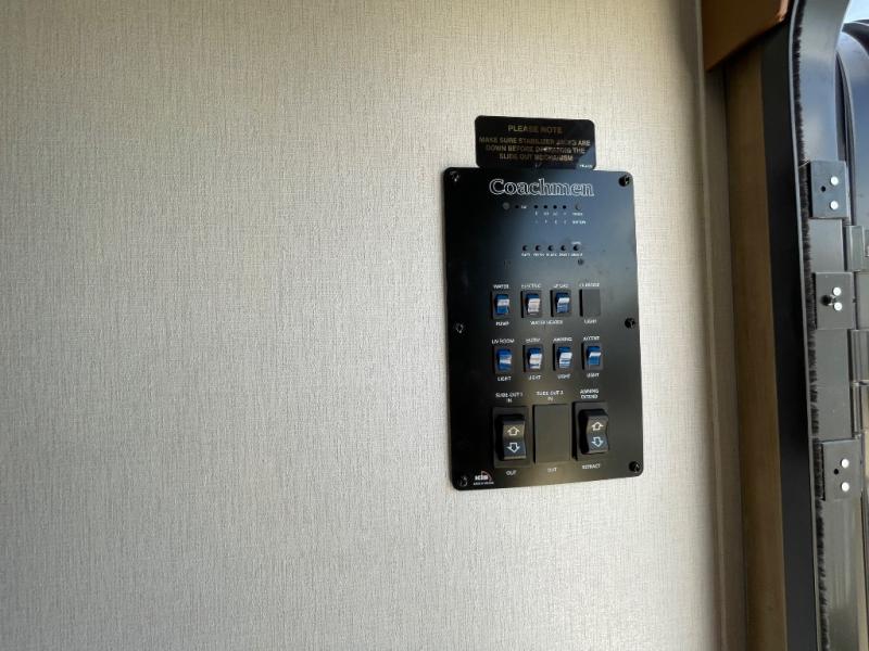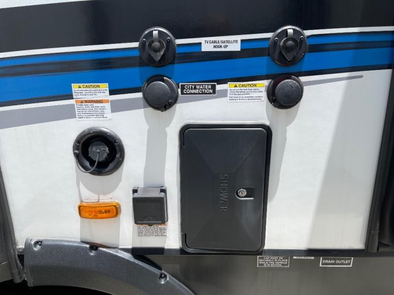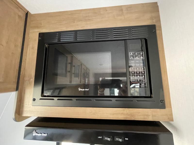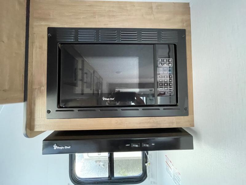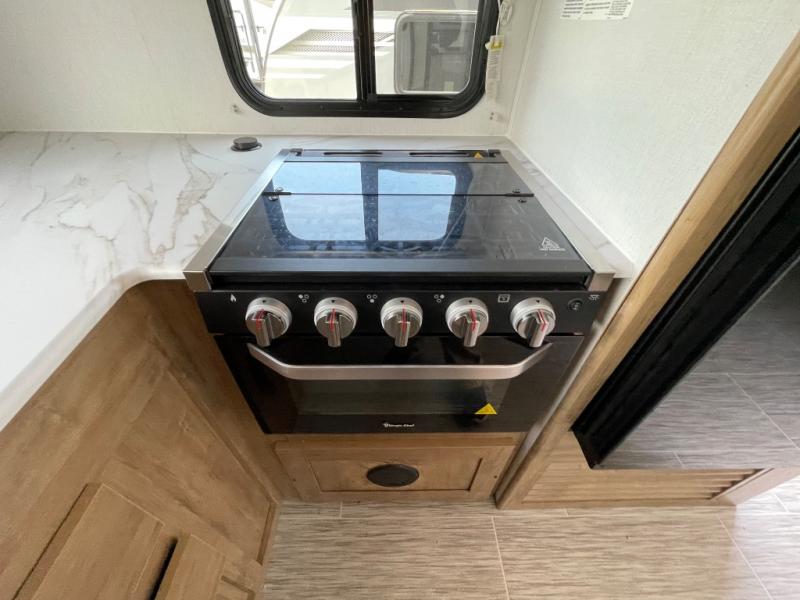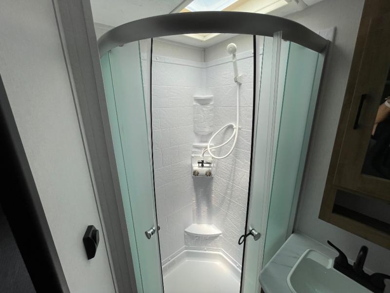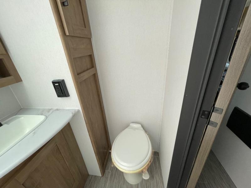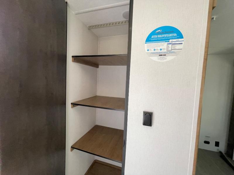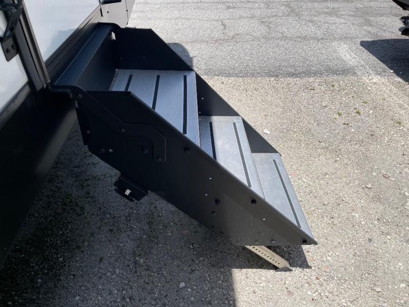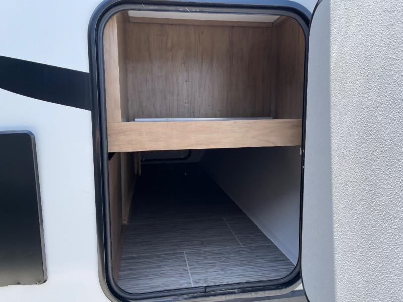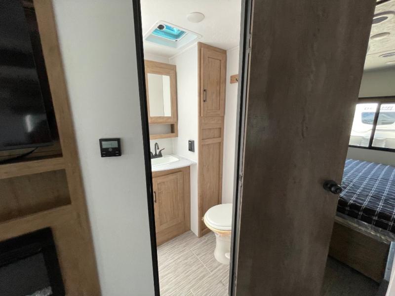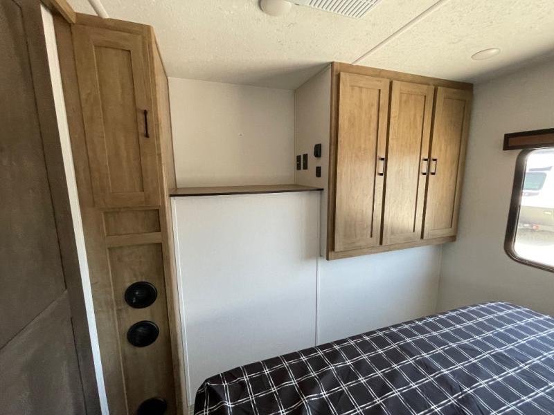 Comfort comes easy in this front kitchen travel trailer for four! You will love the rear master bedroom with its king bed slide out, spacious wardrobe, and a private entrance into the dual entry bath. There is a sofa that sits directly across from the fireplace and entertainment center, or you can choose the optional theater seat or optional hide-a-bed sofa in place of the standard sofa. The front kitchen features tons of counter space, an 8 cu. ft. double door refrigerator, plus a large pantry for dry good and snacks. There is also a pantry/closet just as you enter the trailer that will be perfect for shoes and jackets!