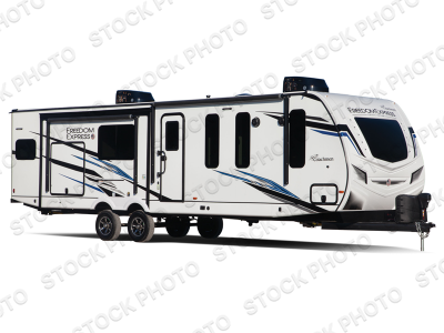 With any Coachmen Freedom Express Liberty Edition travel trailer, there is aluminum cage construction, vacuum bonded interior and exterior walls with Azdel composite, a heated and enclosed underbelly for four seasons of travel, and Tufflex PVC roofing. Some other features include hidden hinge cabinetry, Carefree flooring, a porcelain toilet, and the AIR 360+ amplified omnidirectional VHF/UHF, FM and WiFi antenna with optional 4G LTE Gateway add-on. And the required Express Pack includes an exterior griddle with side table, 50 AMP service, frameless windows and a ladder to reach the roof.