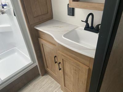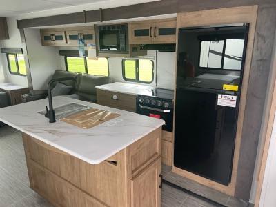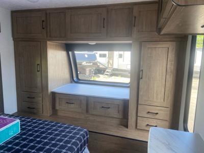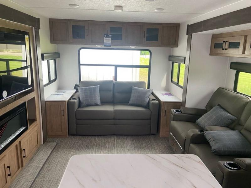 This spacious trailer offers dual opposing slides in the main living and kitchen area and a queen bed slide in the bedroom giving you lots of floor space in both areas! The kitchen offers full amenities including a large pantry, extra counter space, a center island, and a booth dinette. And the cook will be able to enjoy the LED TV and fireplace while making meals. Everyone can relax on the theater seats and the hide-a-bed sofa with end tables when visiting, and the furniture can double as sleeping space if needed. You will have your own bedroom to unwind with plenty of storage in the dressers and wardrobes. And the full bathroom offers a shower, linen storage and laundry bag, plus extra counter space for your toiletries.