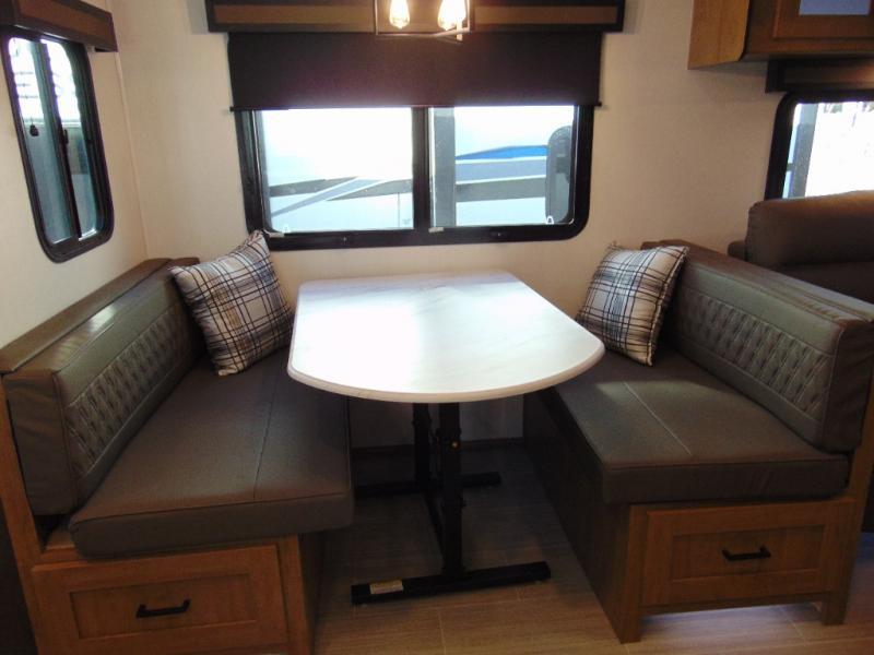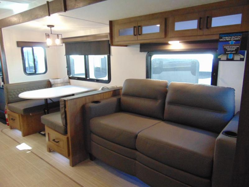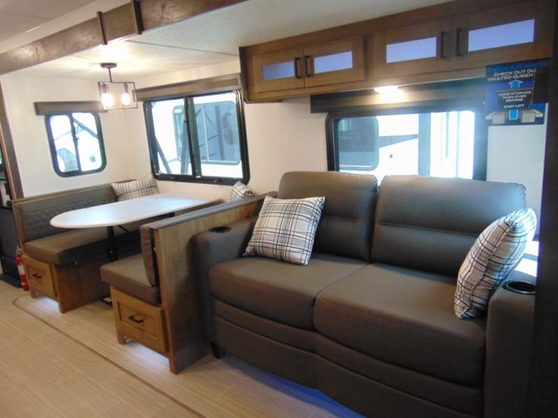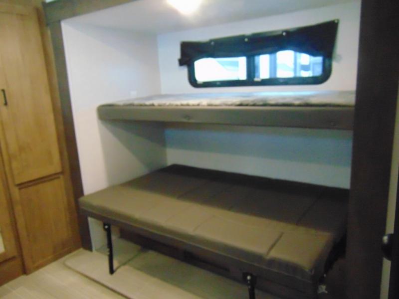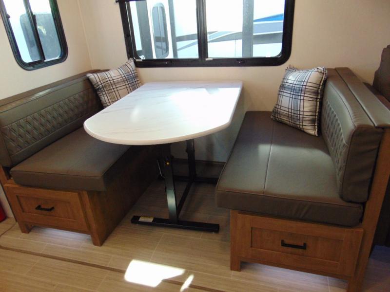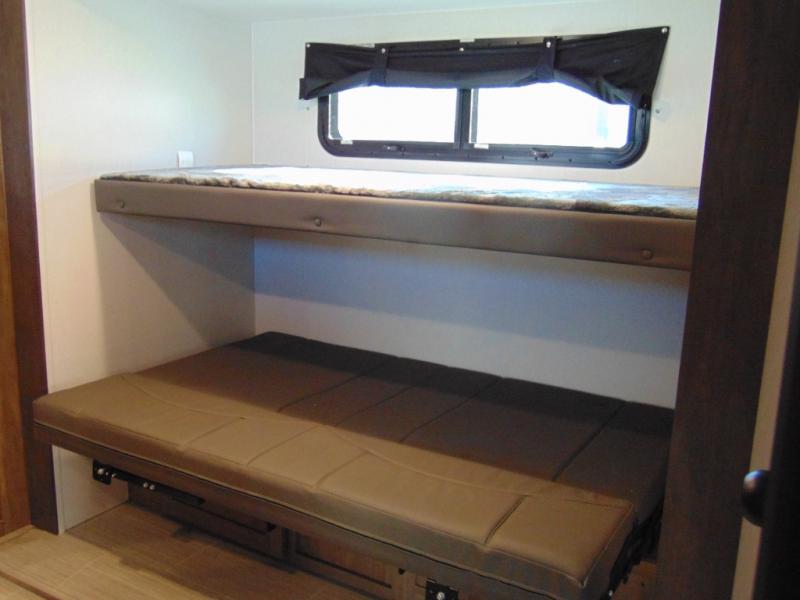 This model boasts an expansive floorplan with dual slide-outs, offering a roomy interior perfect for large families or entertaining. The rear bunkhouse provides a private retreat for the kids with ample sleeping space and storage, while the front private bedroom delivers peace and comfort for parents. A large U-shaped dinette and plush theater seating ensure everyone rides and dines in comfort.