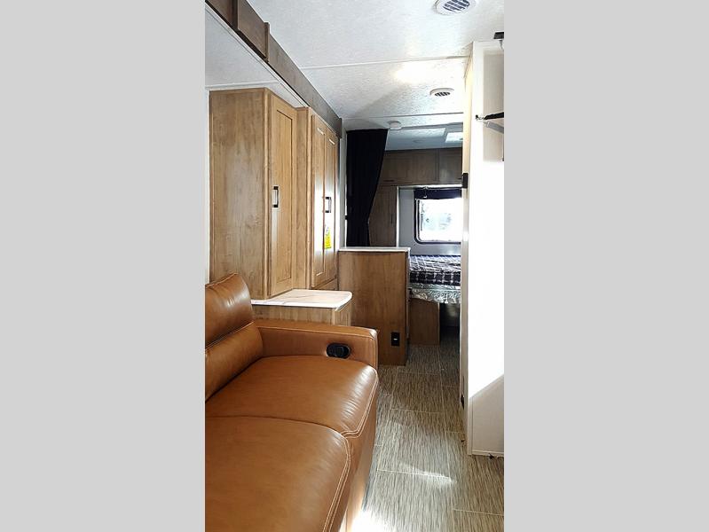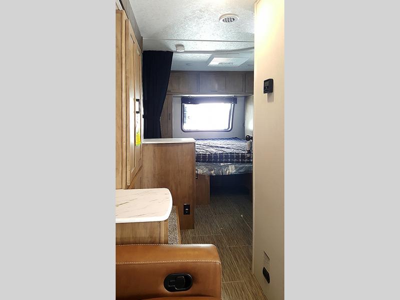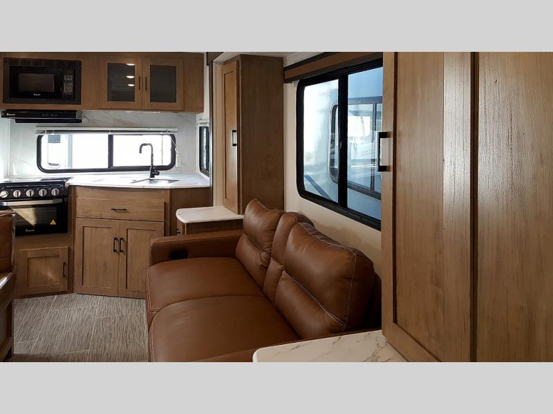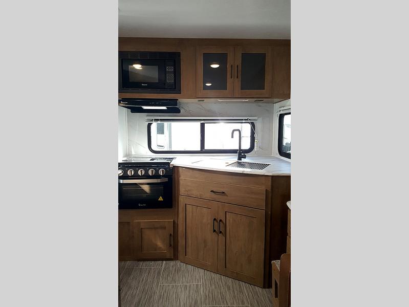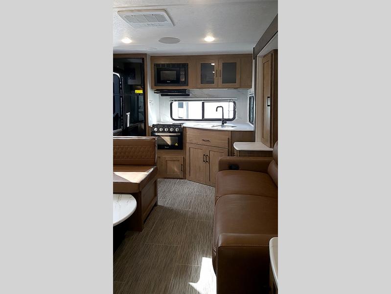 Check out this rear kitchen travel trailer that can sleep three to four each night. The front semi-private bedroom includes a privacy curtain and a queen bed with vaulted under-bed storage for your belongings. The sofa within the large slide out and the booth dinette will provide comfortable seating space, and there is a Smart TV for those rainy camp days. This model also includes a three burner cooktop, a microwave oven, and an 8 cu. ft. double door refrigerator for your perishables. And don't forget about the 18' power awning with LED lights!