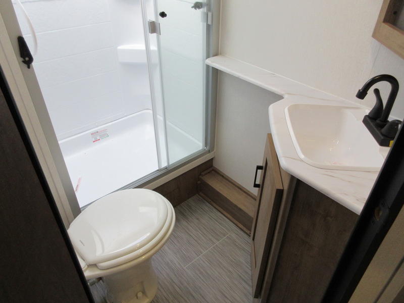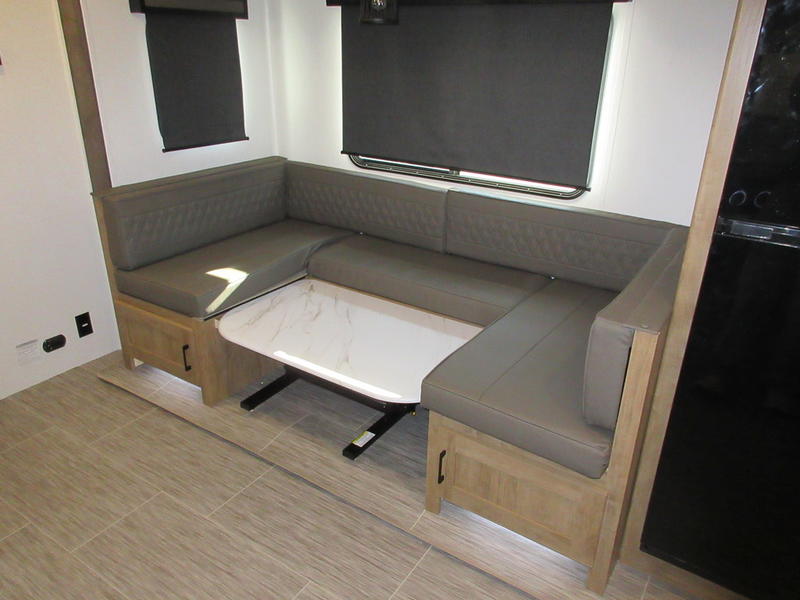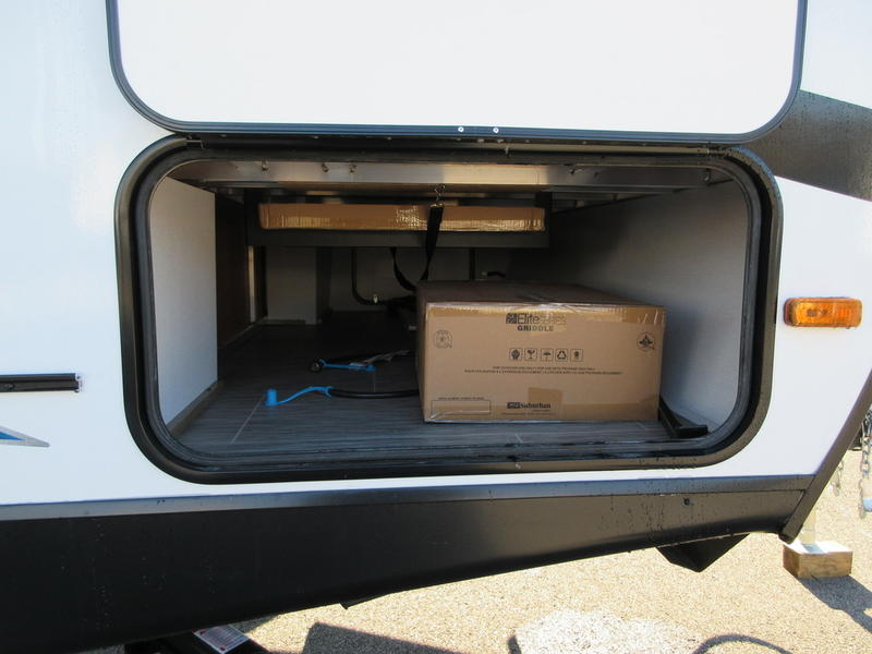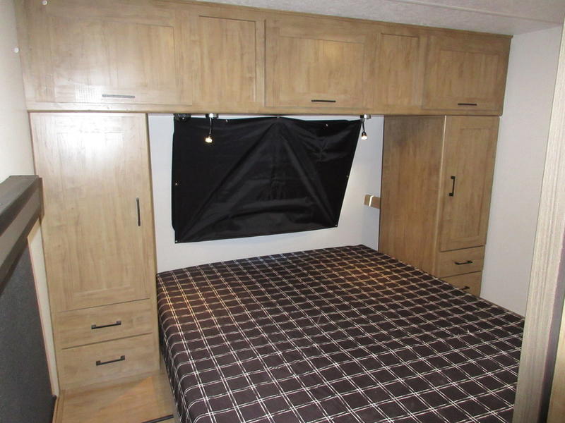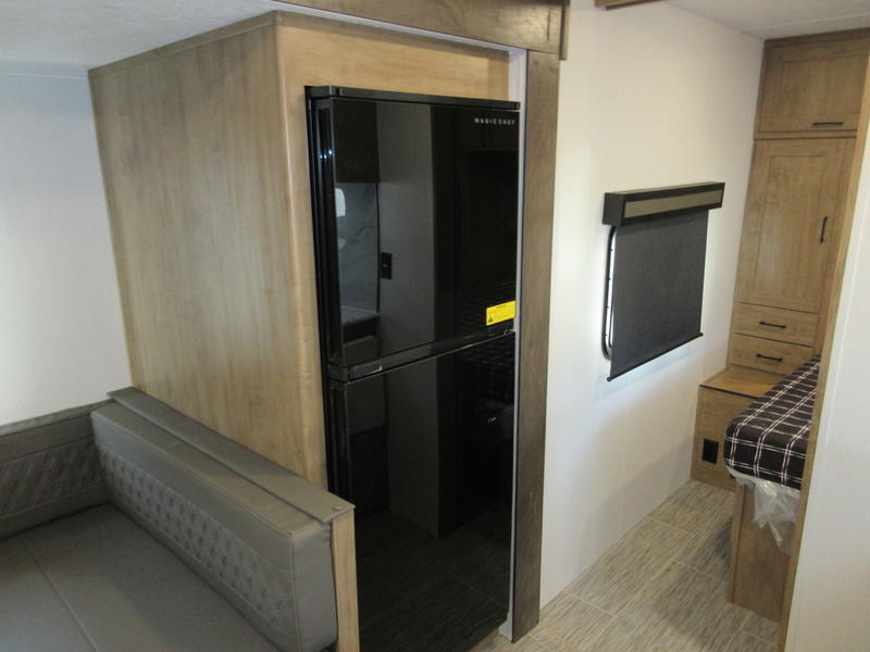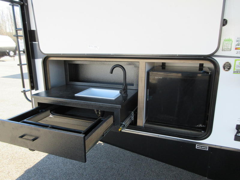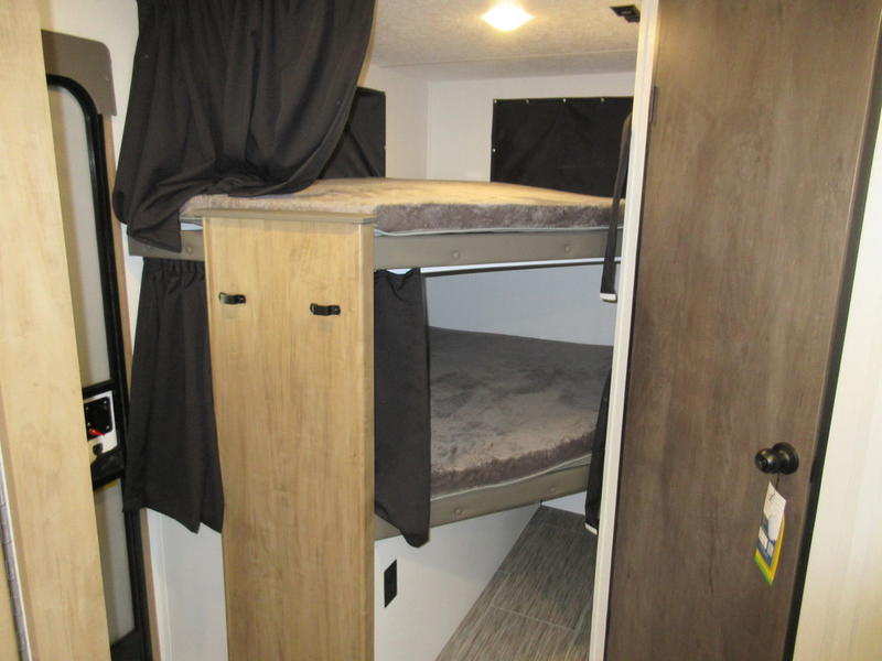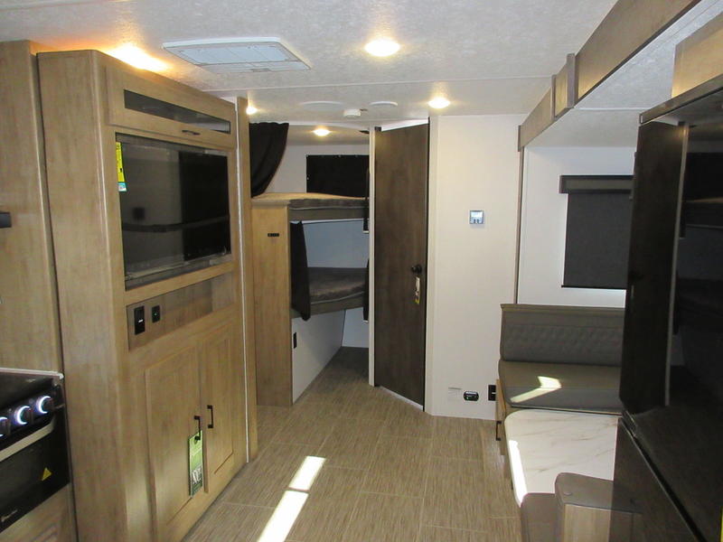 This is a great unit for a larger family to enjoy! With double-size bunks in the rear campside corner you can easily sleep seven or eight in this unit depending on size. A large slide offers ample space in the main living area and it features a u-dinette and refrigerator. Opposite the slide behind the Smart TV there is a huge hinged hidden storage pantry! You can easily cook both inside and out with all the appliances inside to create delicious home cooked meals, plus an outside camp kitchen and griddle so you can cook in the great outdoors on a beautiful day. A rear corner bath features a shower, toilet, and corner vanity with sink, plus medicine cabinet for your things. In front, a private master bedroom with queen bed including wardrobes and inset shelves along the side of the head of the bed, plus overhead storage as well.