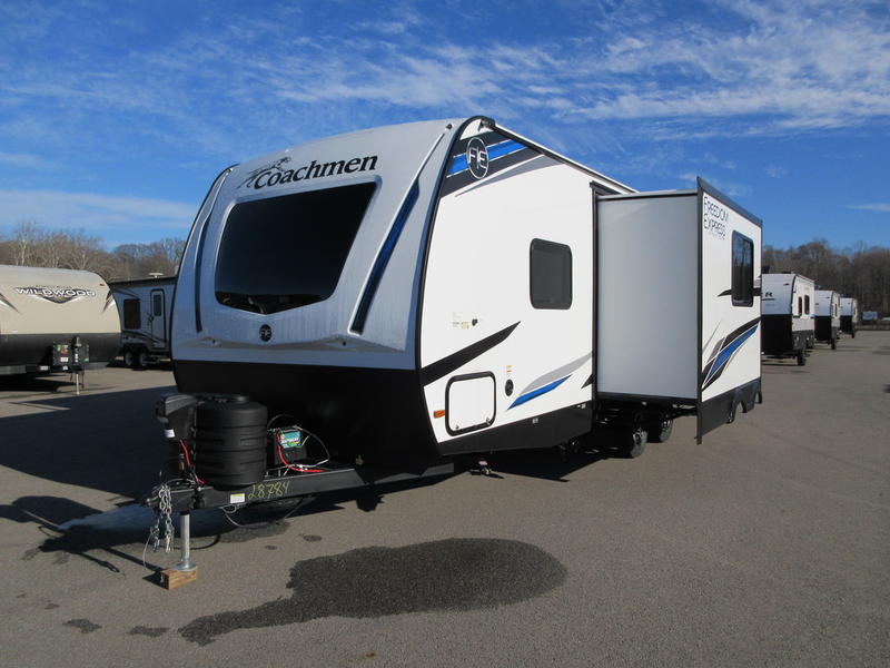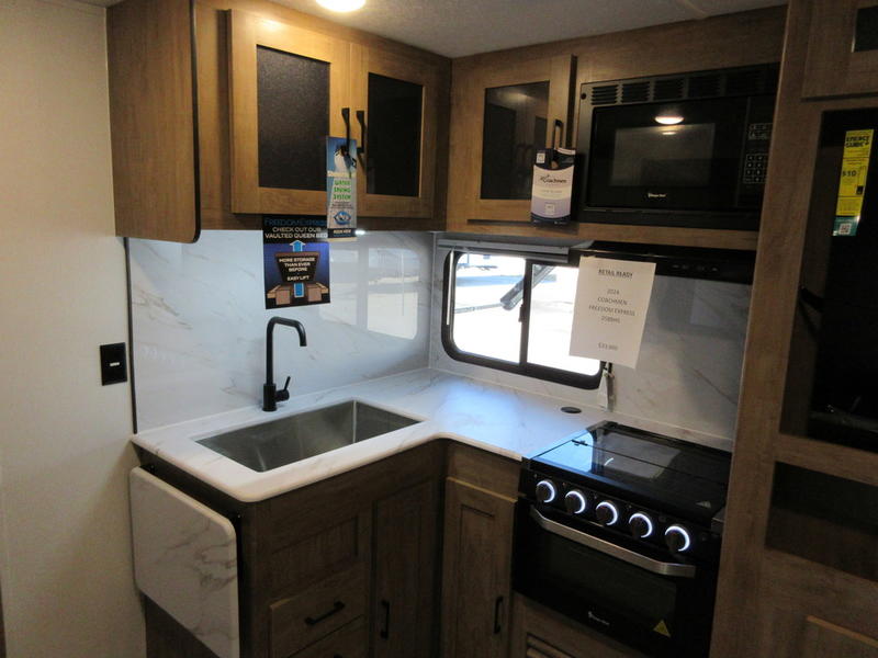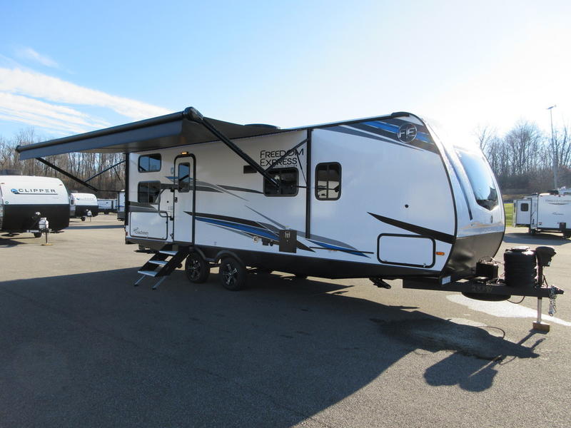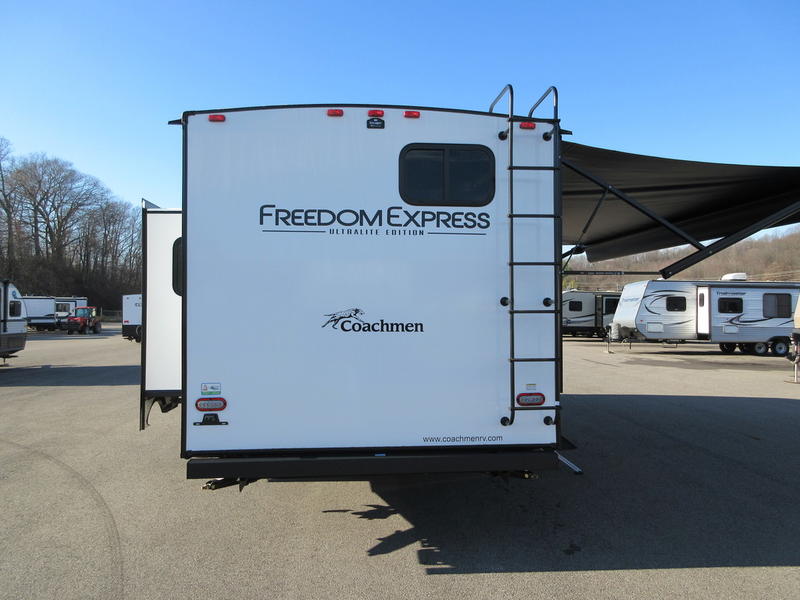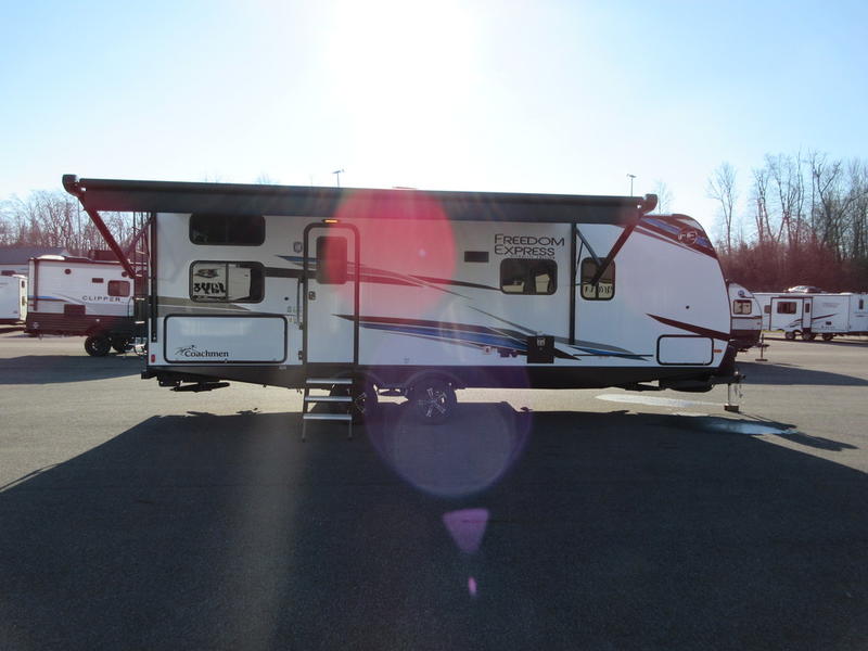 With any Freedom Express Ultra Lite travel trailer by Coachmen you will appreciate quality construction materials, such as vacuum bonded walls with Azdel composite, a 3/4 gel coated fiberglass cap with an automotive glass windshield, and a heated enclosed underbelly. Each model also features Tufflex PVC roofing, front rock guard, and E-Z Lube axles for smooth towing. Inside, you'll find kitchen backsplash, hidden hinge cabinetry, and wear-resistant vinyl flooring throughout. The power tongue jack included with the Ultra Lite Express Package will make set-up a breeze, and each model includes back-up camera prep and they are Freedom solar ready if you plan to go off-grid. Enjoy lightweight camping with a Freedom Express Ultra Lite travel trailer today!