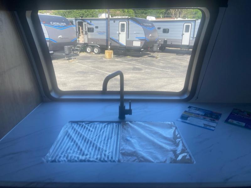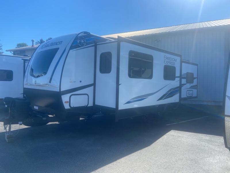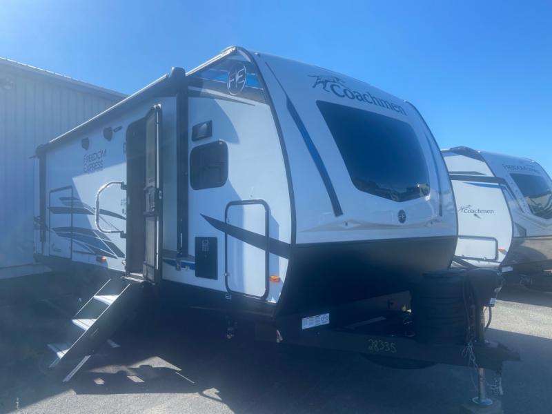 With any Freedom Express Ultra Lite travel trailer by Coachmen you will appreciate quality construction materials, such as vacuum bonded walls with Azdel composite, a 3/4 gel coated fiberglass cap with an automotive glass windshield, and a heated enclosed underbelly. Each model also features Tufflex PVC roofing, front rock guard, and E-Z Lube axles for smooth towing. Inside, you'll find kitchen backsplash, hidden hinge cabinetry, and wear-resistant vinyl flooring throughout. The power tongue jack included with the Ultra Lite Express Package will make set-up a breeze, and each model includes back-up camera prep and they are Freedom solar ready if you plan to go off-grid. Enjoy lightweight camping with a Freedom Express Ultra Lite travel trailer today!