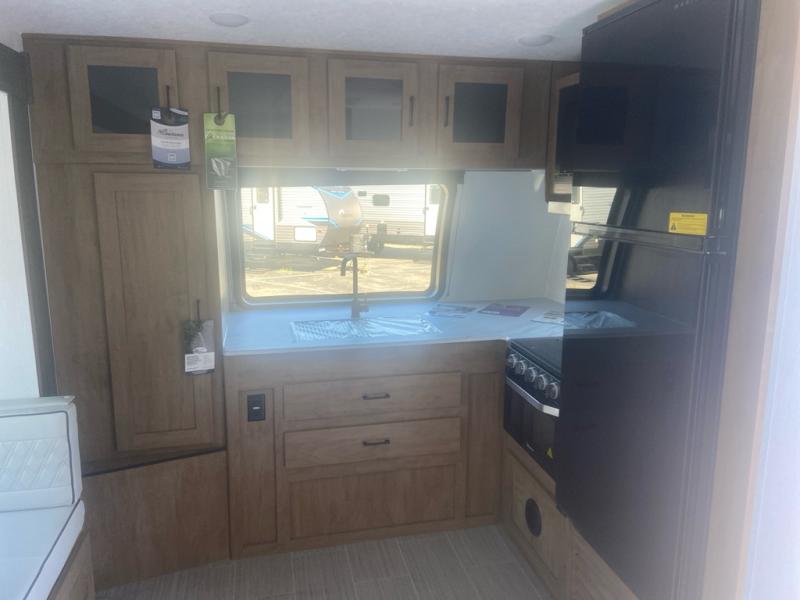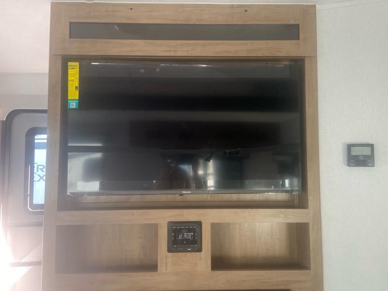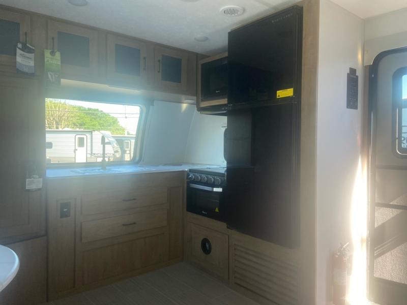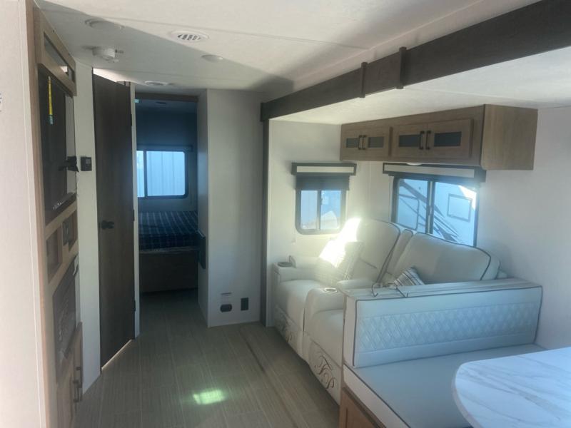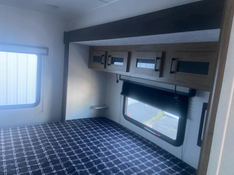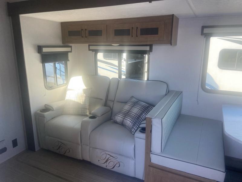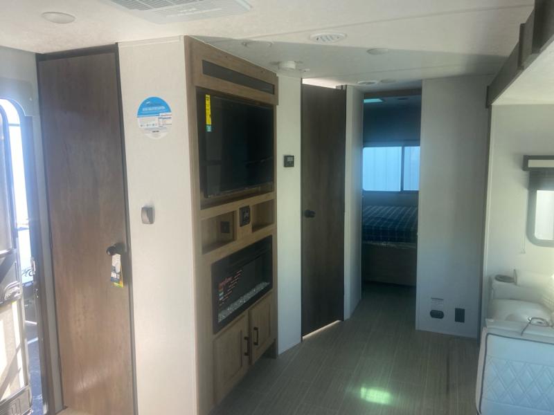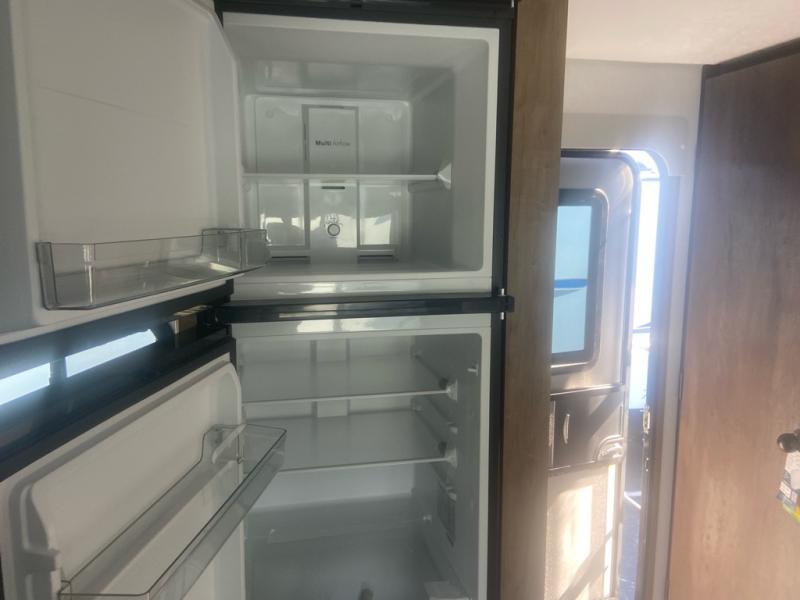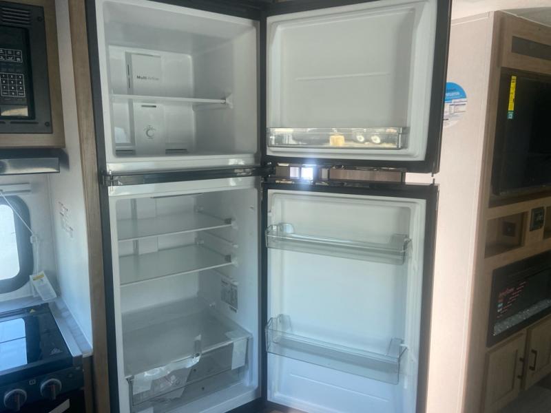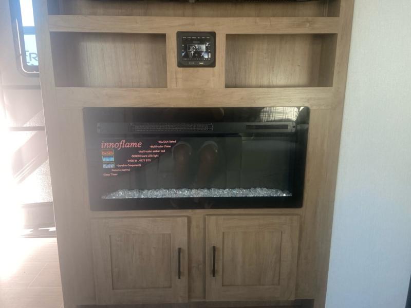 Comfort comes easy in this front kitchen travel trailer for four! You will love the rear master bedroom with its king bed slide out, spacious wardrobe, and a private entrance into the dual entry bath. There is a sofa that sits directly across from the fireplace and entertainment center, or you can choose the optional theater seat or optional hide-a-bed sofa in place of the standard sofa. The front kitchen features tons of counter space, an 8 cu. ft. double door refrigerator, plus a large pantry for dry good and snacks. There is also a pantry/closet just as you enter the trailer that will be perfect for shoes and jackets!
