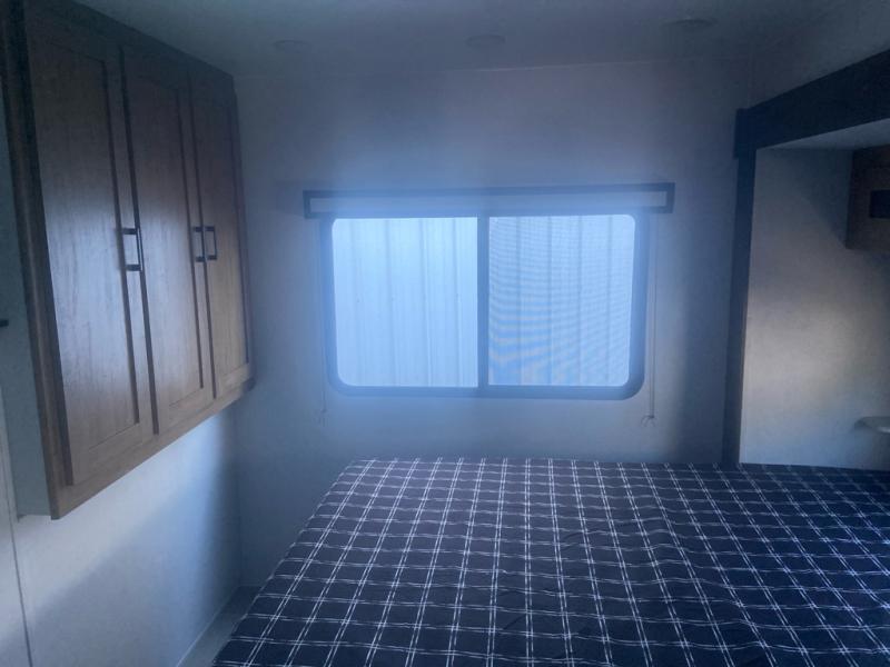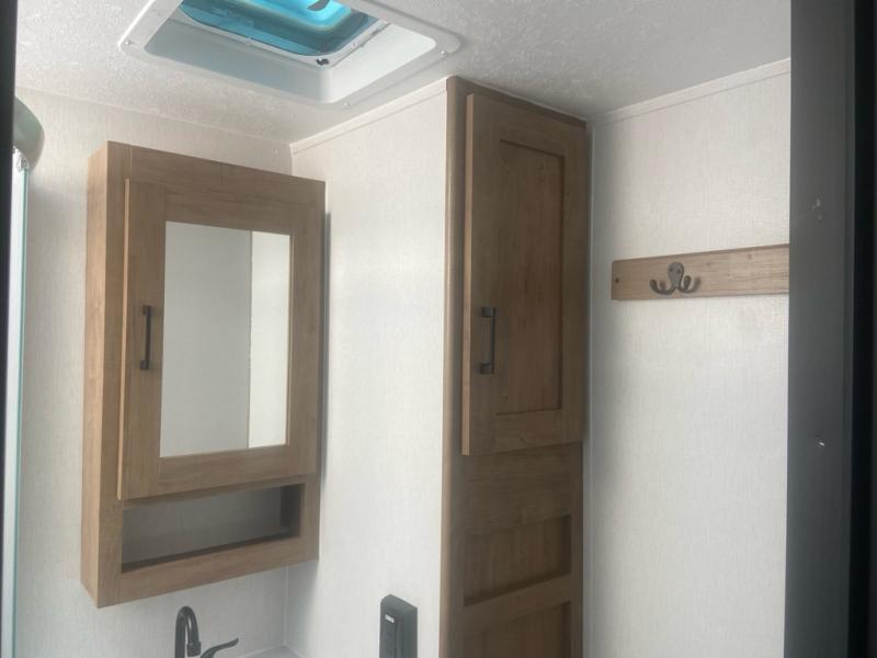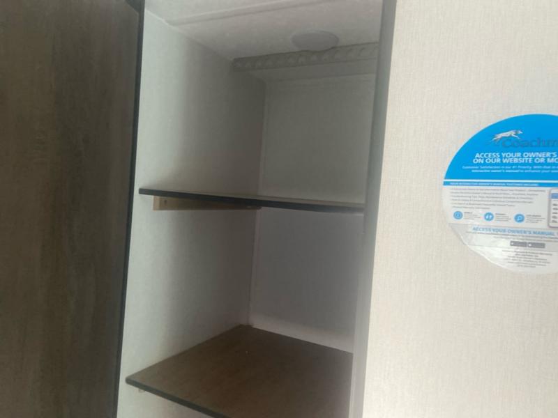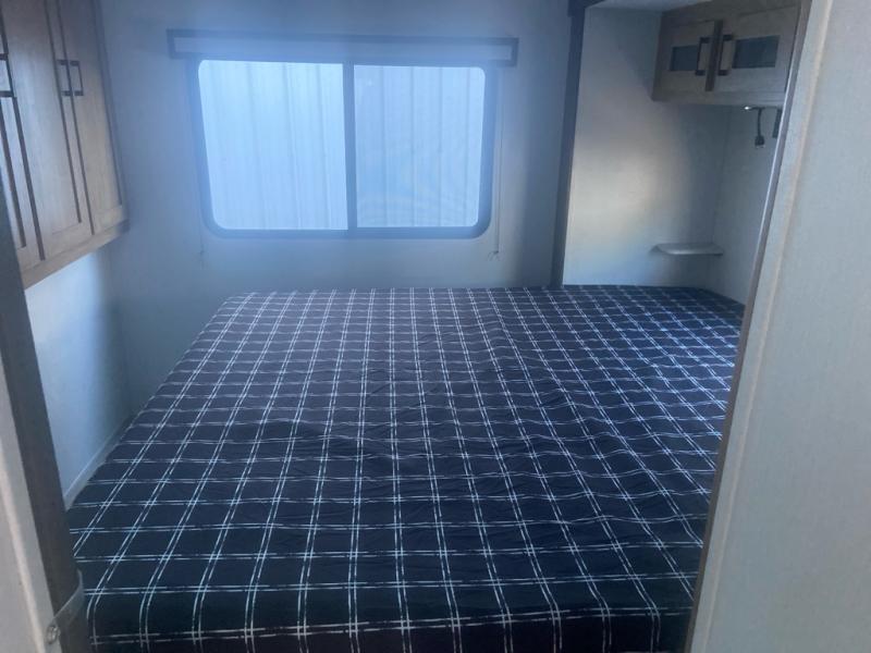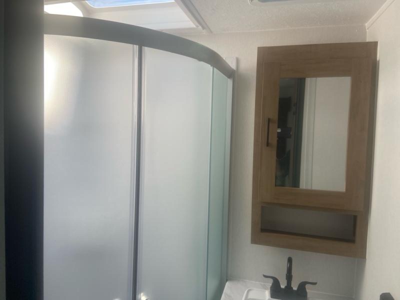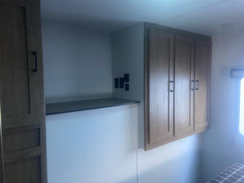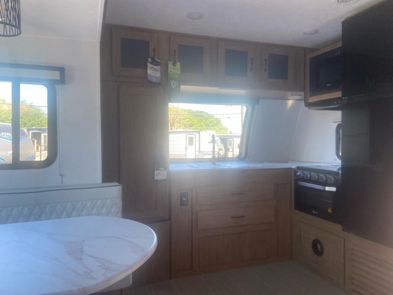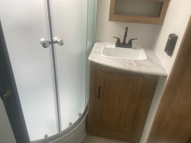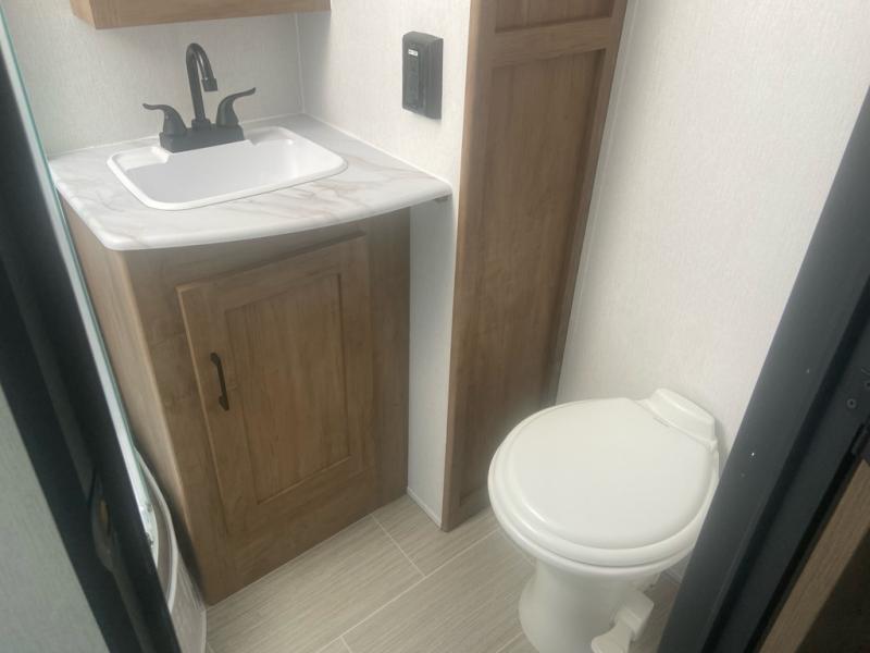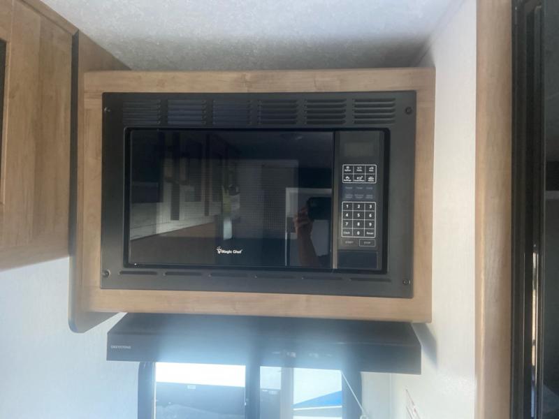 Comfort comes easy in this front kitchen travel trailer for four! You will love the rear master bedroom with its king bed slide out, spacious wardrobe, and a private entrance into the dual entry bath. There is a sofa that sits directly across from the fireplace and entertainment center, or you can choose the optional theater seat or optional hide-a-bed sofa in place of the standard sofa. The front kitchen features tons of counter space, an 8 cu. ft. double door refrigerator, plus a large pantry for dry good and snacks. There is also a pantry/closet just as you enter the trailer that will be perfect for shoes and jackets!
