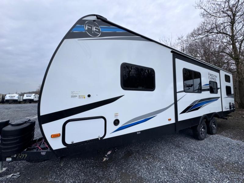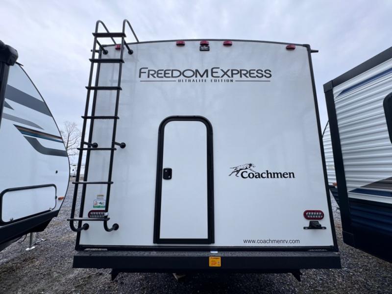 With any Freedom Express Ultra Lite travel trailer by Coachmen you will appreciate quality construction materials, such as vacuum bonded walls with Azdel composite, a 3/4 gel coated fiberglass cap with an automotive glass windshield, and a heated enclosed underbelly. Each model also features Tufflex PVC roofing, front rock guard, and E-Z Lube axles for smooth towing. Inside, you'll find kitchen backsplash, hidden hinge cabinetry, and wear-resistant vinyl flooring throughout. The power tongue jack included with the Ultra Lite Express Pack will make set-up a breeze, and each model includes back-up camera prep and they are Freedom solar ready if you plan to go off-grid. Enjoy lightweight camping with a Freedom Express Ultra Lite travel trailer today!