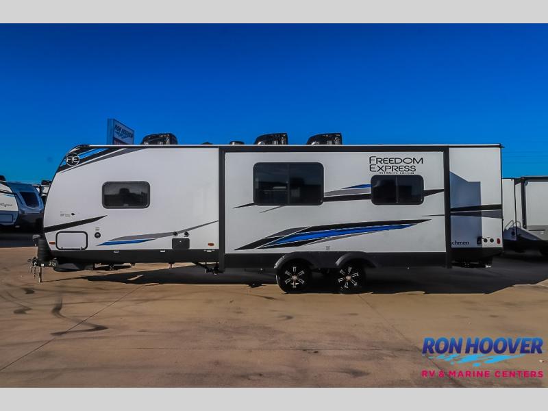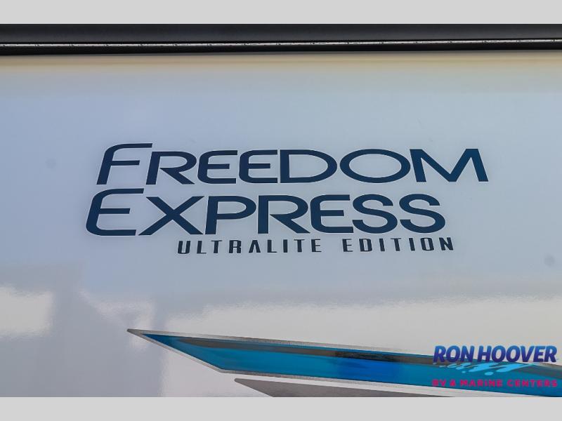 With any Freedom Express Ultra Lite travel trailer by Coachmen you will appreciate quality construction materials, such as vacuum bonded walls with Azdel composite, a 3/4 gel coated fiberglass cap with an automotive glass windshield, and a heated enclosed underbelly. Each model also features Tufflex PVC roofing, front diamond plate, and E-Z Lube axles for smooth towing. You'll find Carefree flooring indoors, as well as night shades, a dual basin American stonecast sink, and hidden hinge cabinetry. The power tongue jack included with the Ultra Lite Express Pack will make set-up a breeze, and each model includes back-up camera prep and they are Freedom solar ready if you plan to go off-grid. Enjoy lightweight camping with a Freedom Express Ultra Lite travel trailer today!