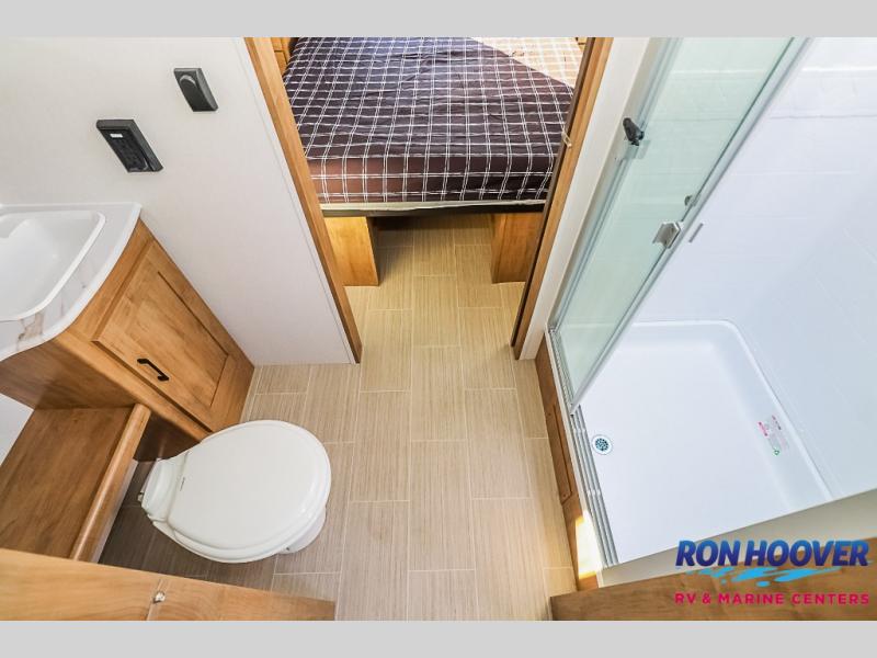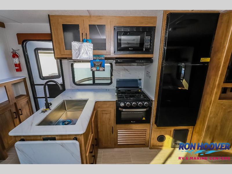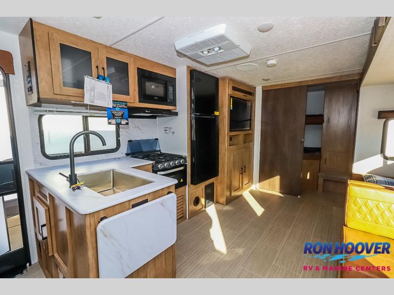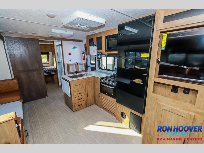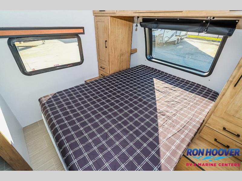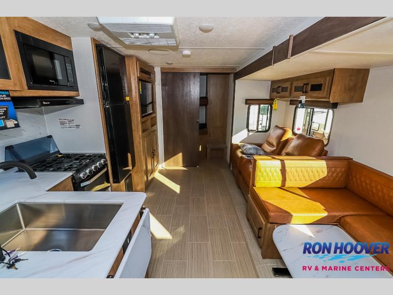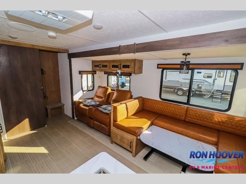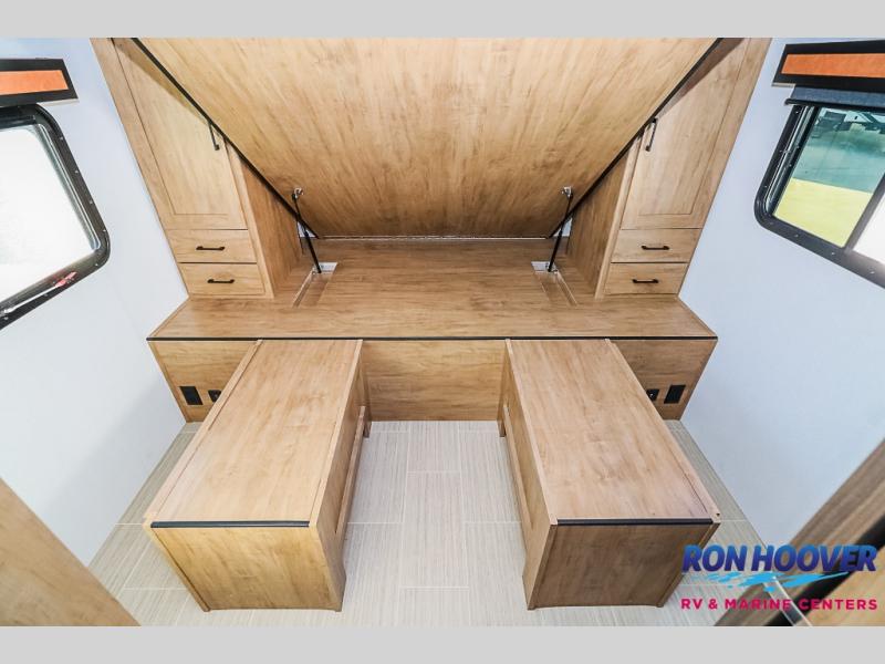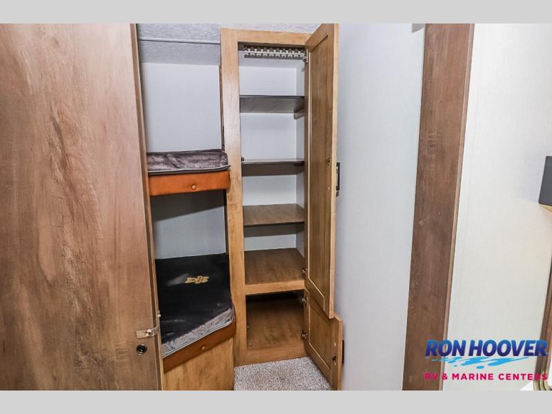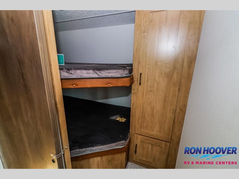 You can't go wrong with this spacious travel trailer in tow! When you arrive at the campground, prepare a quick lunch on the pull-out camp kitchen and set up the 20' power awning with LED lights. You can grab the fishing poles from the pass-through storage and head down to the lake. The walk-through bath will allow you to freshen up before dinner, and you may even want to start a game of cards at the U-shaped dinette. This model includes a simple private bunkhouse with double-size bunks, a wardrobe, and a step leading up to the top bunk, and the front master bedroom will be perfect for you and your spouse. Here, you'll find a queen bed with vaulted under-bed storage and dual wardrobes for your tablet and phone.