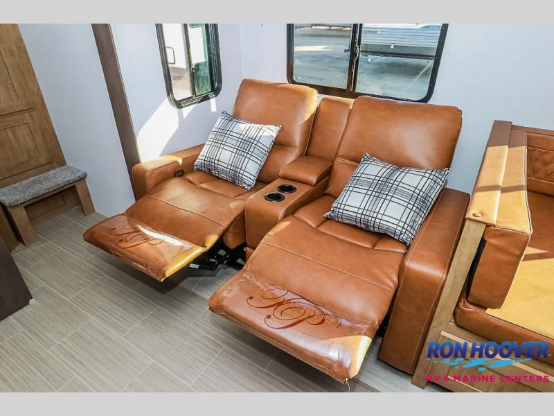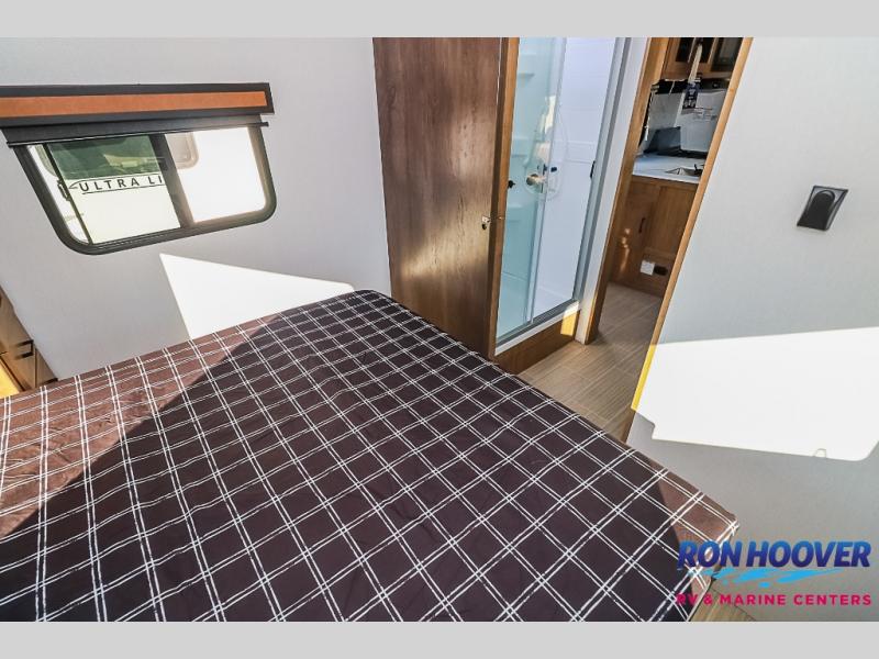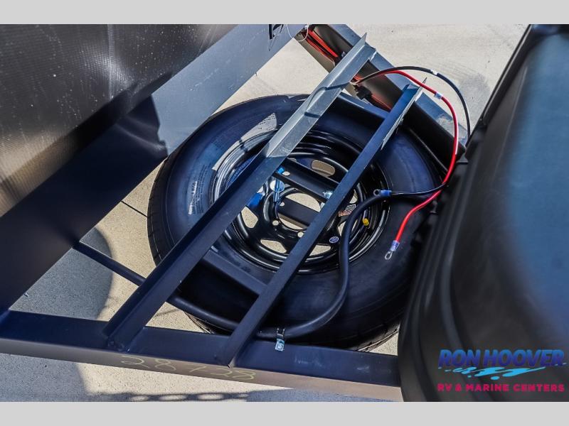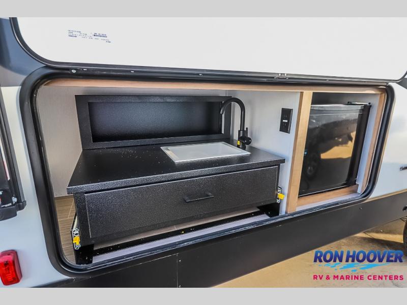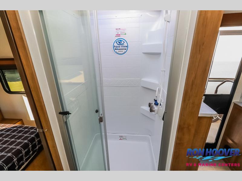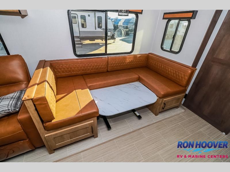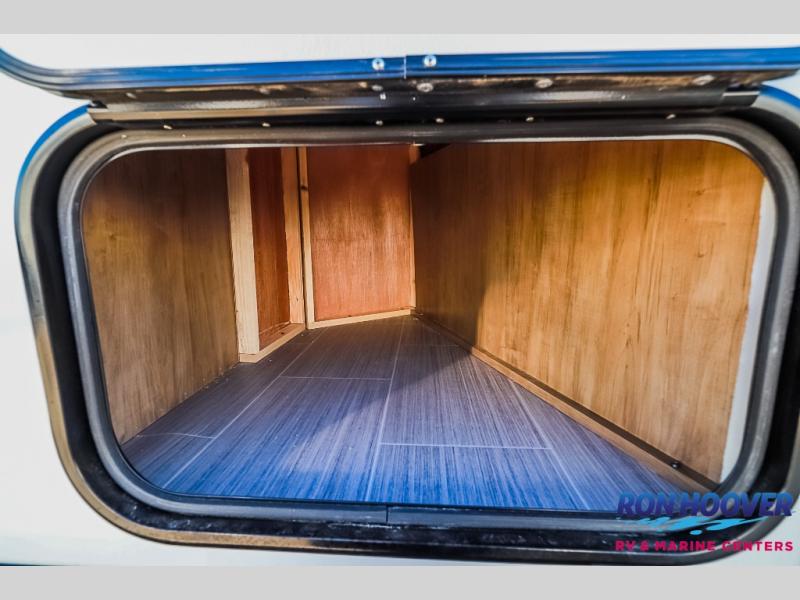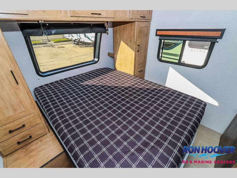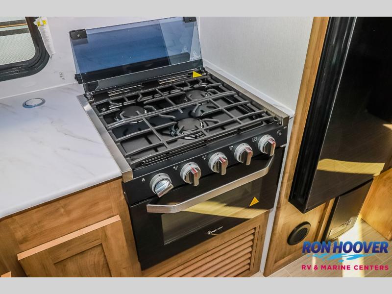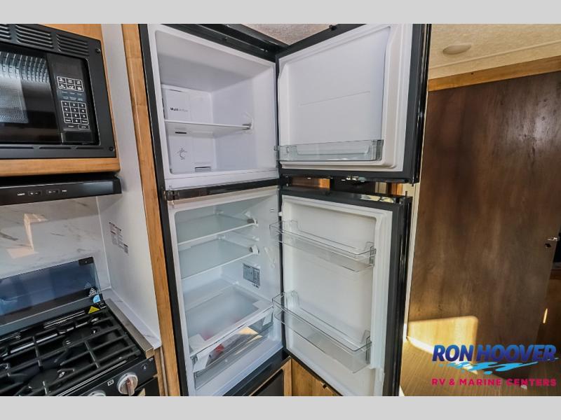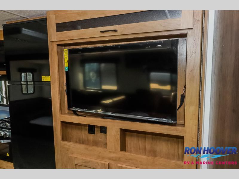 You can't go wrong with this spacious travel trailer in tow! When you arrive at the campground, prepare a quick lunch on the pull-out camp kitchen and set up the 20' power awning with LED lights. You can grab the fishing poles from the pass-through storage and head down to the lake. The walk-through bath will allow you to freshen up before dinner, and you may even want to start a game of cards at the U-shaped dinette. This model includes a simple private bunkhouse with double-size bunks, a wardrobe, and a step leading up to the top bunk, and the front master bedroom will be perfect for you and your spouse. Here, you'll find a queen bed with vaulted under-bed storage and dual wardrobes for your tablet and phone.
