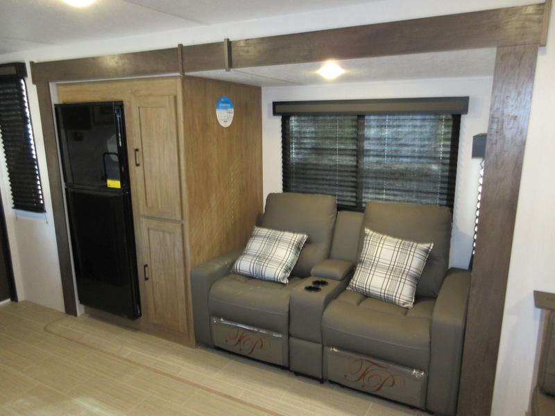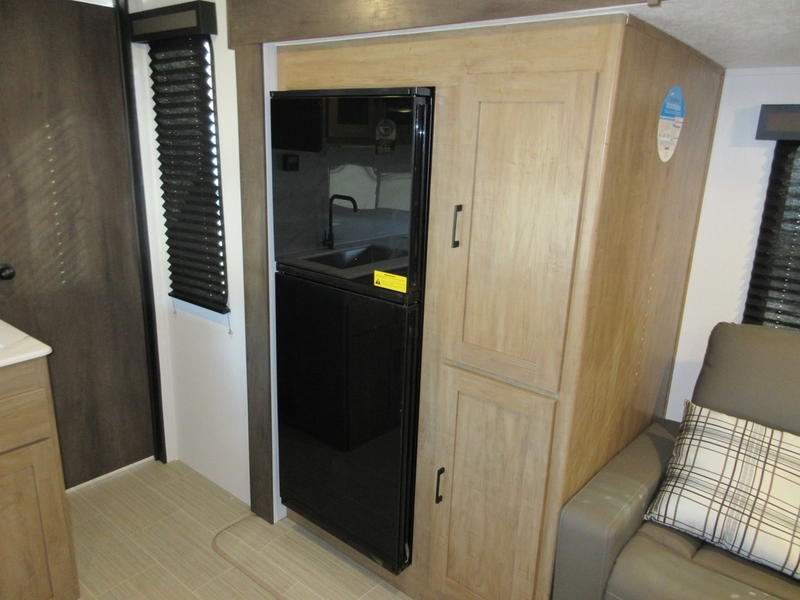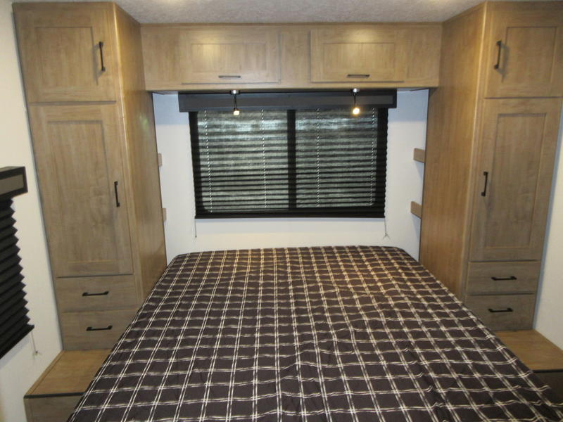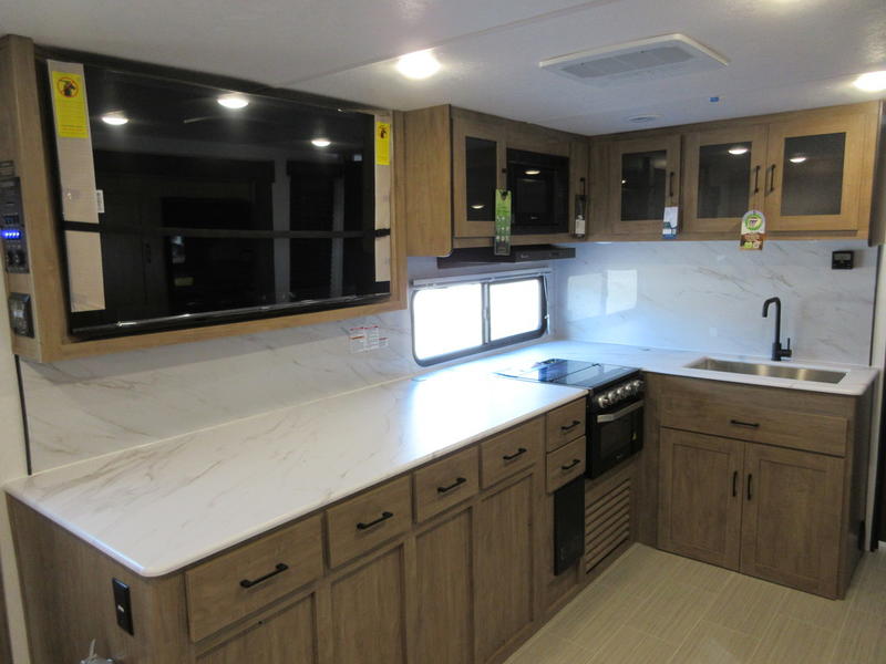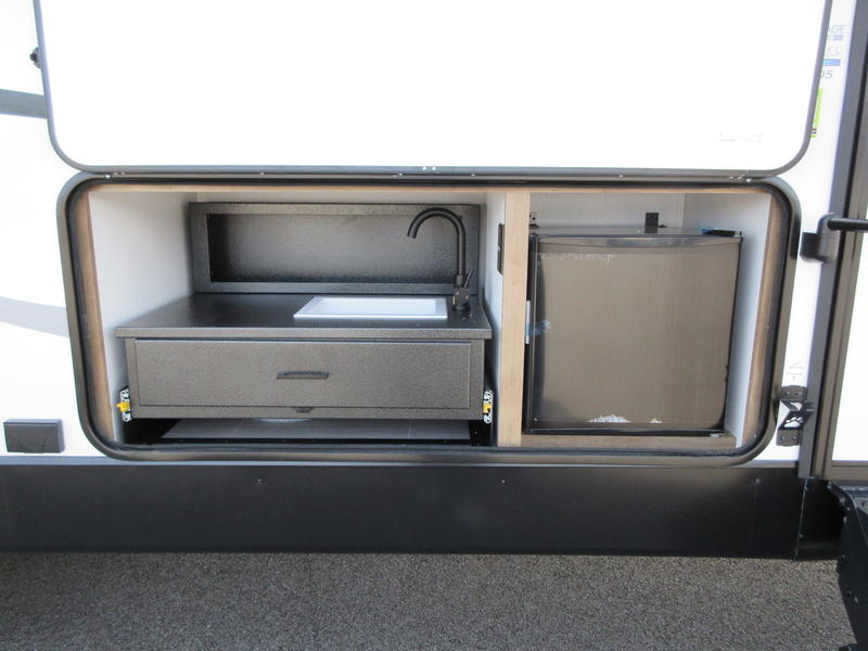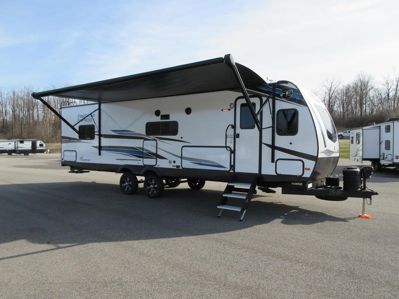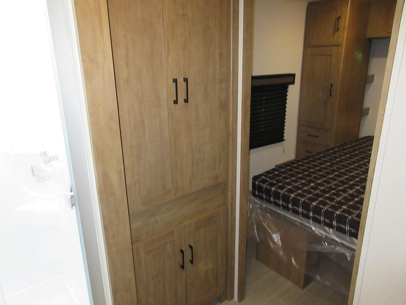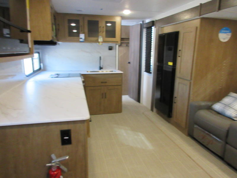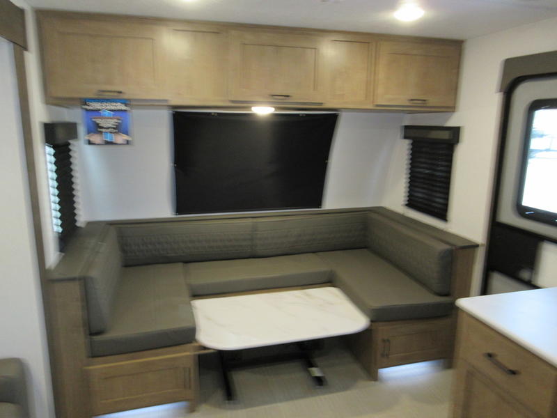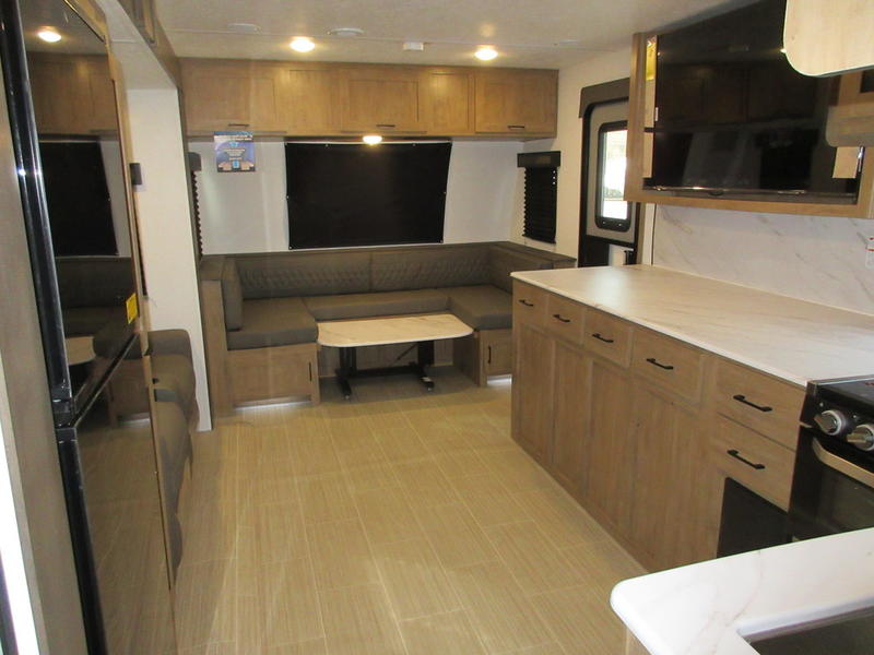 Looking for plenty of storage space in a towable? This Freedom Express Ultra Lite offers you a plenty of it, both inside and out. You will appreciate the spacious combined kitchen and living area featuring a large slide opposite the entry door. Here is where you will enjoy theater seating and your refrigerator and storage. The very front houses a huge 8' U-dinette for meals and game time, and can also serve as extra sleeping space once converted. Opposite the slide above the huge counter with plenty of storage beneath, a flat screen Smart TV. Beyond the kitchen area a spacious walk-through bath that offers space just like at home. There is even a wardrobe that has been prepped for a washer and dryer if you choose to add. A sliding door leads into the rear private master bedroom featuring a queen bed with dual bedside wardrobes and inset bedside shelves, vaulted underbed storage for your things.