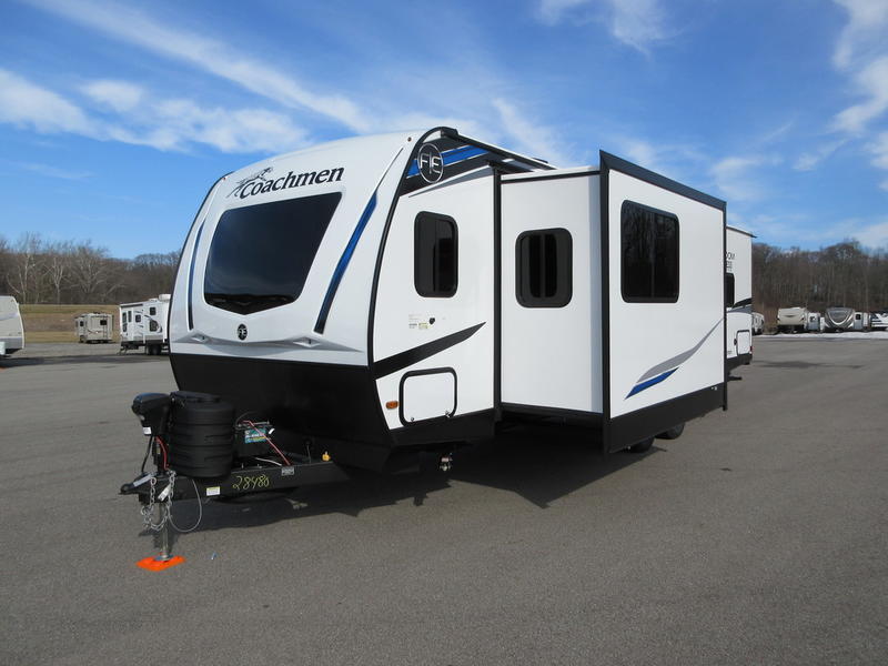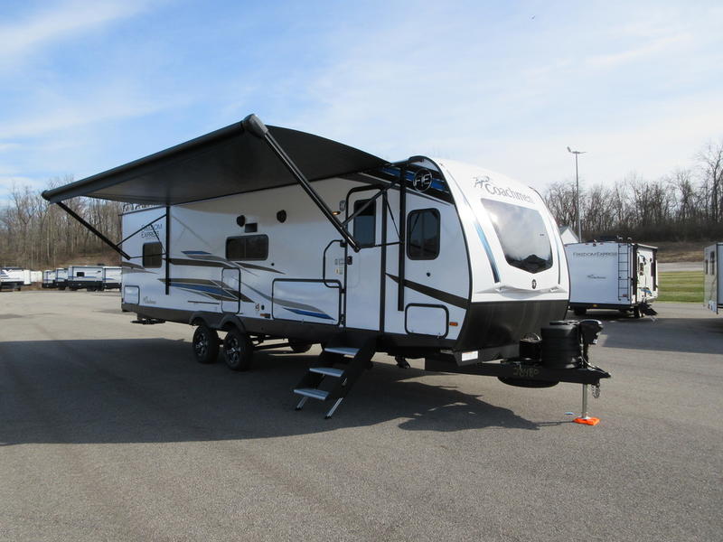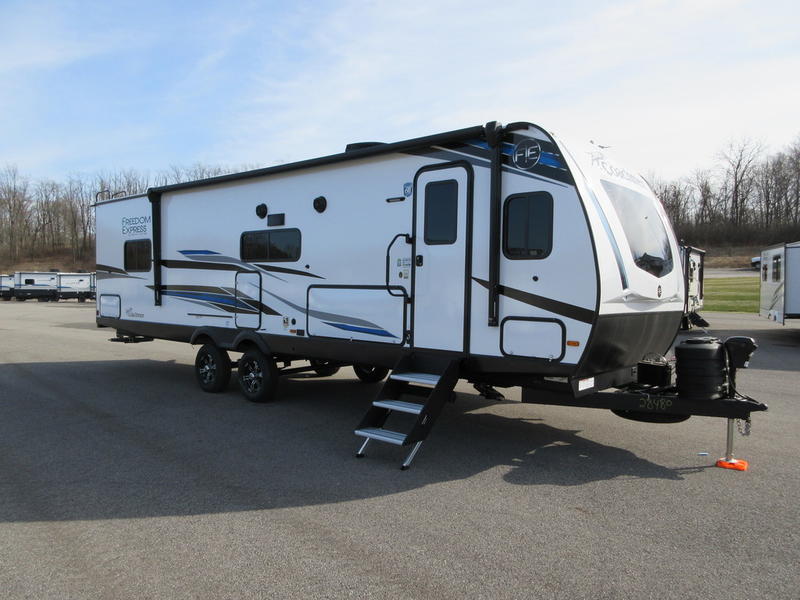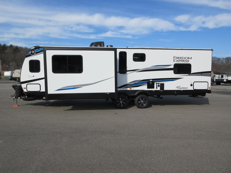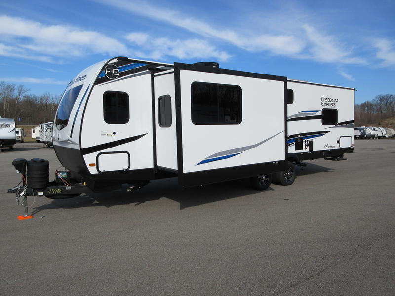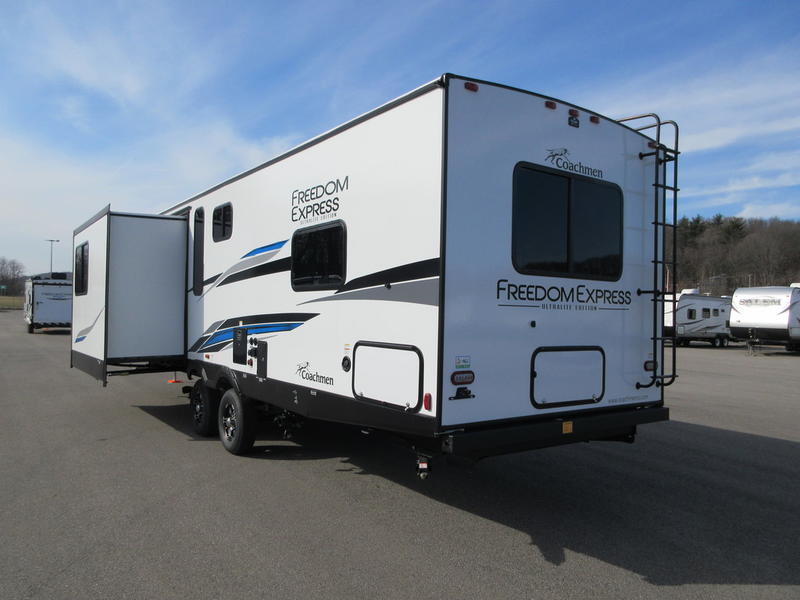 With any Freedom Express Ultra Lite travel trailer by Coachmen you will appreciate quality construction materials, such as vacuum bonded walls with Azdel composite, a 3/4 gel coated fiberglass cap with an automotive glass windshield, and a heated enclosed underbelly. Each model also features Tufflex PVC roofing, front rock guard, and E-Z Lube axles for smooth towing. Inside, you'll find kitchen backsplash, hidden hinge cabinetry, and wear-resistant vinyl flooring throughout. The power tongue jack included with the Ultra Lite Express Pack will make set-up a breeze, and each model includes back-up camera prep and they are Freedom solar ready if you plan to go off-grid. Enjoy lightweight camping with a Freedom Express Ultra Lite travel trailer today!