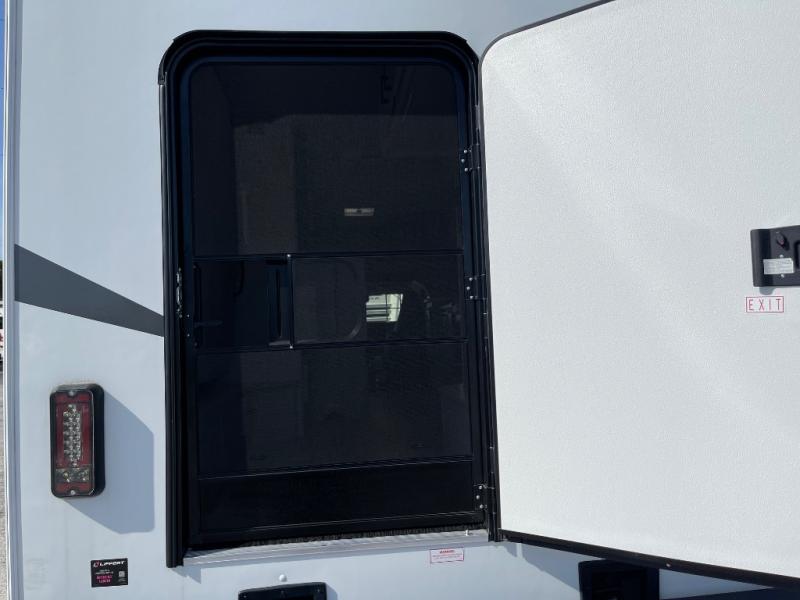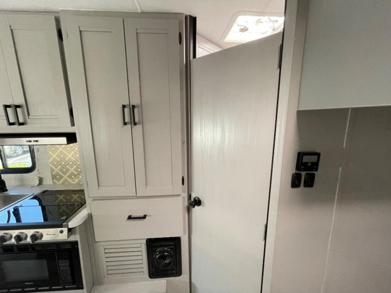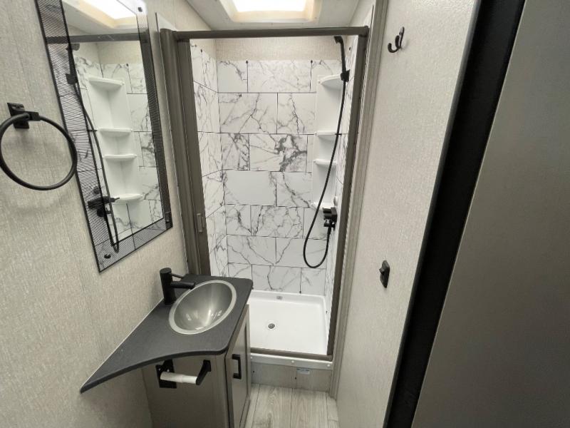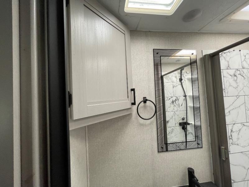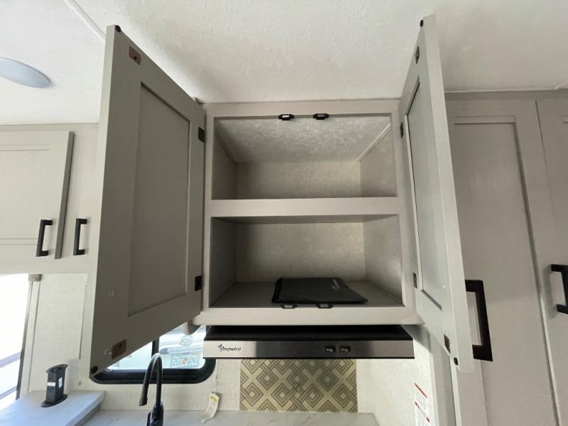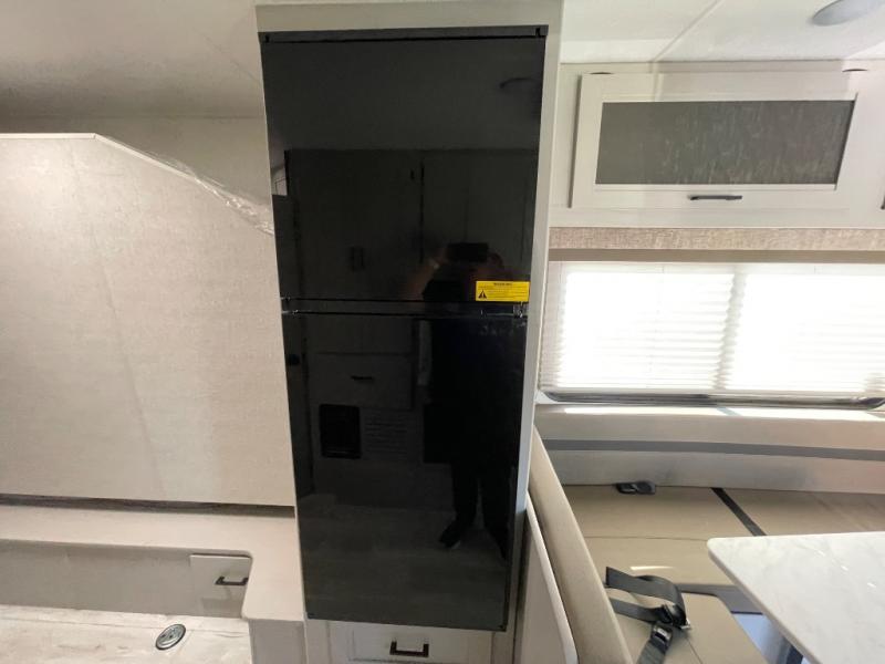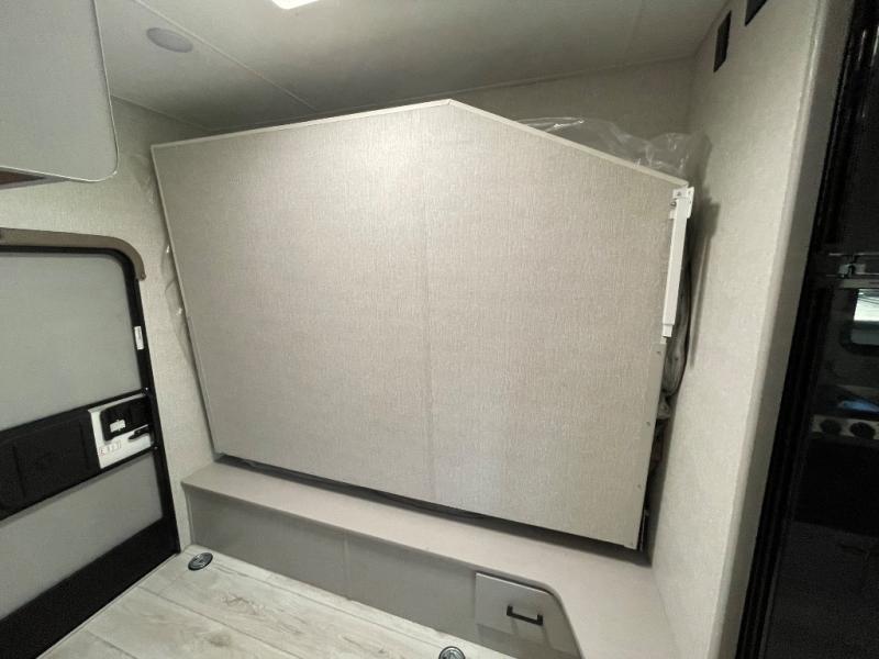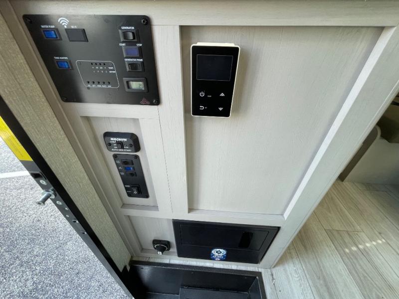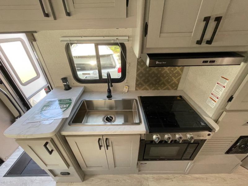This versatile motorhome features a multi-function bedroom/cargo bay area with a Murphy queen bed which can be stowed away during the day and plenty of overhead cabinets and drawers to store your things. More sleeping space can be found in the bunk area over the cab. The dining area has a spacious 44” x 76” J-lounge with pullout extension for extra room to stretch out. The kitchen has Appalachian Maple cabinetry with hardwood cabinet doors and drawer fronts, plus one-piece thermofoil countertops for a stylish look that’s easy to clean. Enjoy cooking with the three-burner cooktop, residential size microwave oven, and stainless steel farmer's kitchen sink with high-rise kitchen faucet.