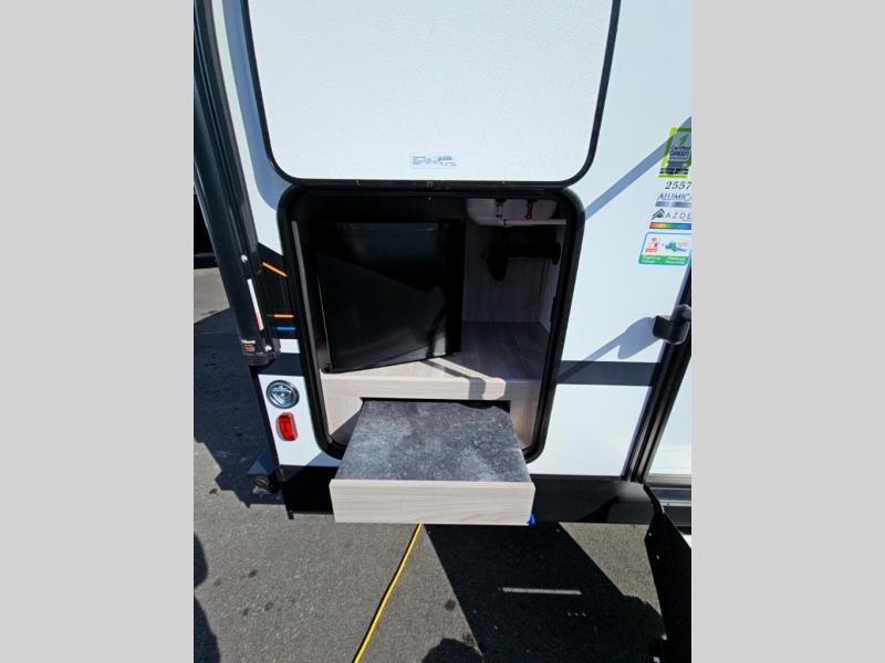 Looking for plenty of storage in your next RV? This trailer has a hidden swing-out pantry behind the entertainment center, a closet, overhead cabinets and a pet center for your dog's food and water. You will also find storage in the front bedroom that includes a space savings sliding door for privacy, MAX bed storage underneath with drawers and places for your shoes, plus you will have wardrobes for hanging clothes and nightstands for your cellphone and keys. The rear full bathroom is spacious and includes overhead cabinets, a counter for toiletries and a shower. The cook will love the L-shaped kitchen corner with everything nearby to whip up meals, plus there is a flip-up counter extension. And don't forget about the outside kitchen, the power awning, and the pass-through compartment.