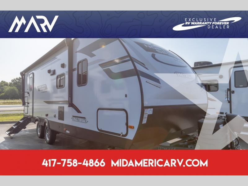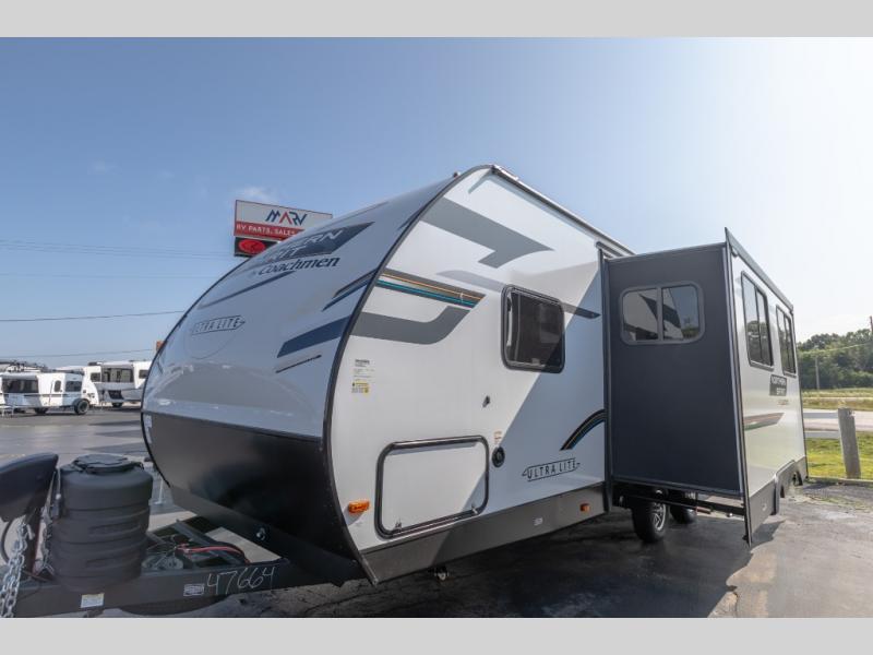 With any Northern Spirit Ultra Lite travel trailer by Coachmen, the "Twice Cool" dual ducted air conditioning system, the motion activated floor lights in the bedroom and bathroom, the lighted USB ports, the digital level, and the motion activated pass-through storage light plus fishing pole storage, will make your camping experience simplified. The heated and enclosed underbelly provides protection on the road and allows you to camp during any season, the 200W solar panel with 30 amp controller provides off-grid camping, and the power tongue jack makes setup easier. Each is built with a 3/4 painted fiberglass front cap with LED strip lights, a laminated, aluminum framed floor, rear wall, and sidewalls, plus 5" trusses with an interior vault. Make your decision today, and camp with everything in its place!