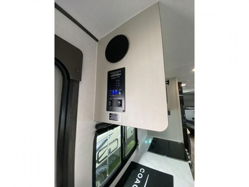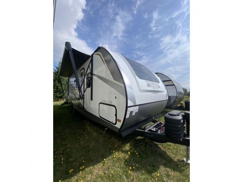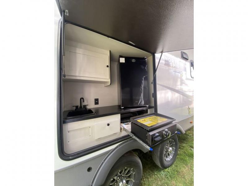 With any Northern Spirit Ultra Lite travel trailer by Coachmen, the "Twice Cool" dual ducted air conditioning system, the motion activated floor lights in the bedroom and bathroom, the lighted USB ports, the digital level, and the motion activated pass-through storage light plus fishing pole storage, will make your camping experience simplified. The heated and enclosed underbelly provides protection on the road and allows you to camp during any season, the 200W solar panel with 30 amp controller provides off-grid camping, and the power tongue jack makes setup easier. Each is built with a 3/4 painted fiberglass front cap with LED strip lights, a laminated, aluminum framed floor, rear wall, and sidewalls, plus 5" trusses with an interior vault. Make your decision today, and camp with everything in its place!