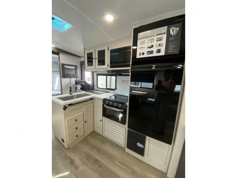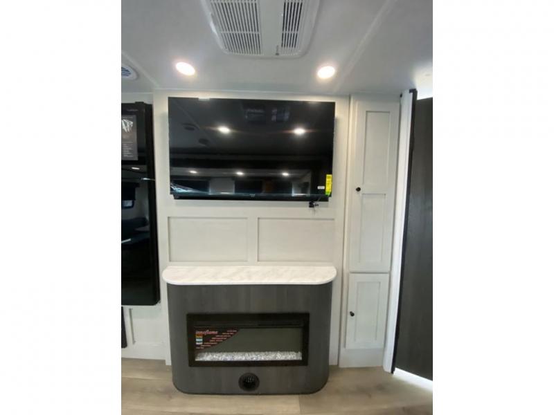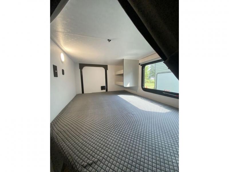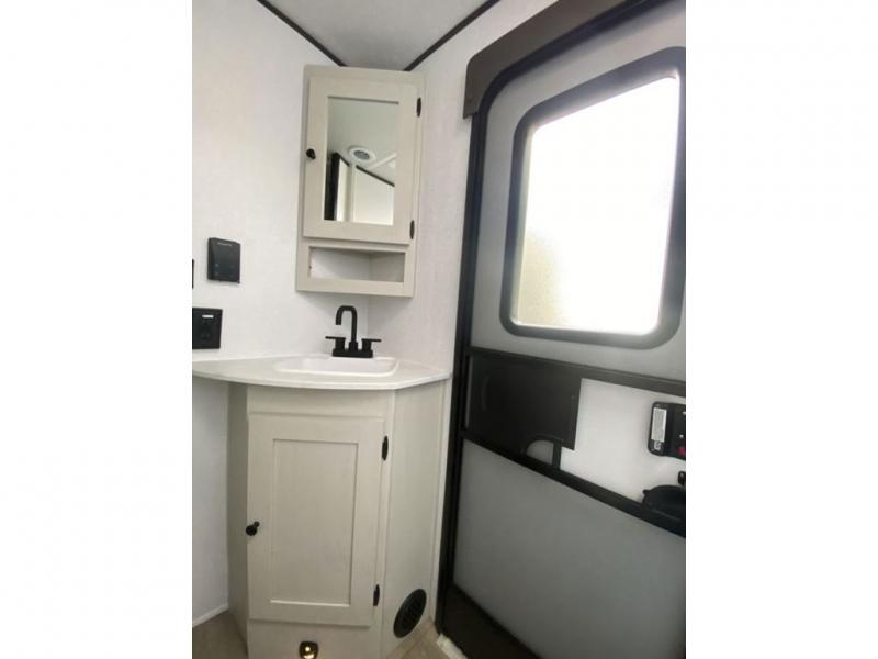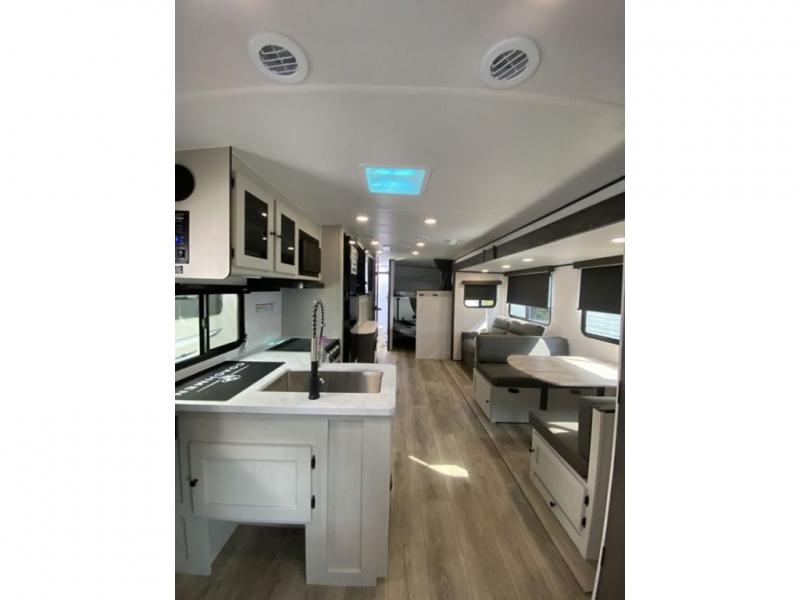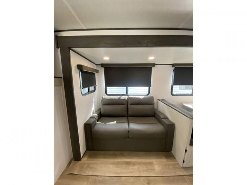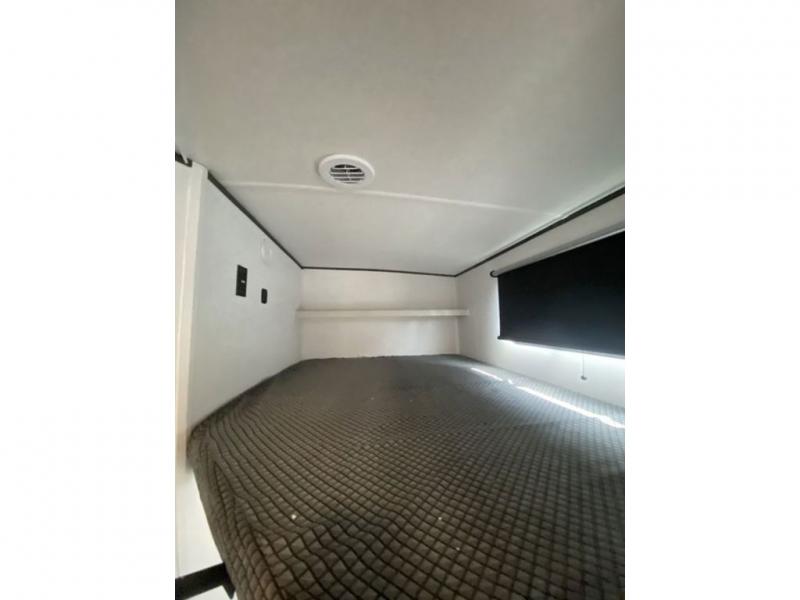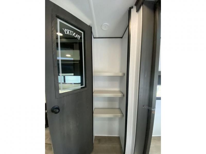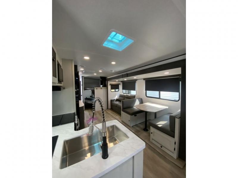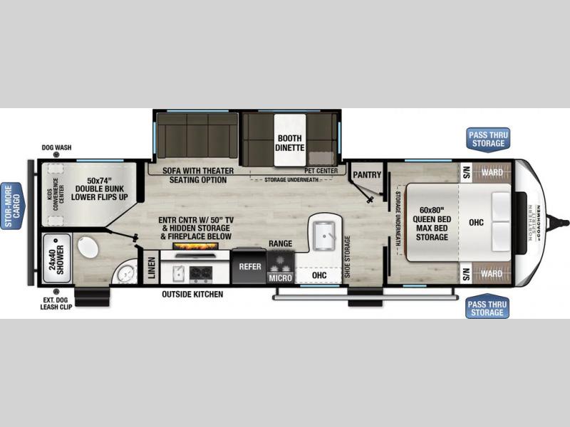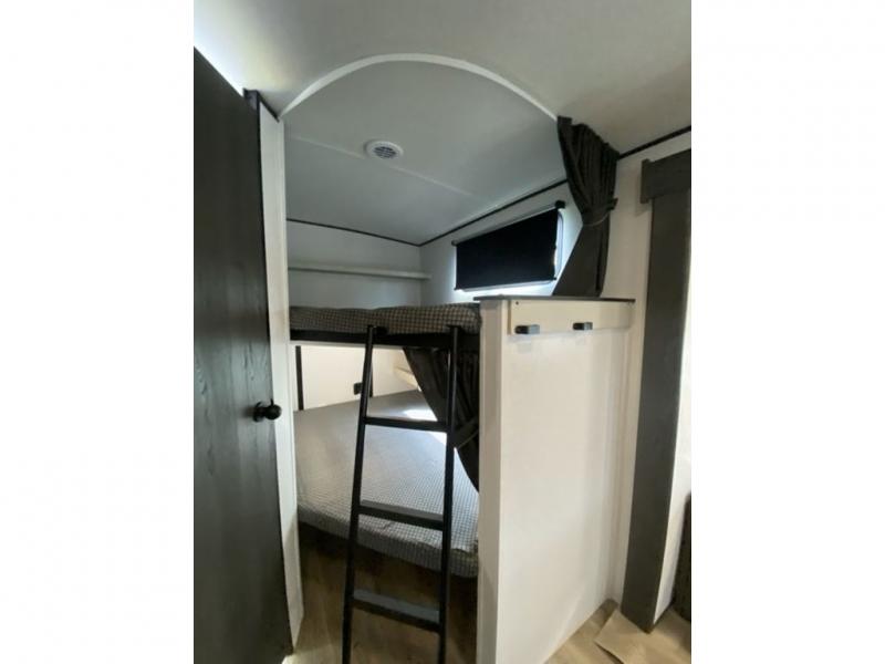 This is a popular bunk trailer for a larger family thanks to having the convenience of dual entry doors allowing access to the main living and kitchen area and near the front bedroom, and into the full bathroom for a quick in and out when playing outside. The bathroom also includes a hamper for convenience. The Stor-More cargo door allows you to place items from the exterior to the interior under the lower flip bunk for safe travels to your destinations and back home. The kids will surely love the convenience centers when playing or sleeping in a bunk. There is a sofa and U-shaped slide including a pet center for relaxing and feeding your pet. The kitchen includes full amenities plus a pantry to store lots of goodies for everyone. Along the exterior, the outside camp kitchen will come in handy when you have everyone at the campsite for dinner and the power awning offers some protection from the elements.