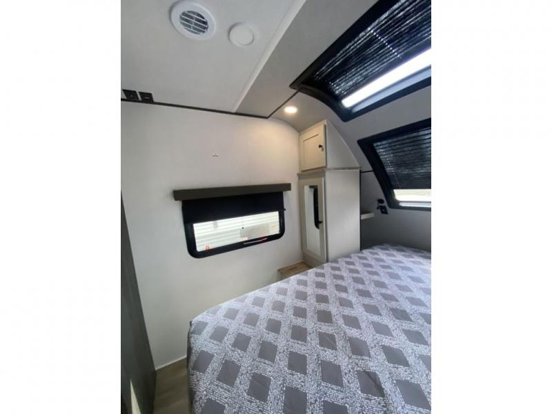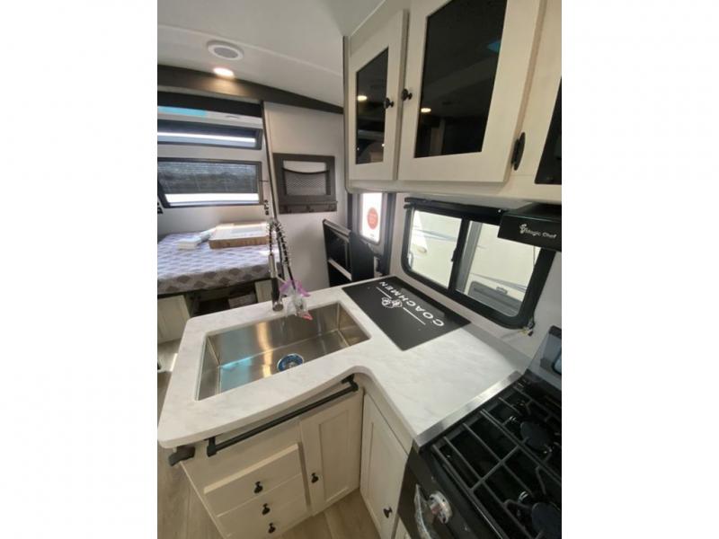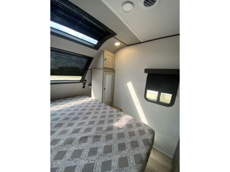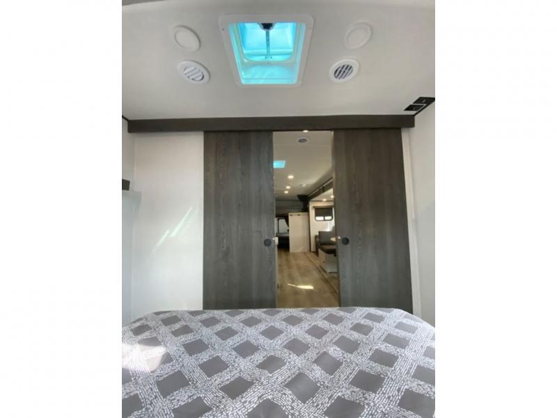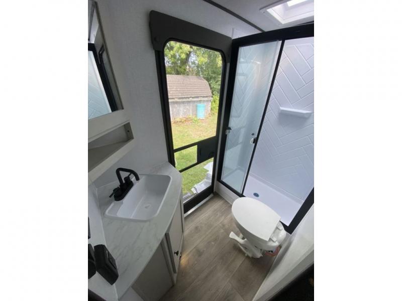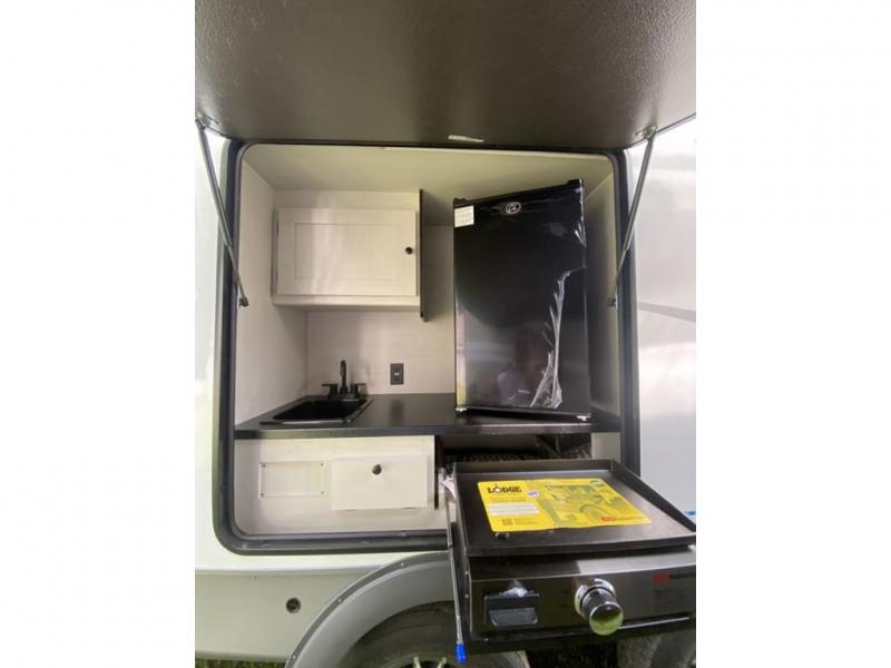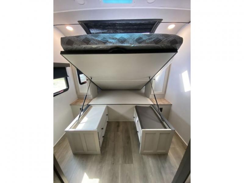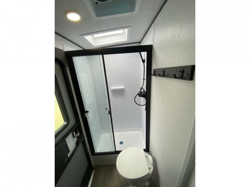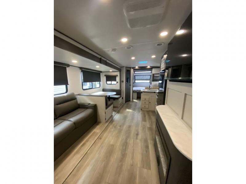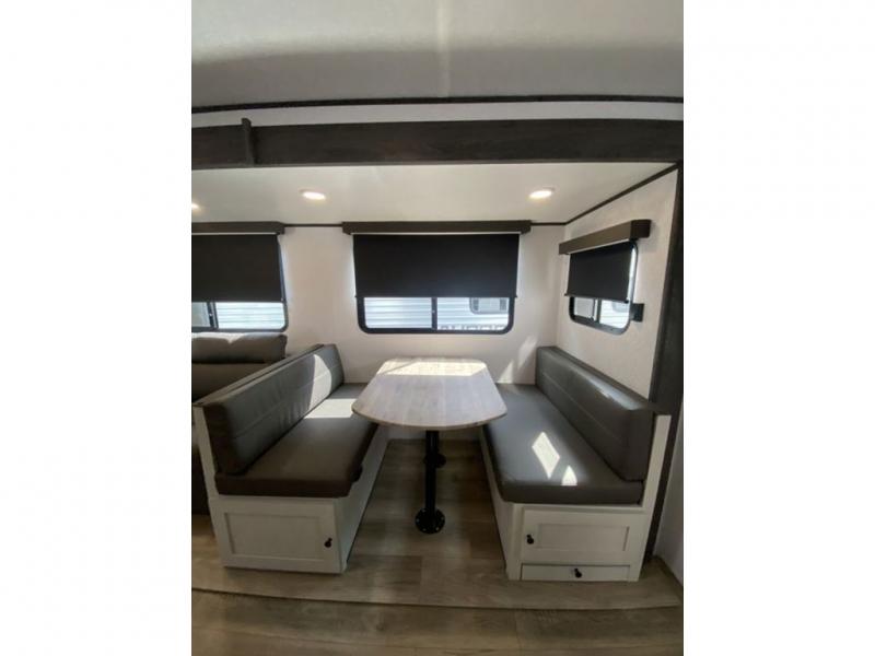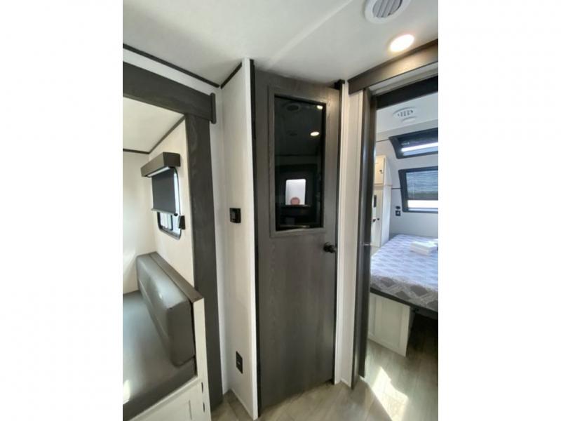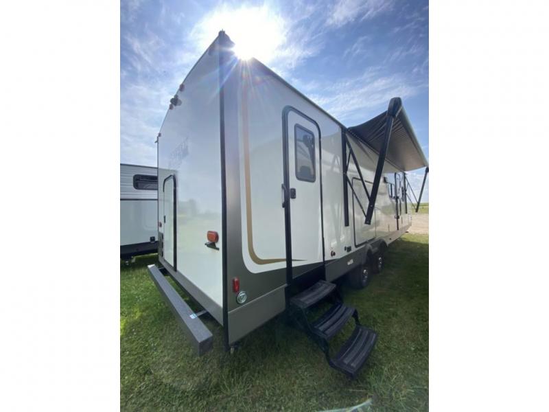 This is a popular bunk trailer for a larger family thanks to having the convenience of dual entry doors allowing access to the main living and kitchen area and near the front bedroom, and into the full bathroom for a quick in and out when playing outside. The bathroom also includes a hamper for convenience. The Stor-More cargo door allows you to place items from the exterior to the interior under the lower flip bunk for safe travels to your destinations and back home. The kids will surely love the convenience centers when playing or sleeping in a bunk. There is a sofa and U-shaped slide including a pet center for relaxing and feeding your pet. The kitchen includes full amenities plus a pantry to store lots of goodies for everyone. Along the exterior, the outside camp kitchen will come in handy when you have everyone at the campsite for dinner and the power awning offers some protection from the elements.