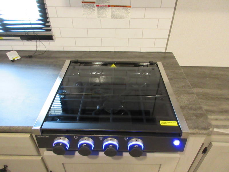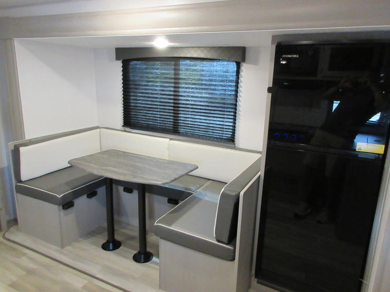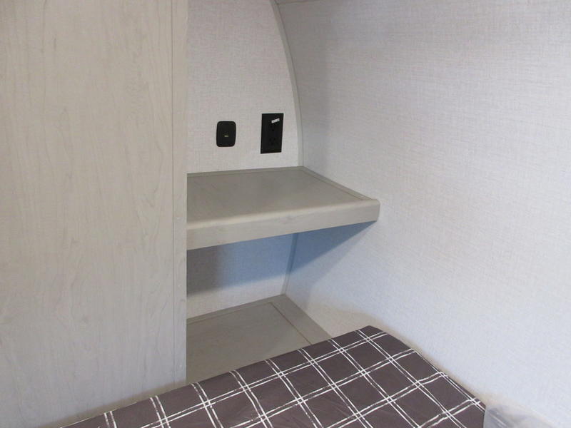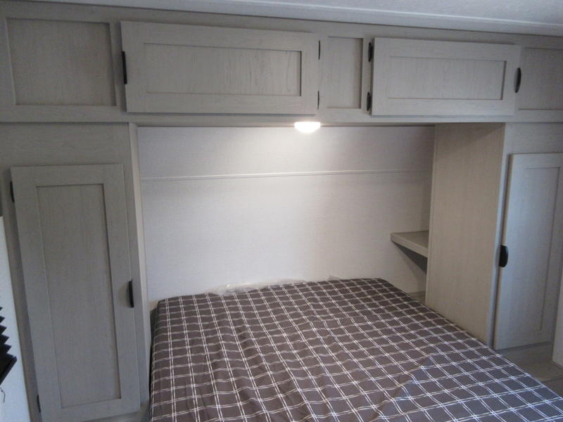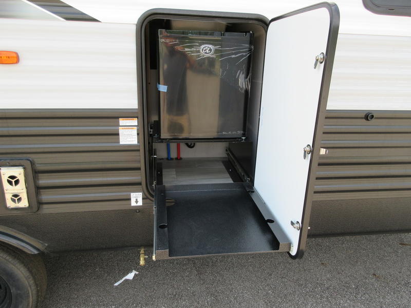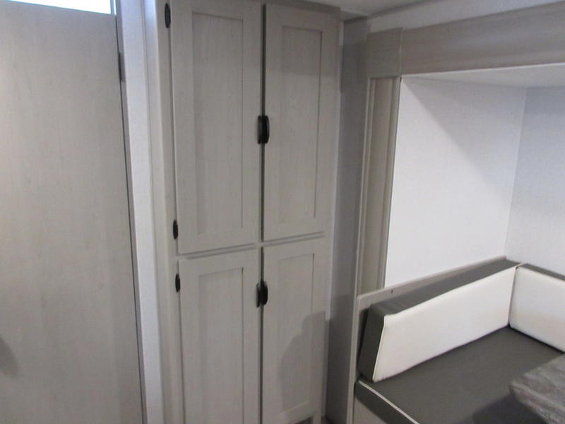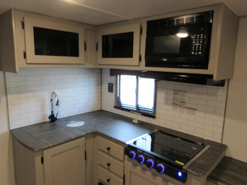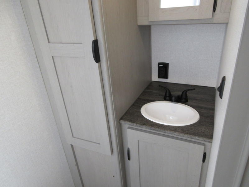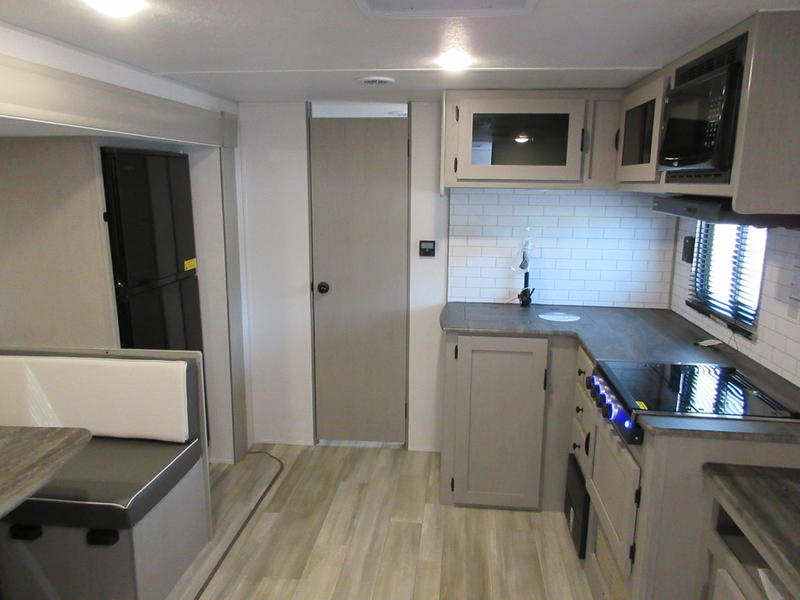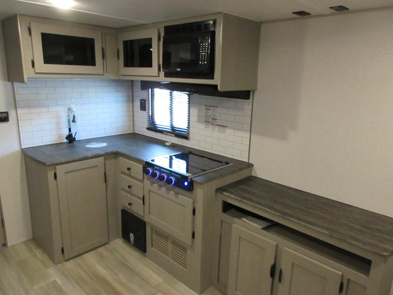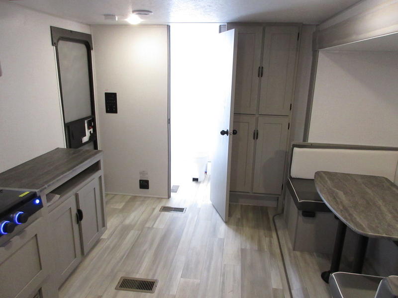 You will feel right at home in this travel trailer! The front private bedroom has a 60" x 74" queen bed with wardrobes and private shelves on either side of it. Prepare your best home cooked meals in the kitchen with the two burner cooktop, microwave, 11 cu. ft. 12-volt refrigerator, and a large countertop with storage below it, plus there is an outside camp kitchen so you can cook breakfast outdoors as the sun is rising. Enjoy all of your meals and games at the U-shaped dinette, and you can even convert it into an extra sleeping space if needed. The full rear bathroom has a 24" x 36" shower to freshen up in each morning and a medicine cabinet to keep your toiletries out of the way. You will also love the skylight overhead for bringing in more light and providing added head room as well.