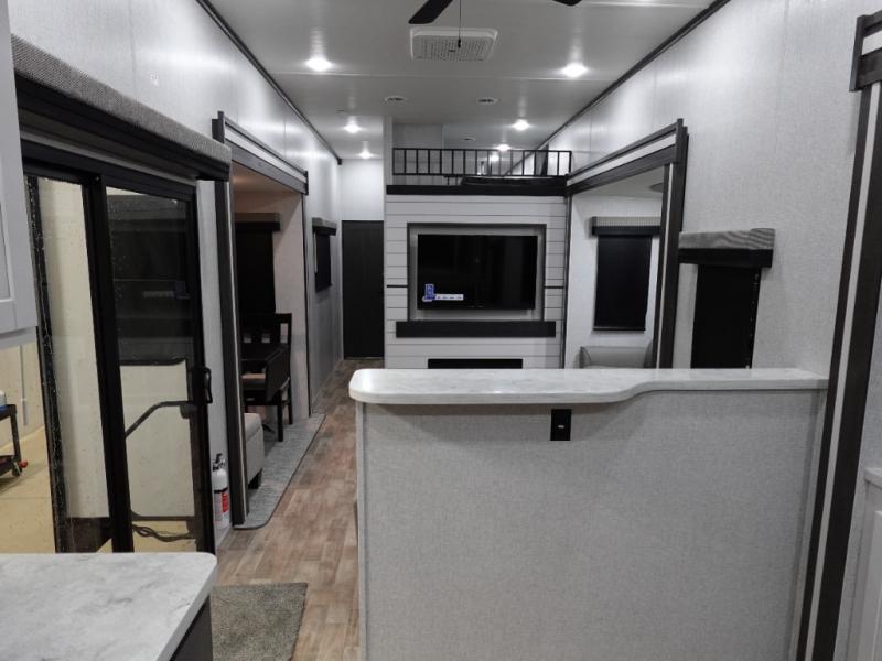 Are you looking for a destination trailer that can fit your whole crew? Look no further than this unit with four slides, three bunk mats in the loft areas, plus a spacious full bath that will allow everyone to stay clean each day. The front kitchen is any chef's dream with its ample counter space, pantry/cabinet, residential four burner range, and residential refrigerator. After dinner is cleaned up, everyone can meet in the middle living area to watch a movie on the 50" TV, and the fireplace here will make it feel more like home.