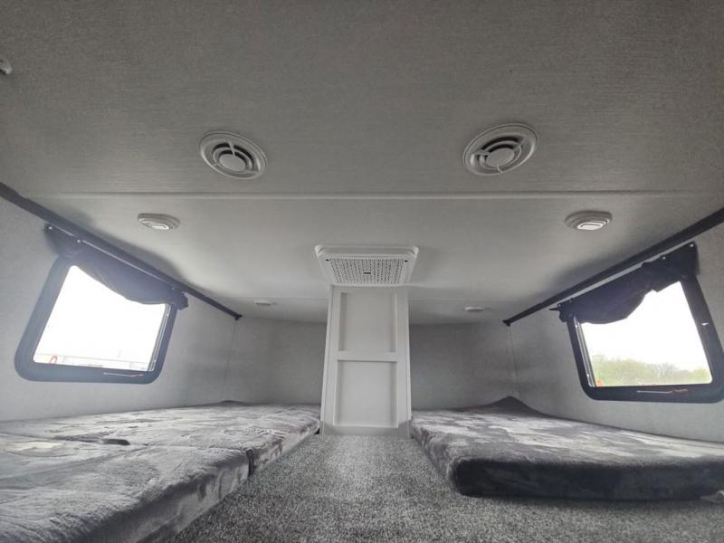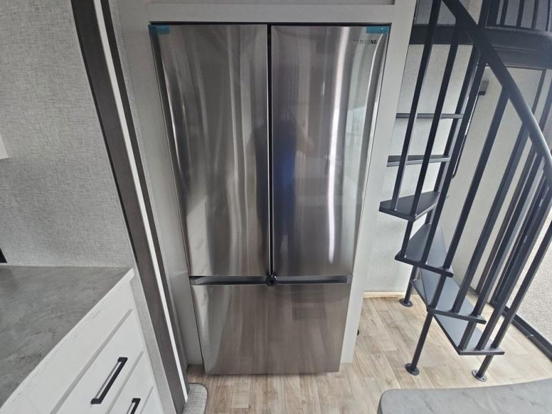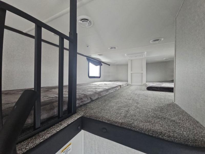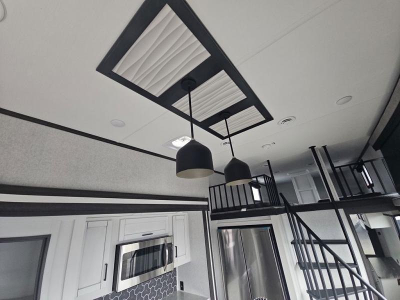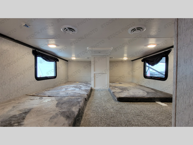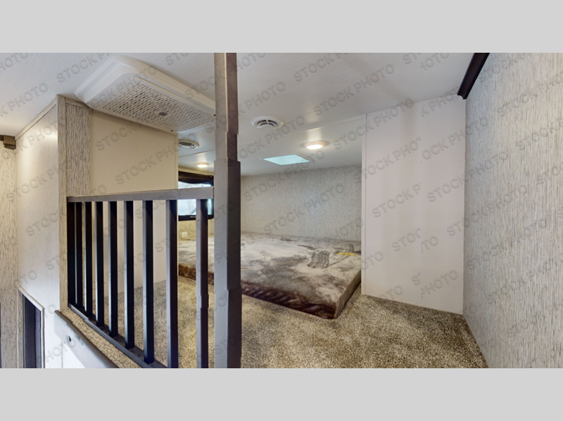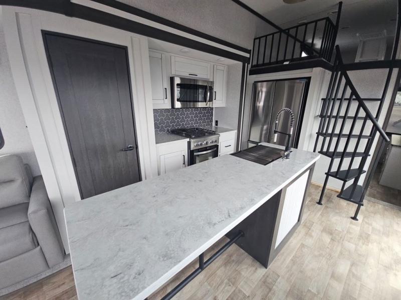 There are plenty of sleeping spots in this destination trailer! Starting with the front private bedroom that has a king bed slide across from a dresser, a closet, and just outside the entrance is a set of spiral stairs leading to one of the two loft areas. This loft above the bedroom has three 38" x 74" bunk mats, a TV, and a cubby for your belongings. The second loft has a 60" x 80" bunk mat and is above the full rear bathroom which features a 48" shower for everyone to freshen up in as well as an area prepped to add the optional washer and dryer for clean clothes throughout your entire stay. The dual entry doors make it easy to enter and exit this unit, plus one of them is a set of patio doors to add even more natural lighting. The chef will have an easy time preparing delicious meals with the kitchen island, and at night everyone can relax on the L-shaped sofa across from the entertainment center featuring a fireplace and 50" LED HDTV!
