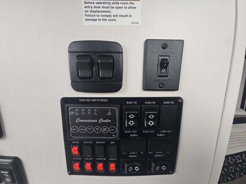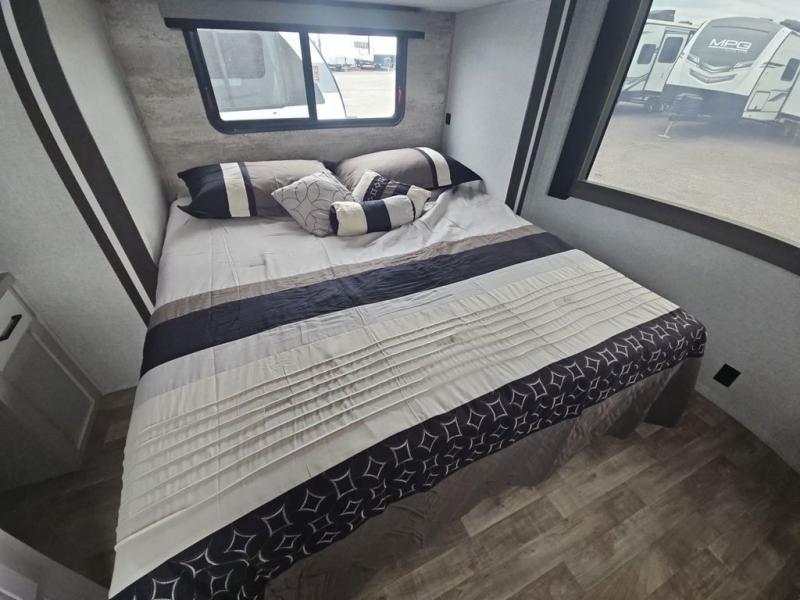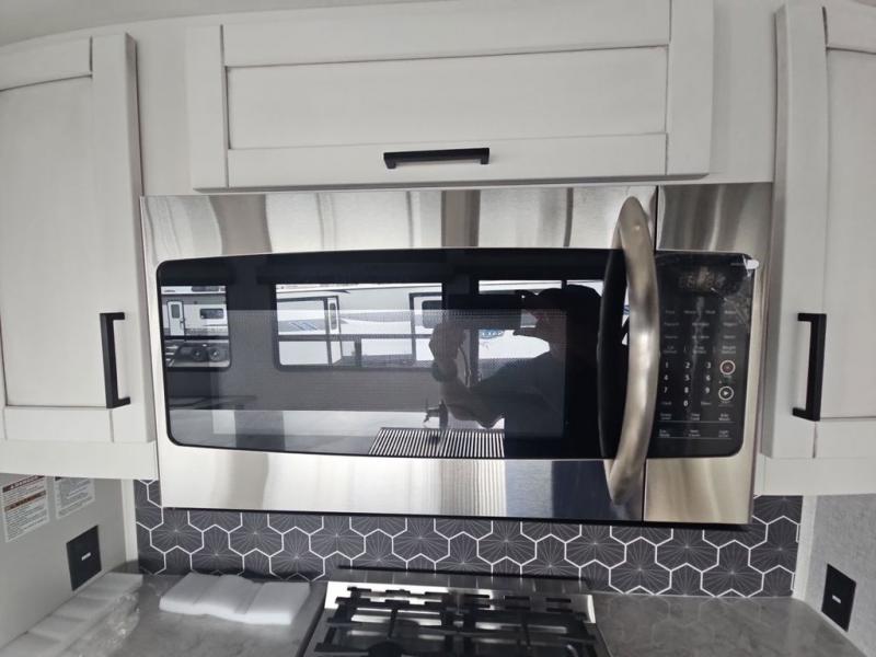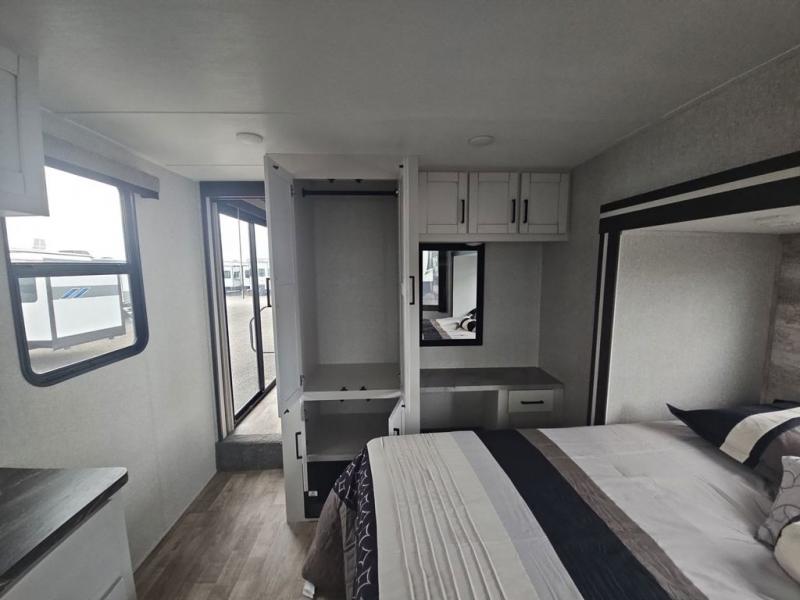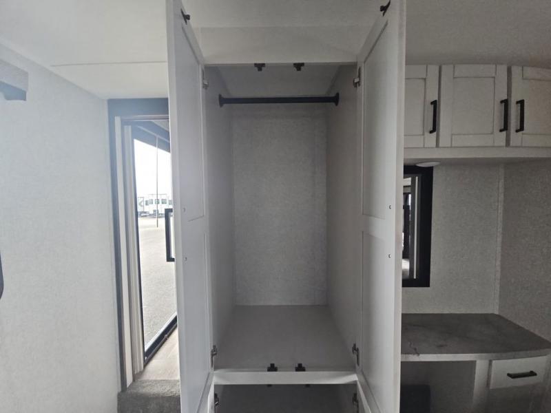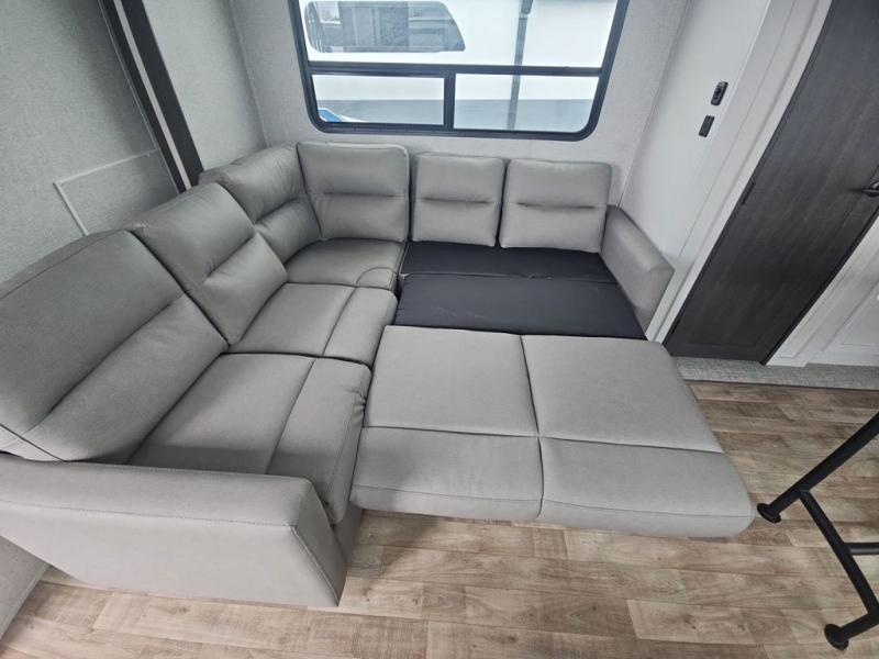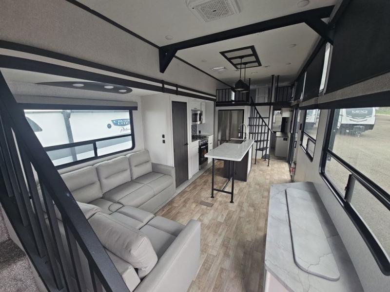 There are plenty of sleeping spots in this destination trailer! Starting with the front private bedroom that has a king bed slide across from a dresser, a closet, and just outside the entrance is a set of spiral stairs leading to one of the two loft areas. This loft above the bedroom has three 38" x 74" bunk mats, a TV, and a cubby for your belongings. The second loft has a 60" x 80" bunk mat and is above the full rear bathroom which features a 48" shower for everyone to freshen up in as well as an area prepped to add the optional washer and dryer for clean clothes throughout your entire stay. The dual entry doors make it easy to enter and exit this unit, plus one of them is a set of patio doors to add even more natural lighting. The chef will have an easy time preparing delicious meals with the kitchen island, and at night everyone can relax on the L-shaped sofa across from the entertainment center featuring a fireplace and 50" LED HDTV!
