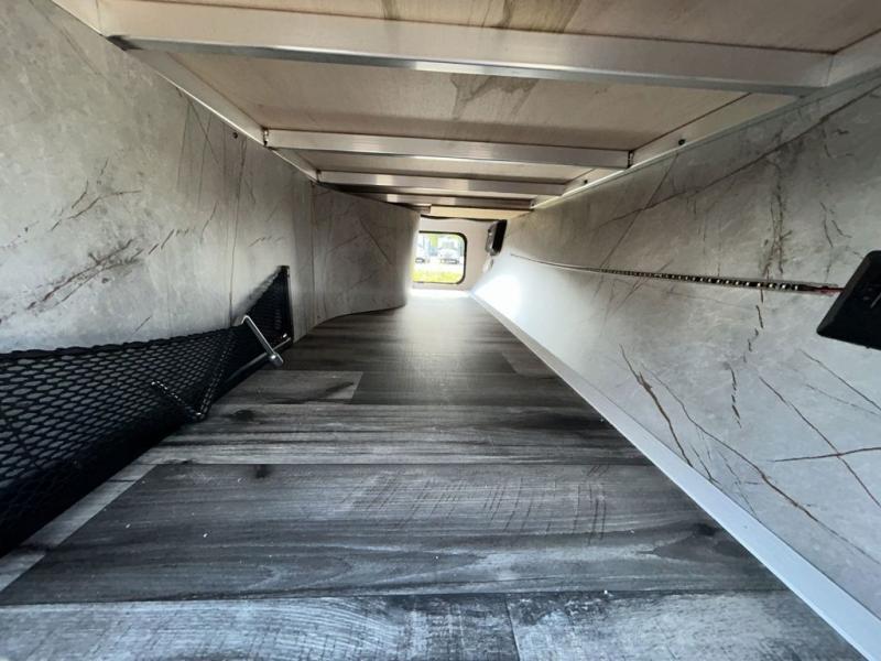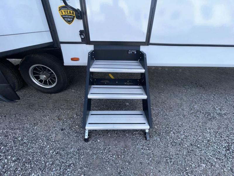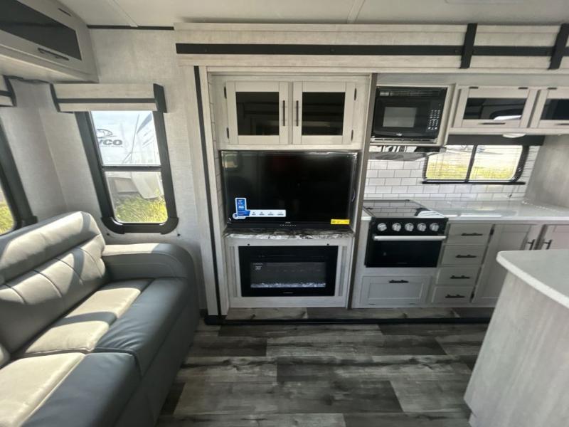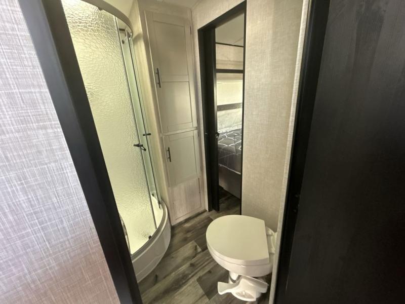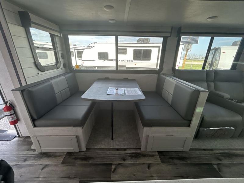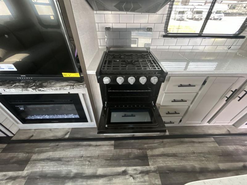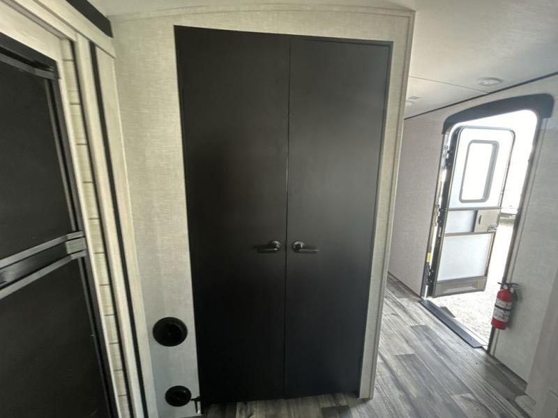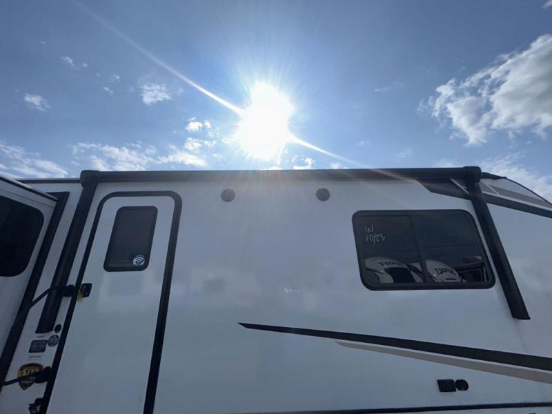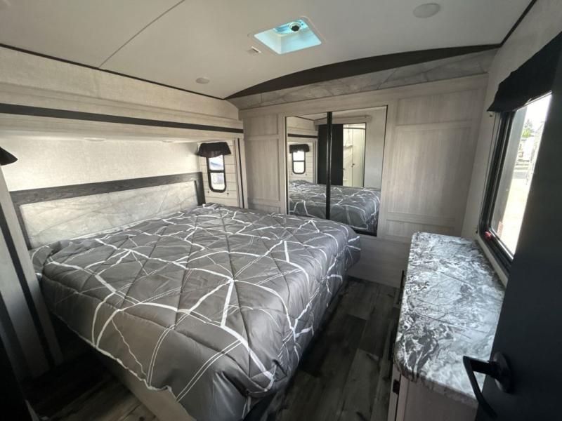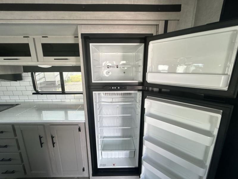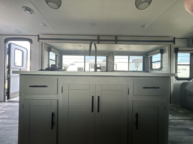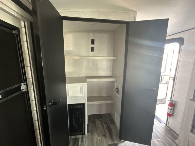 This spacious travel trailer is beaming with luxurious features you are sure to love. The dual opposing slides in the main living area open up the whole space, plus there is a third slide out in the front master suite. The chef of the family will appreciate the kitchen island for additional counter space, and there is a large pantry for all your non-perishables. This space has also been prepped to add an optional washer and dryer if you choose. Your family will find plenty of seating space on the rear 82" tri-fold sofa, the XL booth dinette, and the theater seating. The dual entry bath creates a front master bedroom, and you'll find plenty of storage space here, including a chest of drawers and a large front shelf!