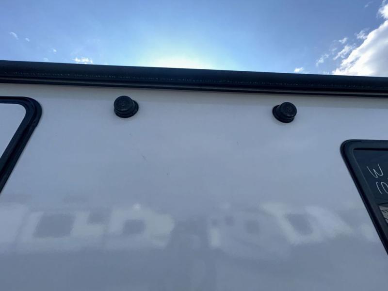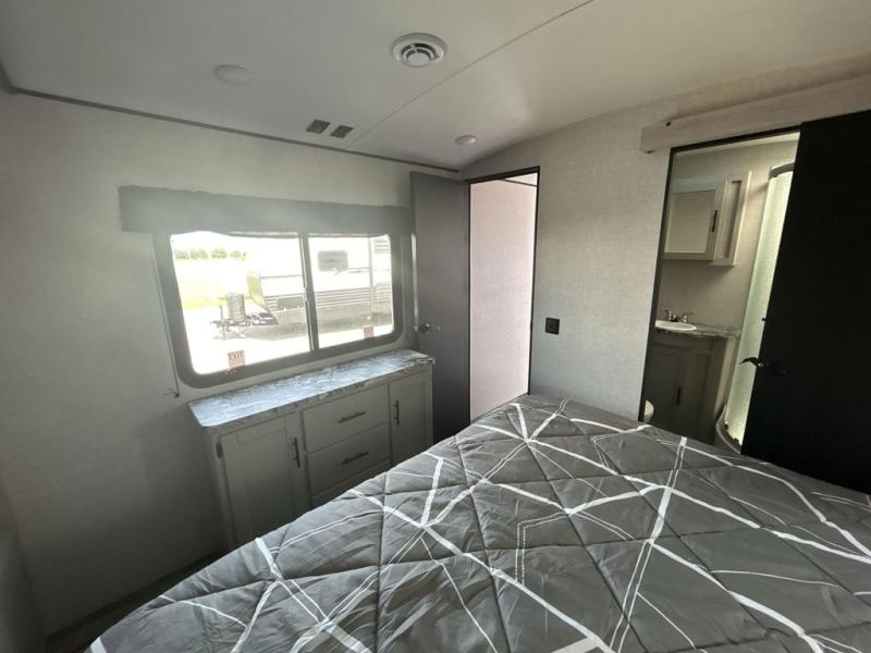 With any Sunset Trail travel trailer by CrossRoads RV, the interior offers a stainless steel farmhouse sink with a cover, solid surface kitchen countertops, and a docking station with 12 Volt, USB Port, and 110 Outlets. Also included is a 13,500 BTU air conditioner plus upgraded insulation with roof and floor reflective foil for added comfort, plus sturdy construction elements like a plywood bed board with strut assist, residential wood window trim, and hardwood cabinet doors. Make your lightweight and comfortable RV decision today!