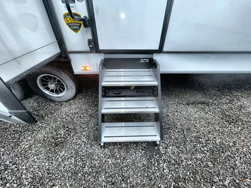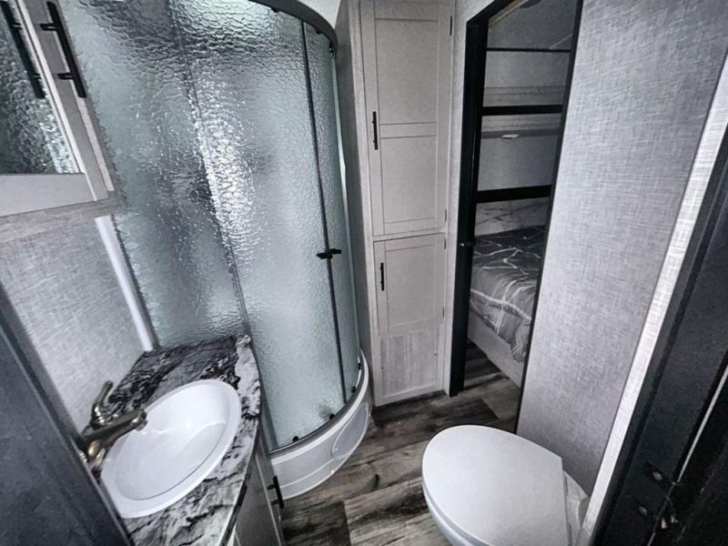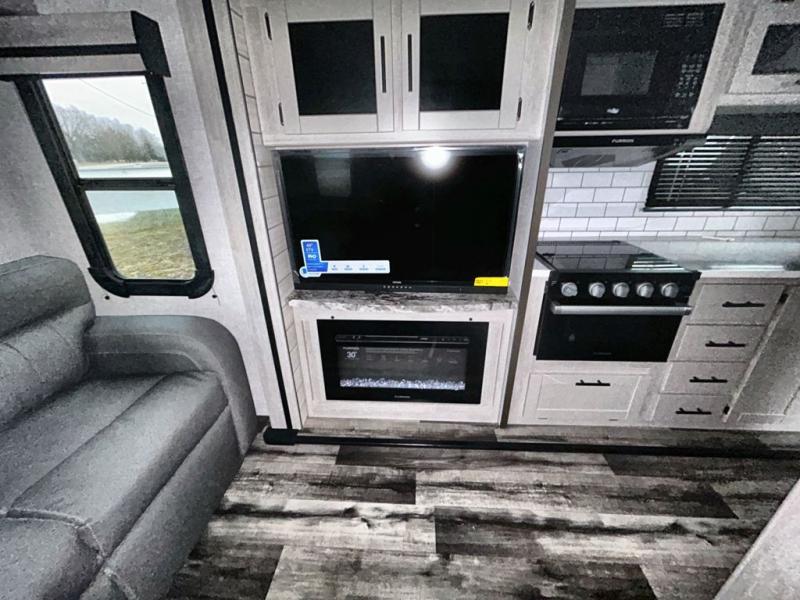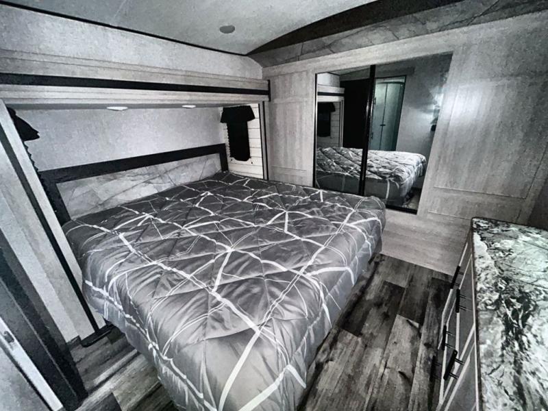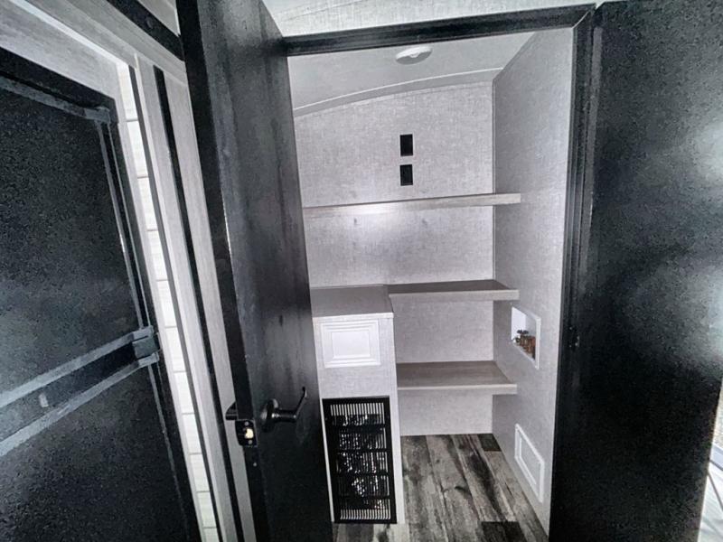 This spacious travel trailer is beaming with luxurious features you are sure to love. The dual opposing slides in the main living area open up the whole space, plus there is a third slide out in the front master suite. The chef of the family will appreciate the kitchen island for additional counter space, and there is a large pantry for all your non-perishables. This space has also been prepped to add an optional washer and dryer if you choose. Your family will find plenty of seating space on the rear 82" tri-fold sofa, the XL booth dinette, and the theater seating. The dual entry bath creates a front master bedroom, and you'll find plenty of storage space here, including a chest of drawers and a large front shelf!