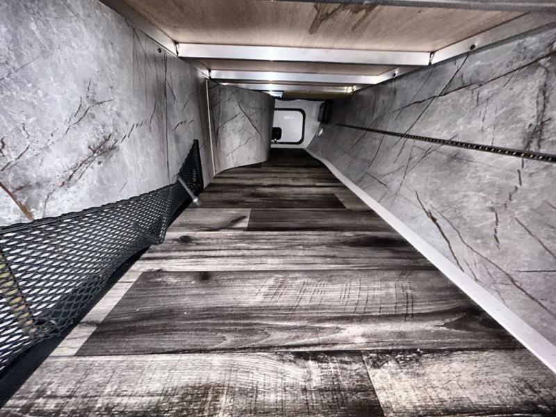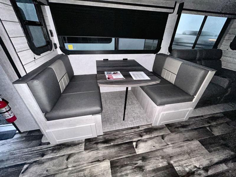 With any Sunset Trail travel trailer by CrossRoads RV, the interior offers a stainless steel farmhouse sink with a cover, solid surface kitchen countertops, and a docking station with 12 Volt, USB Port, and 110 Outlets. Also included is a 13,500 BTU air conditioner plus upgraded insulation with roof and floor reflective foil for added comfort, plus sturdy construction elements like a plywood bed board with strut assist, residential wood window trim, and hardwood cabinet doors. Make your lightweight and comfortable RV decision today!