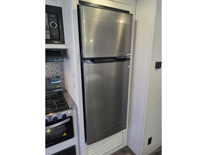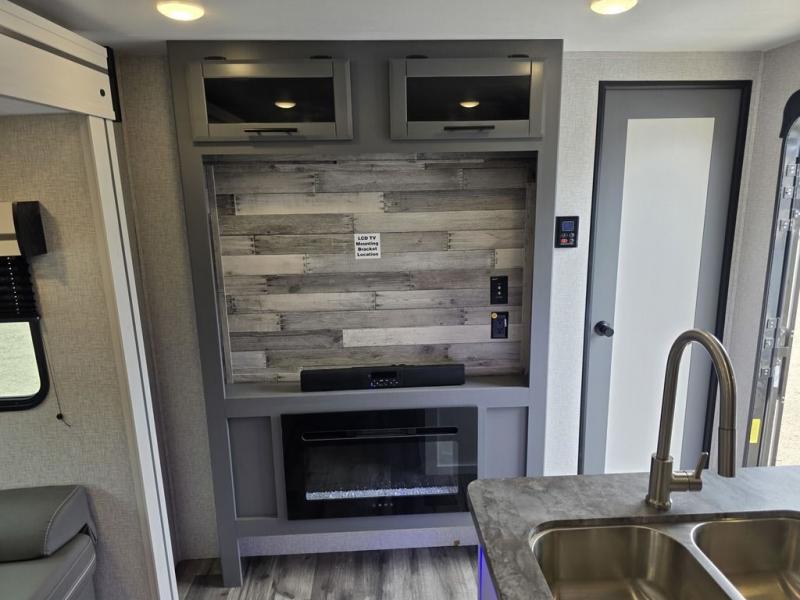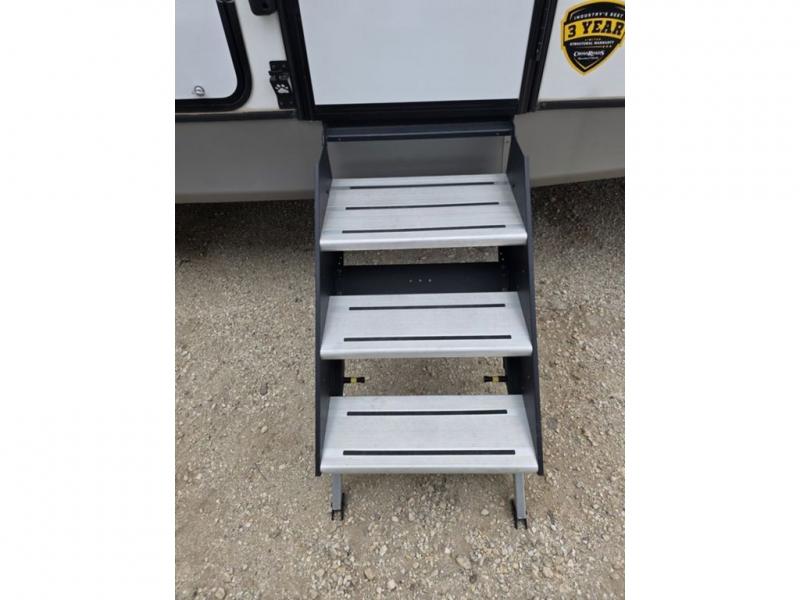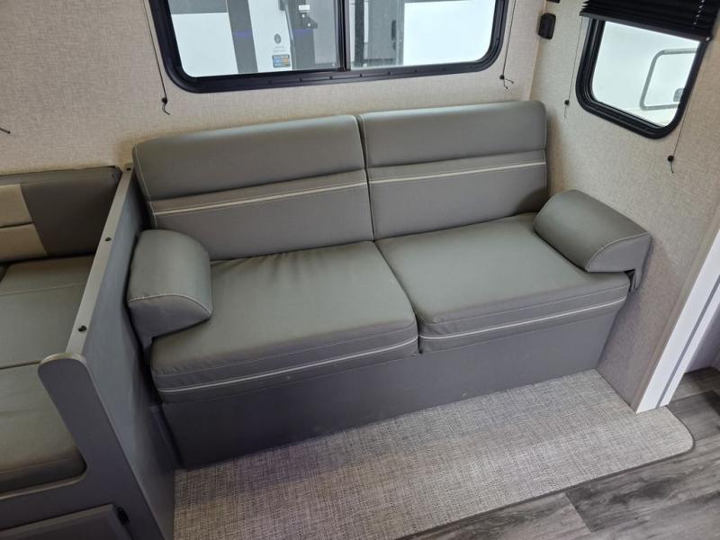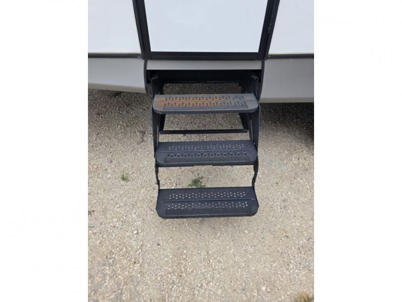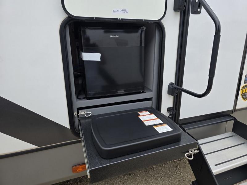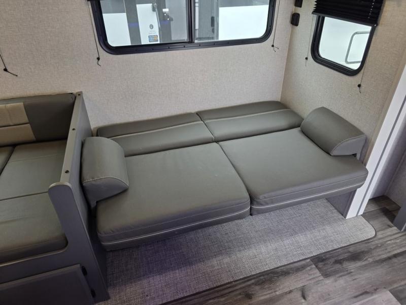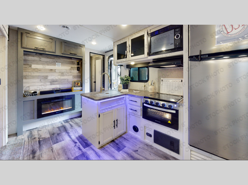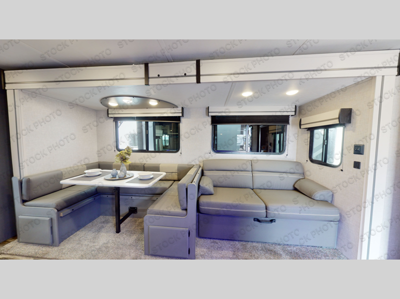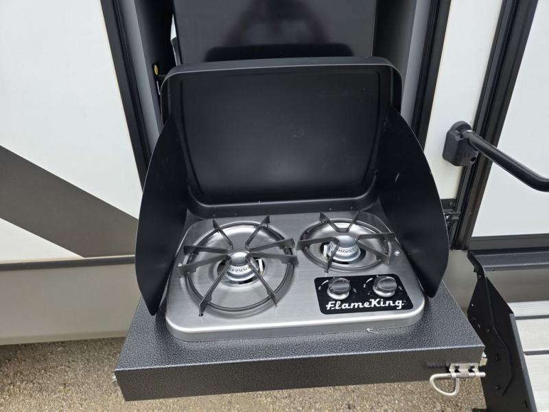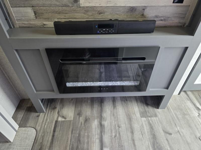 Load up and head out to your favorite state park in this dual entry travel trailer. The double slides will provide additional interior space, and the ten person sleeping capacity allows you to make this a whole-family trip! Once you arrive at your destination, prepare a quick lunch on the outside cooktop under the power awning. You'll also find indoor appliances to make meals when the weather isn't cooperating. Take a load off on the jackknife sofa or play a game of cards around the U-shaped dinette, and the fireplace will provide a more at-home feel. This model includes a rear master bedroom with its own exterior entrance, and up front you'll find queen-size bunks that will be perfect for the kids or your guests!
