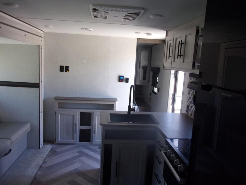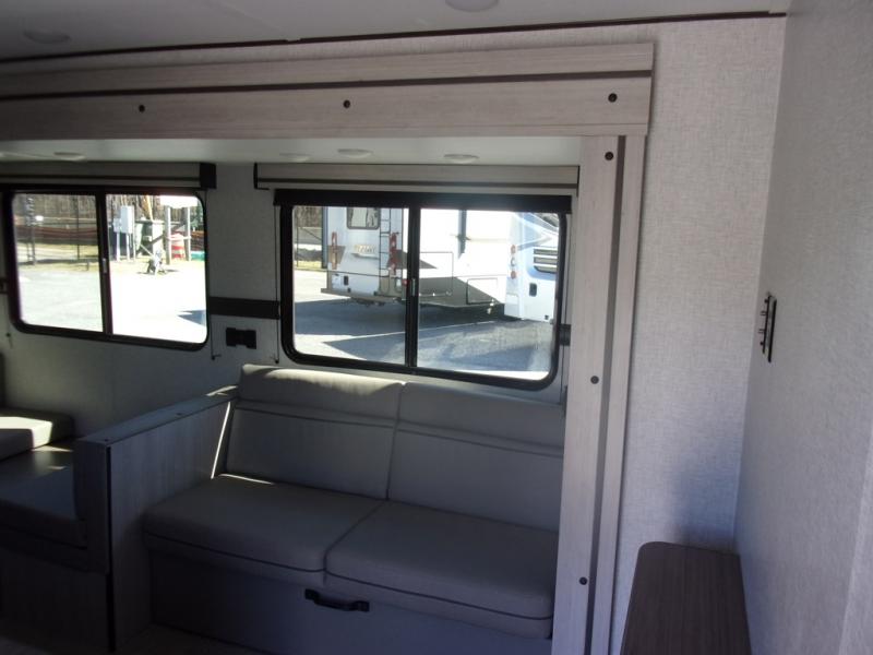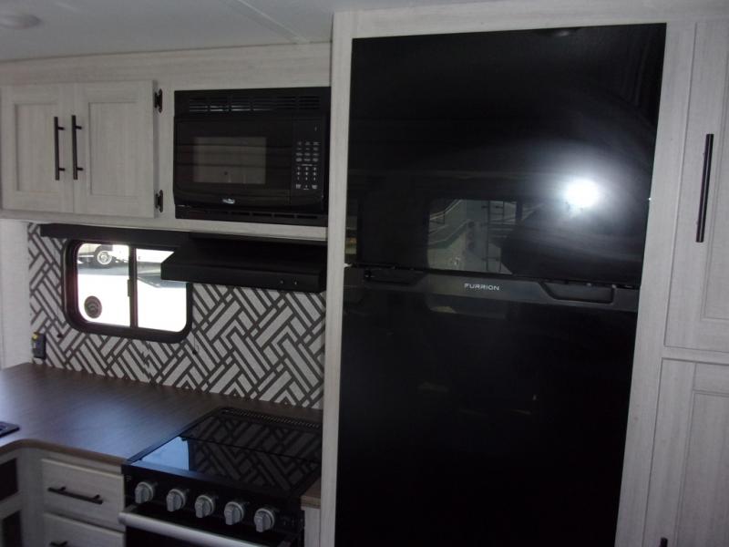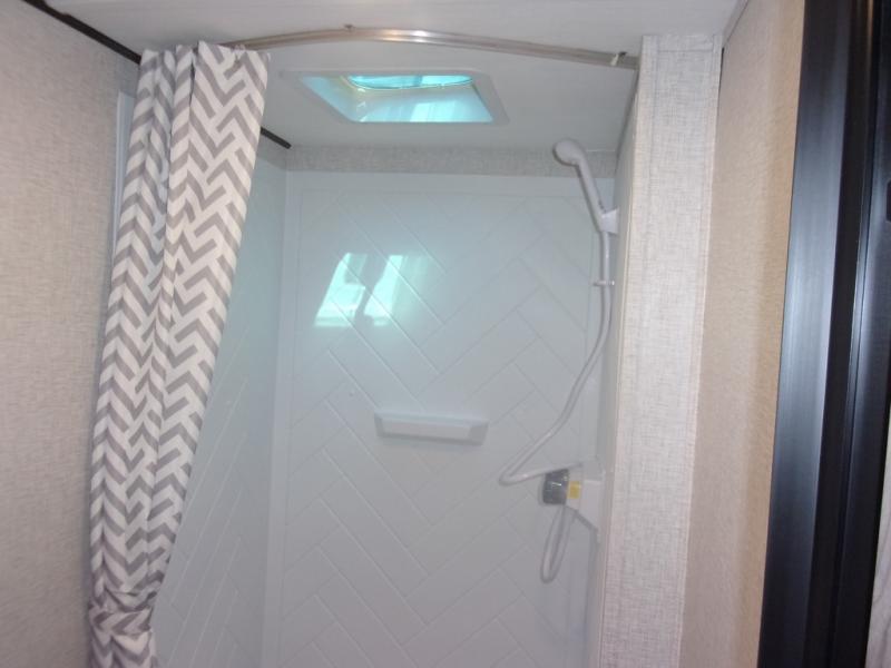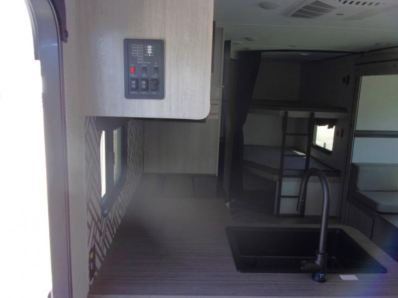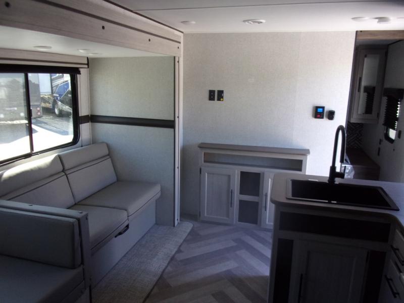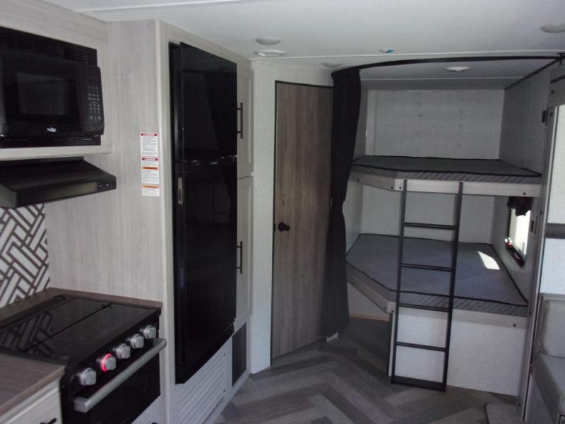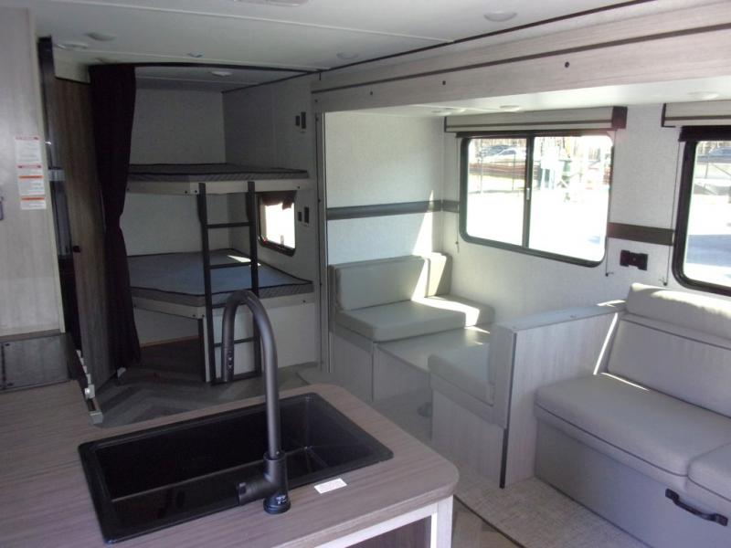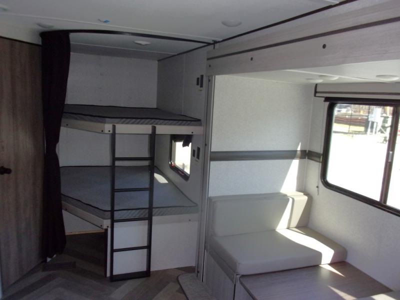 If you've been searching for a travel trailer that can sleep more campers and give you more interior space, this is the one! There are double-size bunks with a ladder for the little ones, an RV queen bed in the front bedroom, plus a jackknife sofa and booth dinette that will double as seating and sleeping space. You will be able to make home cooked meals for your crew since there is a three burner range with a glass top and LED lit knobs, and the 10 cu. ft. 12V refrigerator can keep your food fresh. This model also includes a full bath with a 30" x 36" shower, a foot flush toilet, and a medicine cabinet to keep items organized.