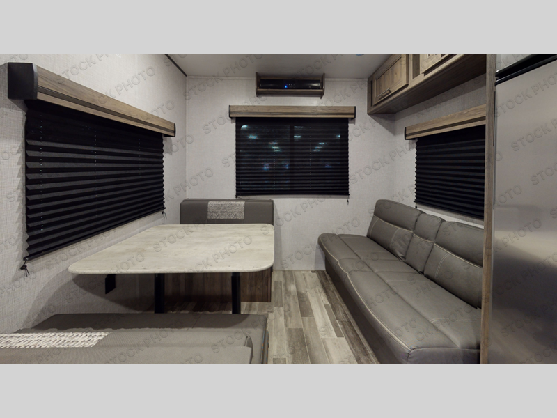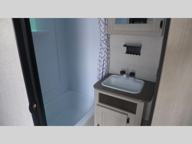 Come step inside this Zinger Lite travel trailer that is sure to bring fun to your next weekend trip. With room to sleep five, you can bring the grandkids or friends. You'll enjoy the rear dining area with a 60" sofa and 38" booth dinette to visit with family and enjoy dinner. This unit includes an RV queen bed with two shirt closets on both sides of the bed. You'll appreciate a pantry for dry goods and a 10 cu. ft. 12V refrigerator to hold chocolate milk for the kids. This travel trailer features a full bathroom with a 36" tub, a toilet, and a medicine cabinet for the first aid kit.