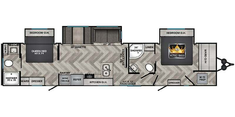 2024 CrossRoads Zinger travel trailer ZR390DB: Pack your bags and invite your friends to tag along in this travel trailer! The master suite has a 60" x 74" queen bed slide across from a dresser next to a wardrobe and it's own rear full bathroom with a 30" x 36" shower. The front private bedroom has a king bed slide across from a dresser and a front wardrobe next to an area prepped to add an optional washer and dryer, plus an entrance into the dual entry bathroom which has a 34" radius shower. Both bedrooms have an entrance/exit door to the unit and the 60" x 72" patio door leads directly into the kitchen/living area. The chef can prepare delicious meals with the three burner cooktop then you can enjoy them at the 38" booth dinette next to a 60" jackknife sofa for a relaxing evening by the 50" TV at the entertainment center. You even have an outside mini fridge to enjoy a cold beverage while playing a game of cornhole!
