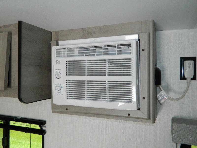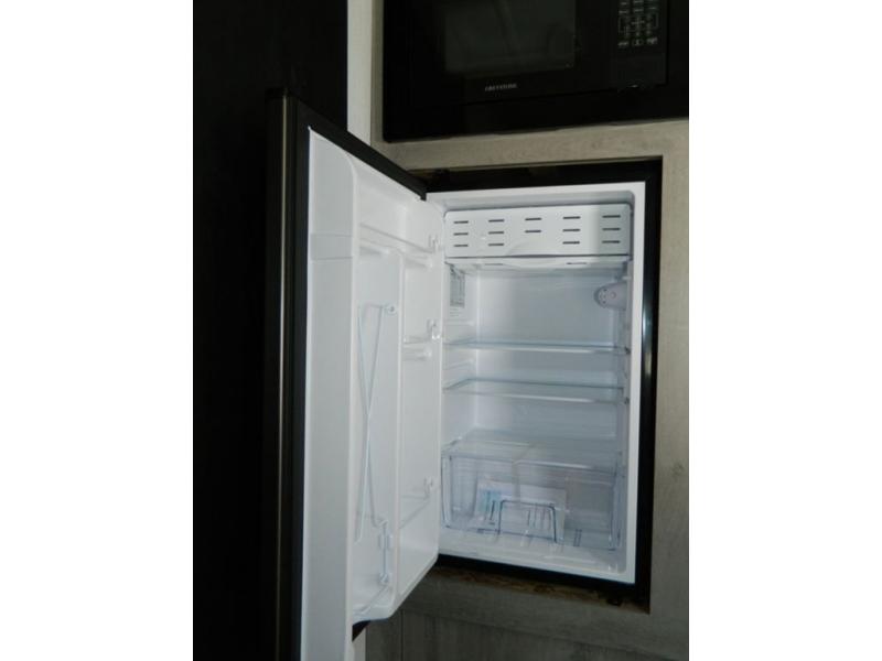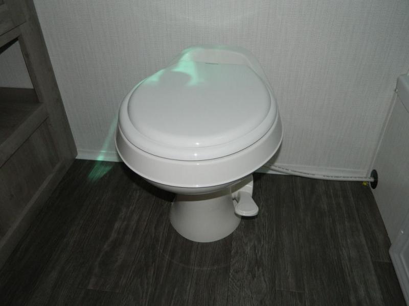 This is the perfect couple's trailer with space for an overnight guest or two little ones on the booth dinette. Each morning you can make breakfast on the two burner cooktop and store food in the refrigerator. There is a rear bath with a shower, toilet, and wardrobe to keep your clothes wrinkle-free. When you're ready to get some shut-eye, the front queen bed will provide a great night's rest!
