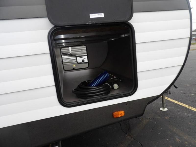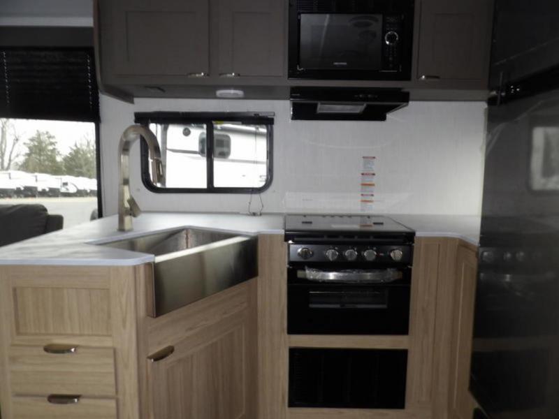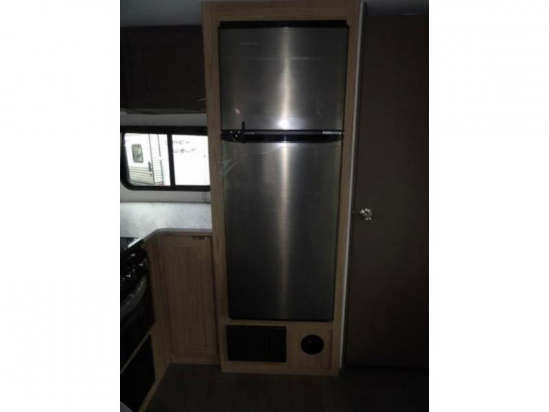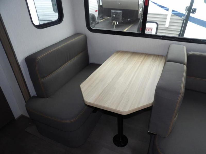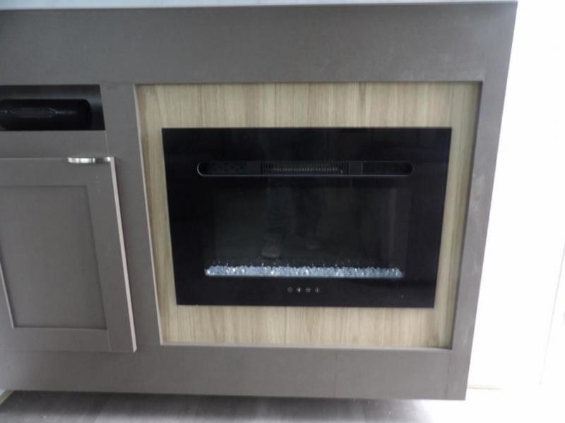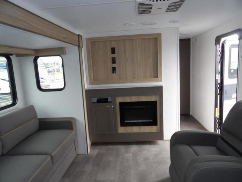 Start a new journey in this cozy travel trailer for five to six. The rear kitchen includes ample counter space to prep meals, a three burner cooktop, plus a spacious pantry where you can keep dry goods and snacks. There are two lounge chairs to relax on, along with a Lux Lounge, and a booth dinette. The fireplace is sure to make your space feel a little more like home, as well as the front private bedroom with a queen bed. The spacious full bath is close by the bedroom for convenience, and there is a bedroom wardrobe so you're not living out of a suitcase all weekend! You can unload your camping chairs from the full pass-through storage, grab a cold drink from the exterior refrigerator, and relax under the 18' patio awning!
