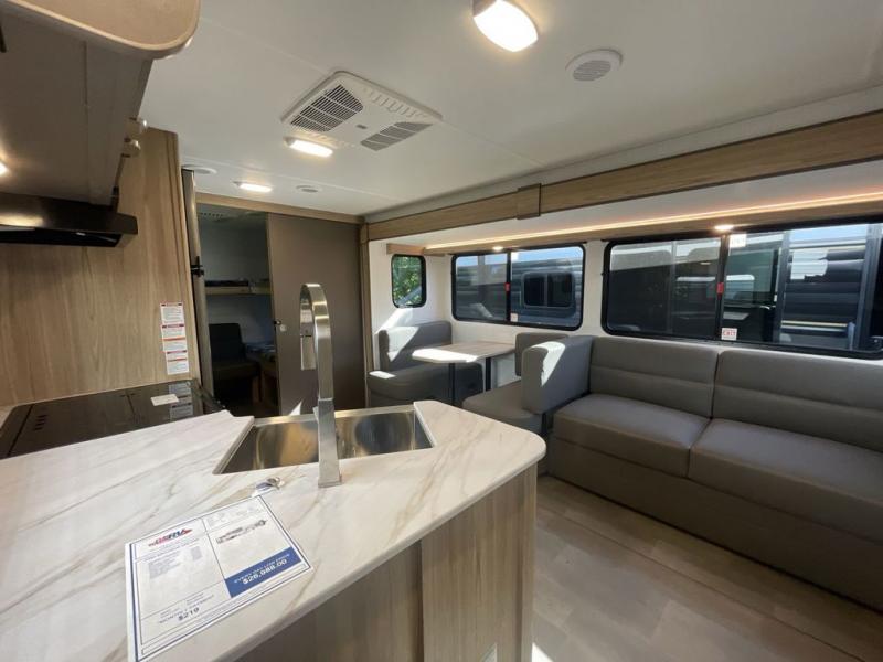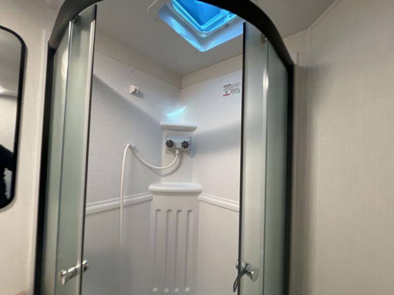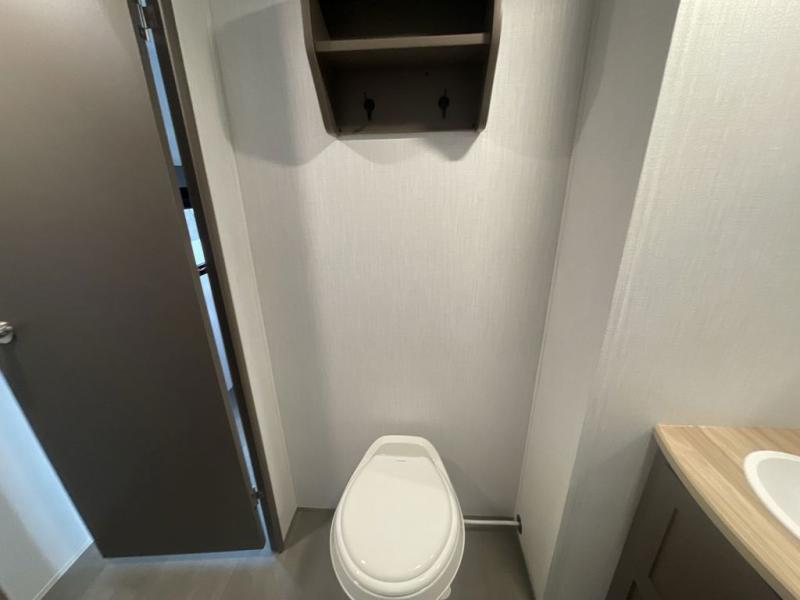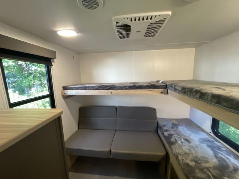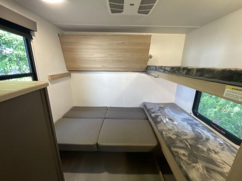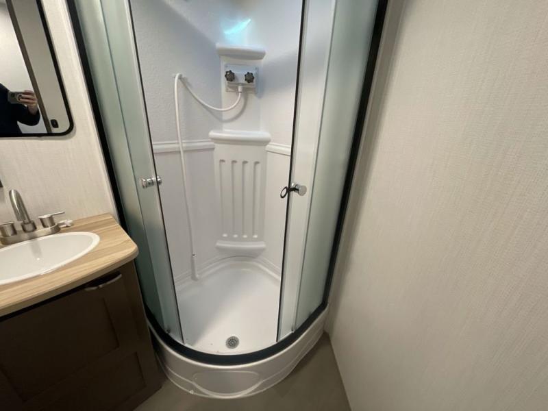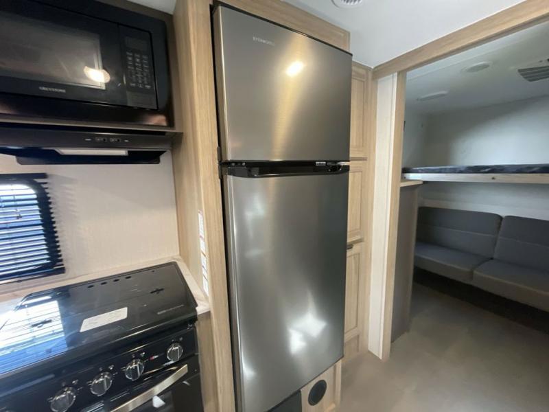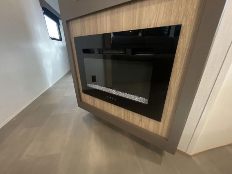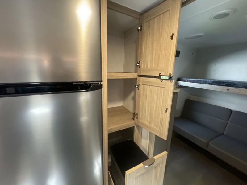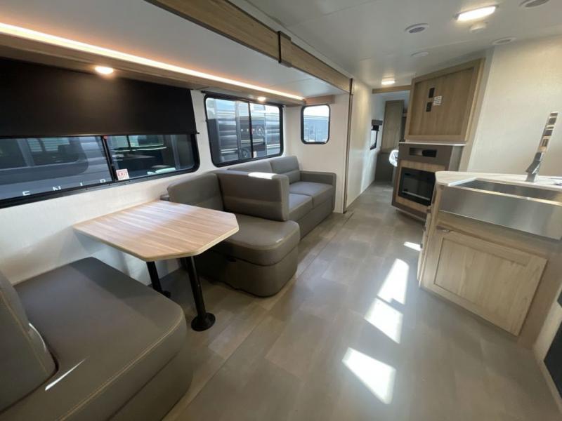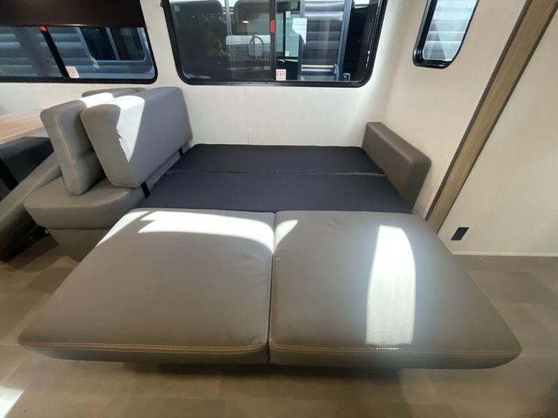The largest of the Avenir line offers sleeping for a large group with a private bunkhouse in back featuring a bunk over a jackknife sofa and a second set of bunks sleeping five total in this space. There is also a dresser for storage opposite the sofa with TV prep above it. In the main combined kitchen and living room you will enjoy added space thanks to a large slide out 42" x 76" booth dinette and Lux Lounge which can both be converted to extra sleeping space if needed. An angled interior wall from the bathroom is where you will view the fireplace. Opposite the slide is your kitchen area where you can easily create meals and snacks just like home. You will find a large pantry, refrigerator, three burner cooktop and large sink for cleaning up. There is also a microwave oven and overhead storage for all of your dishes. An outside refrigerator under the 18' awning allows you to keep drinks and cold snacks readily available when spending time outside. A full bath with radius shower will keep everyone feeling clean and fresh, and the private front bedroom offers a queen bed, dual nightstands and storage with a full pass-through on the outside beneath the head of the bed for all of your outdoor gear.