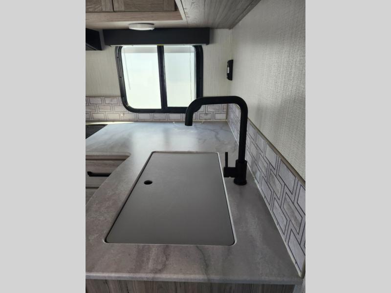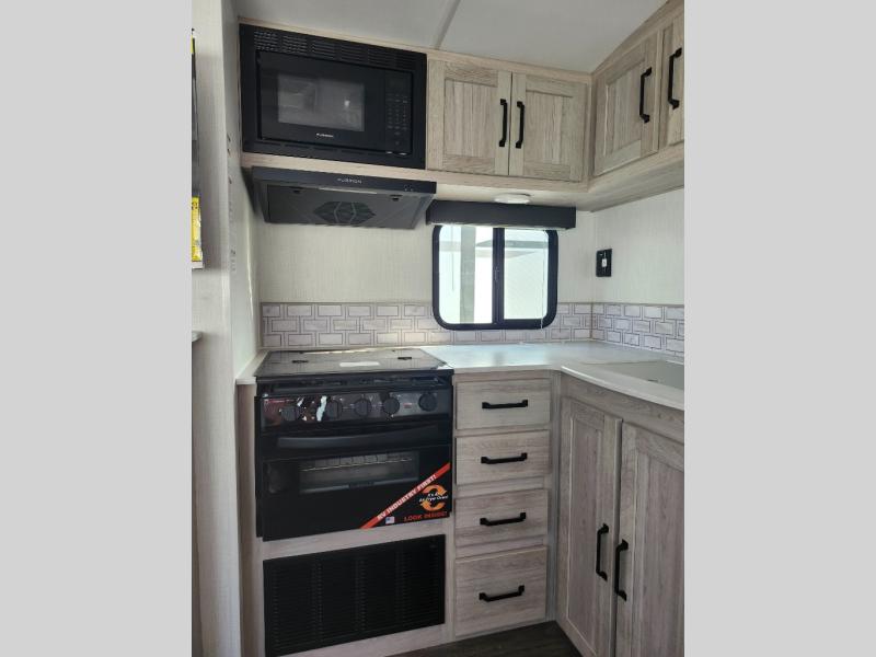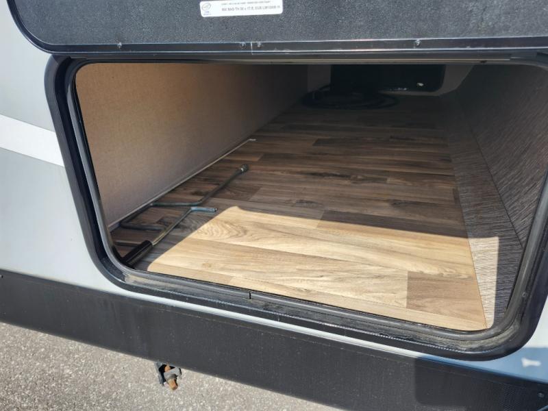 The chef will love cooking with this travel trailer! They can cook either indoors with the three burner cooktop or breathe in some fresh air while cooking at the outside kitchen with a griddle for pancakes in the mornings. The walk-in pantry/wardrobe can hold your snacks and coats. Inside the front private bedroom is a queen bed for you to enjoy a good night's rest and wardrobes on either side of it, plus a closet to keep all of your clothes looking nice. The U-shaped dinette is not only great for enjoying meals and playing card games, but also for transforming into an extra sleeping space!