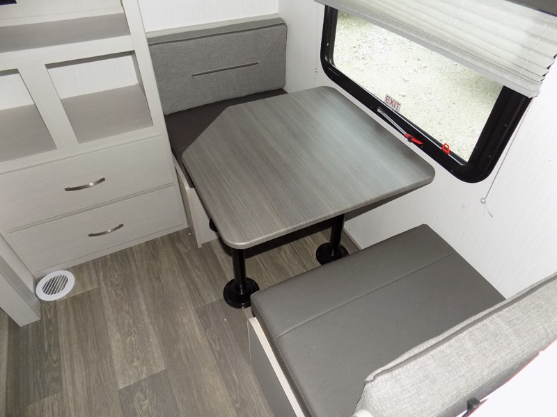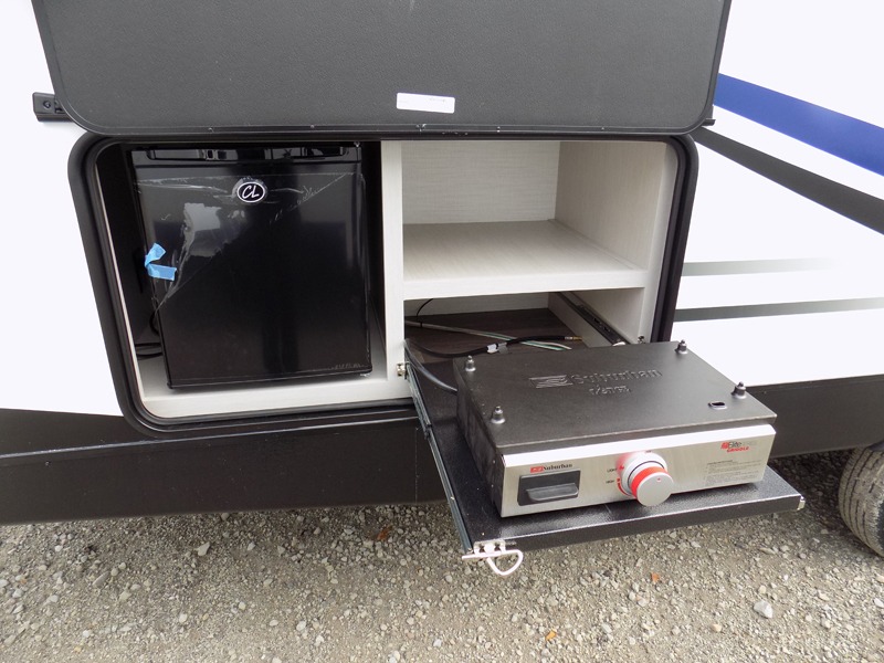 The kids or guests will love having their own privacy with the rear private bunkhouse in this travel trailer! The bunkhouse has a set of double bunk beds and a bunk above a dinette. The chef can prepare their best meals either indoors with the three burner cooktop or head to the outside kitchen and grill some burgers on the griddle. The sofa and booth dinette slide creates more interior space, comfortable places to eat and socialize, and even extra sleeping spaces. The front private bedroom has a queen bed with wardrobes on either side to keep your clothes looking nice!
