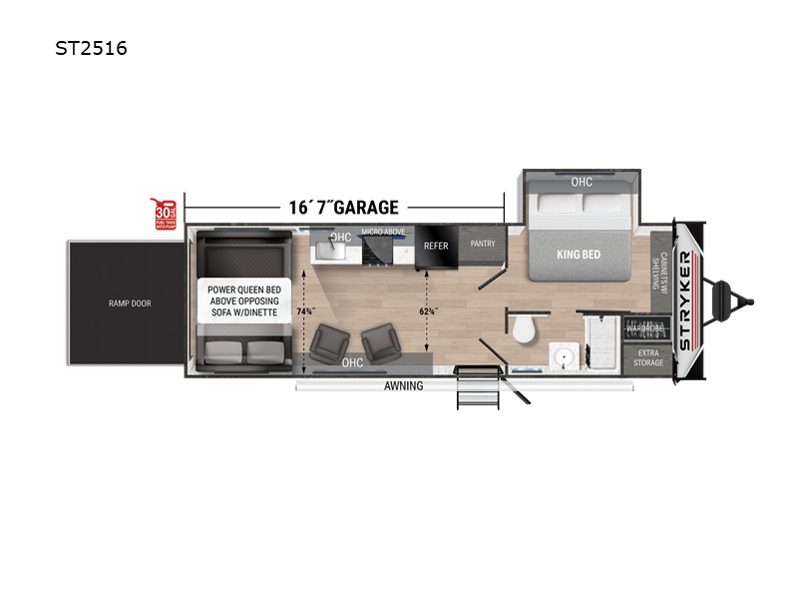 The Cruiser Stryker ST2516 toy hauler is ready to go on a road trip! A 16'7" garage will provide plenty of space for all your toys, but there's a lot of living space too. A king bed slide out gives you a spacious bedroom with lots of floor area, plus storage with cabinets and a wardrobe. The garage has opposing sofas with a dinette so there's a great space for meals, and a power queen bed above for more sleeping space. The kitchen includes an 8 cu. ft. refrigerator, microwave, and three-burner range. Two chairs mean there's a place for guests to sit and chat while you cook!