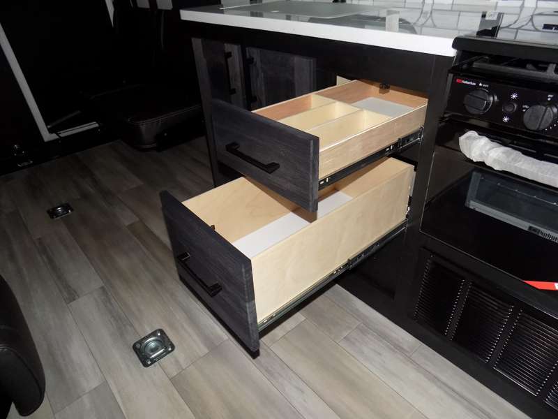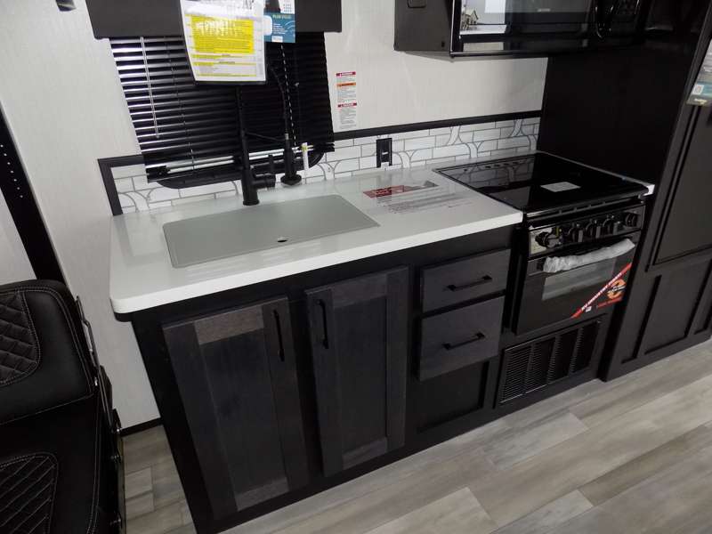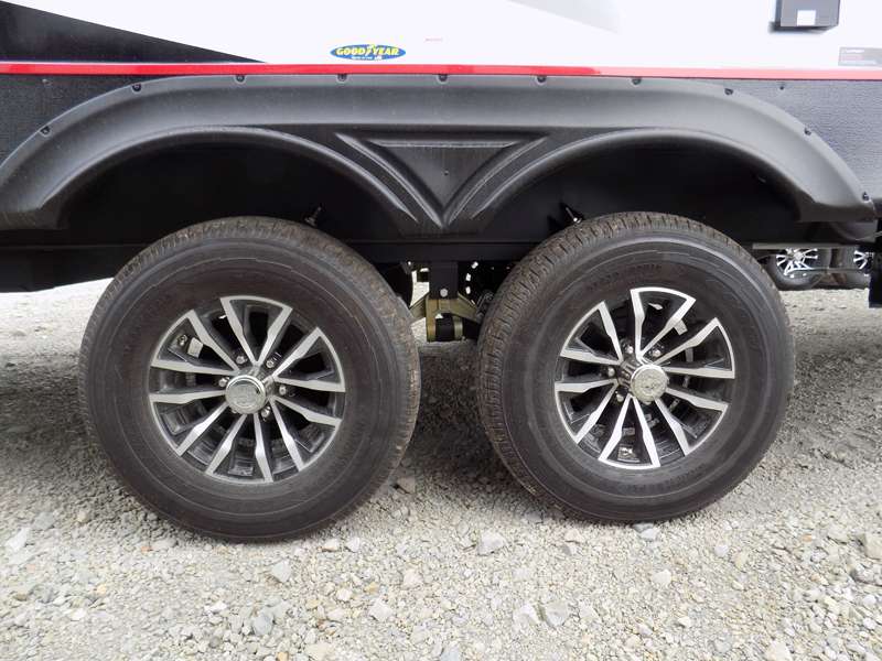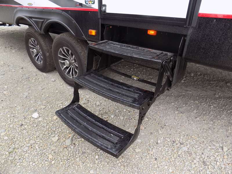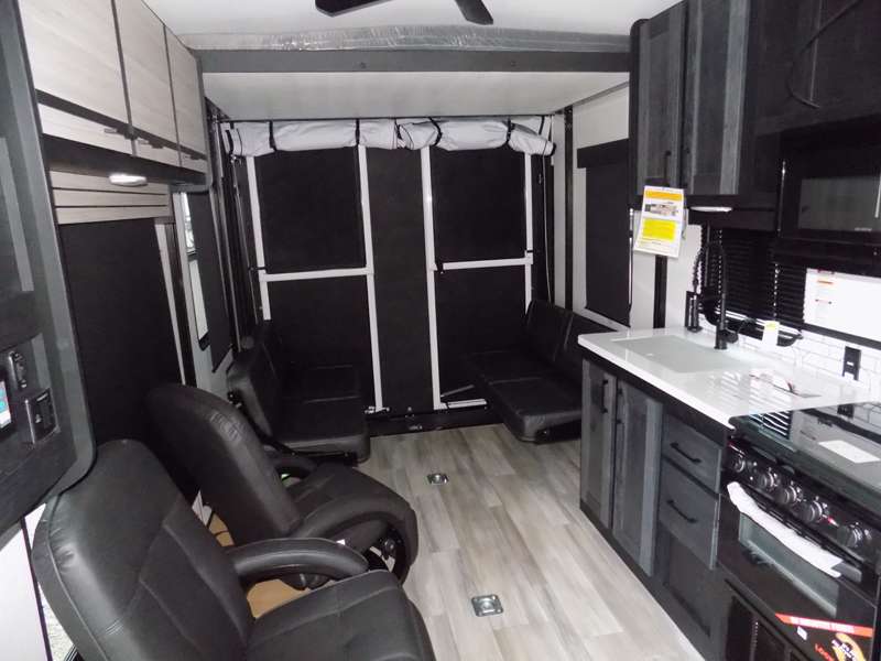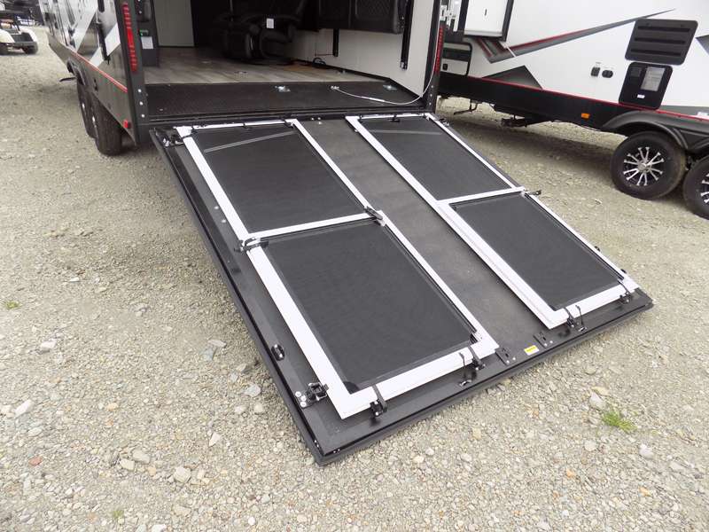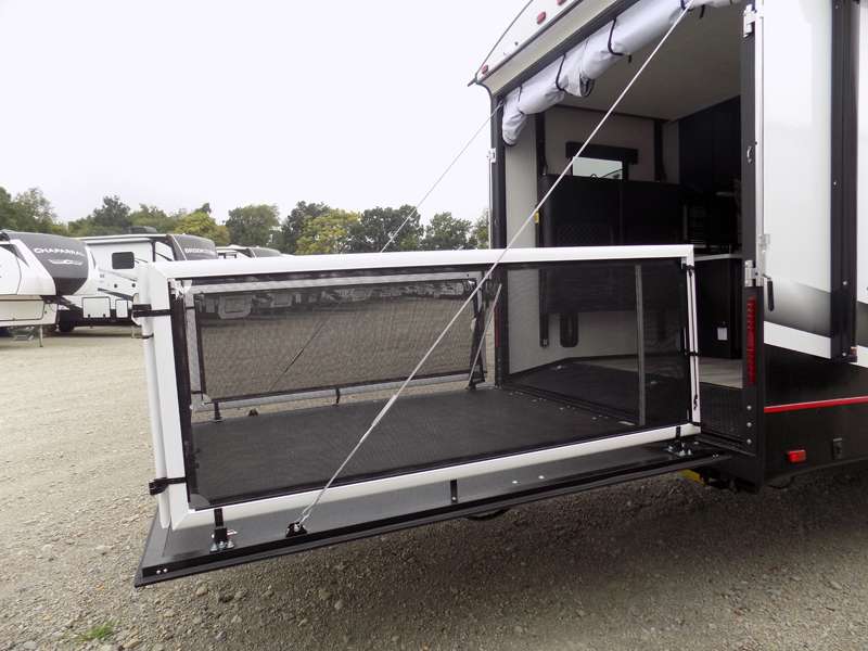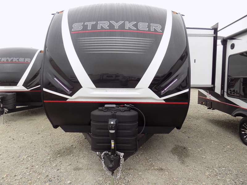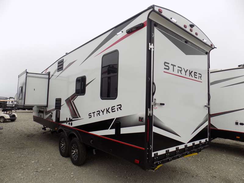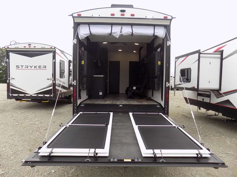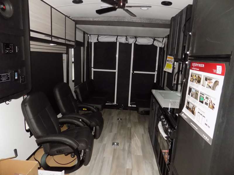 Each Stryker toy hauler travel trailer by Cruiser starts with a powder coated structural steel I-beam frame, Azdel composite laminated sidewalls, and a 102" wide body, perfect for your side-by-side, dirt bikes, or kayaks! The EZ flex rubberized suspension provides smooth towing on tougher roads, and the painted molded fiberglass front cap not only looks sleek, but provides better protection. Inside, you'll find barreled ceilings up to 98" in height, hardwood cabinet doors, solid surface kitchen cabinets, and numerous USB ports and 110V outlets. The removable carpet in the garage will create an open concept you are sure to love, and the industry-first pet palace under the bed will allow you to bring your loyal furry friends along. There's so much more to love about the Stryker toy haulers, like the premium sound system, the large windows, tons of storage space, and the list goes on!