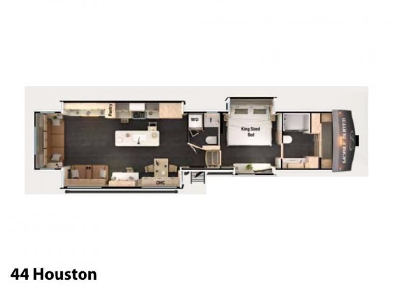 This couple's fifth wheel provides extra sleeping space on the residential sofa with a hide-a-bed in the main living and kitchen area. The entertainment center and fireplace will keep everyone entertained and cozy, and the gourmet kitchen will keep everyone fed. Your family and RV friends can use the half bath which even has washer/dryer prep if you want the option to make full-time living easier than ever, and you will have your own full bathroom up front with dual bath sinks and custom closet after walking through your master bedroom.