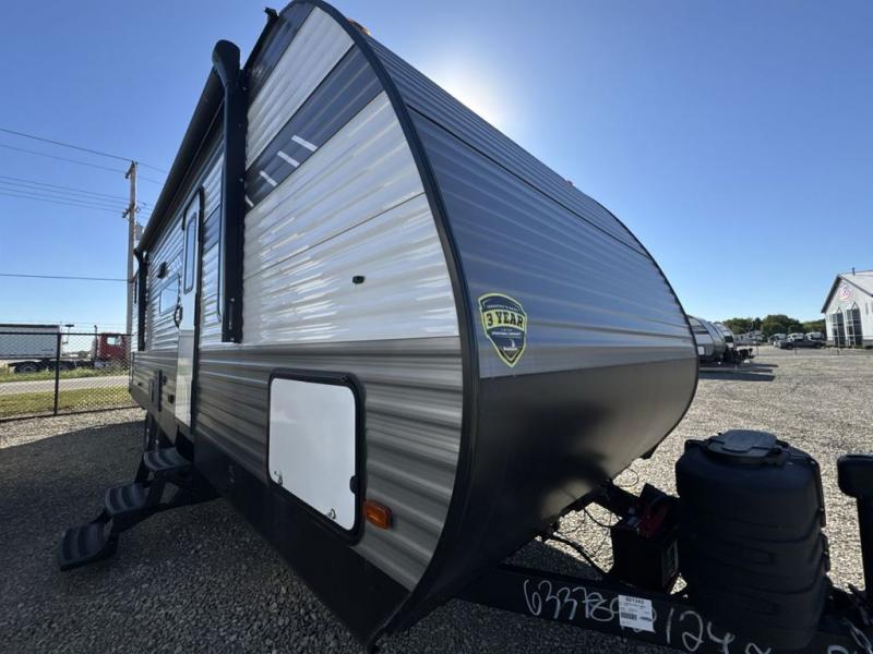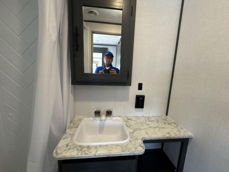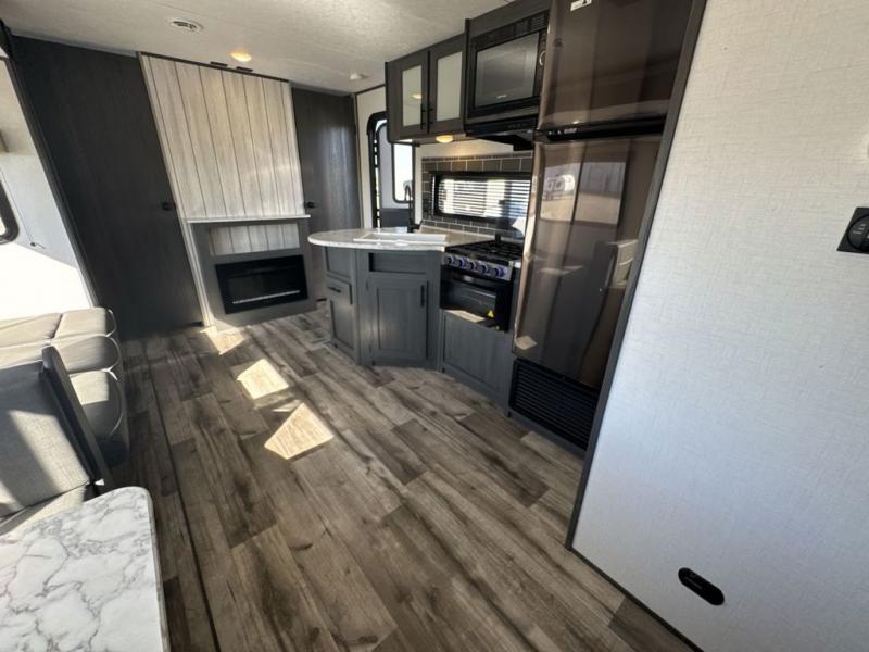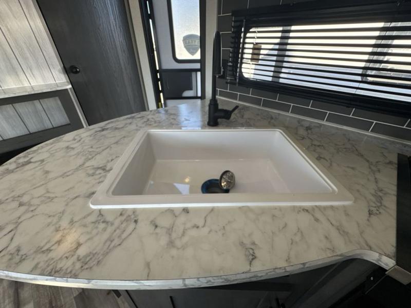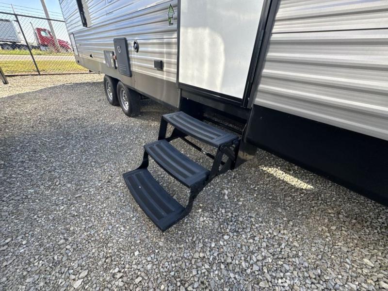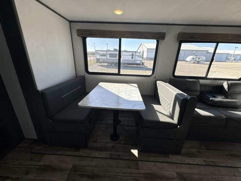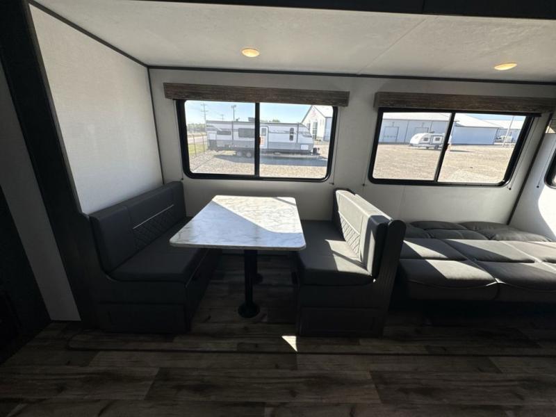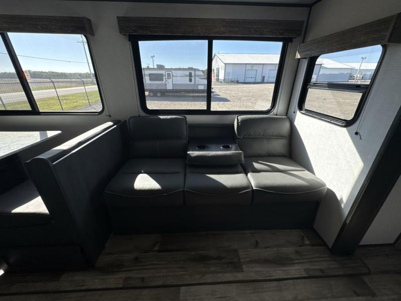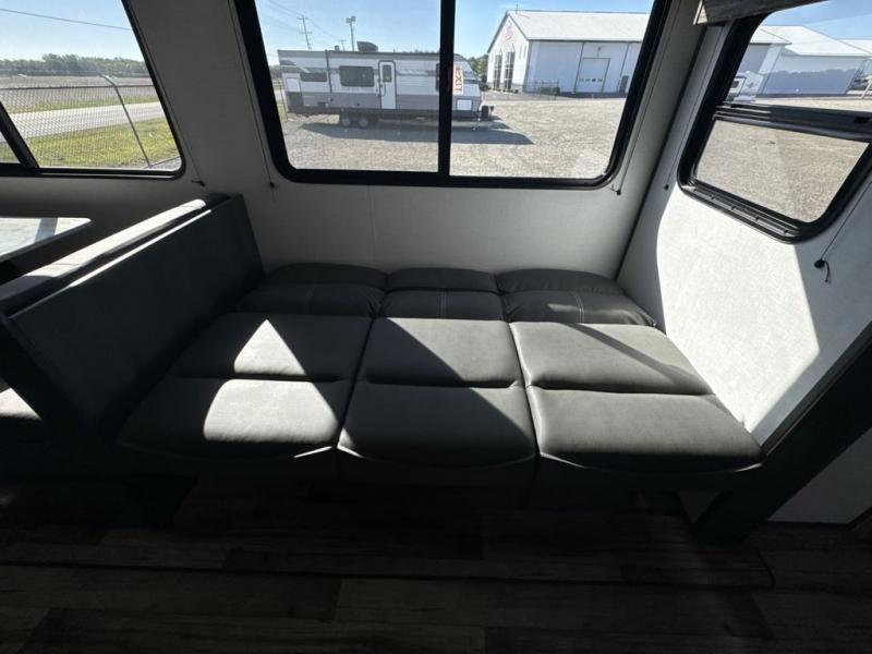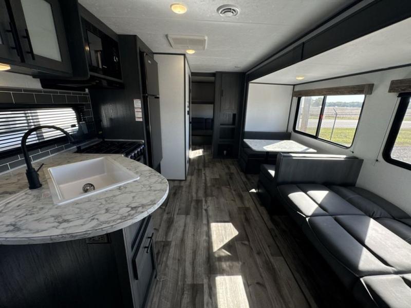 The private bunkhouse might be the main reason you chose this trailer or maybe it was the spacious interior, either way you will enjoy camping with your family and friends every chance you get. The bunkhouse offers triple bunk beds and a sofa, allowing four people to sleep in privacy. You will have your own bedroom up front to sleep on a residential queen bed with dual access, closets and windows to enjoy the campsite view. The full bathroom offers convenience, and the slide out offers more floor space to move about. There is a booth dinette and jackknife sofa to relax on as well as provide more sleeping space for friends and family. The cook will have full amenities including a three burner range top, a galley sink with high rise faucet, plus a 10 cu. ft. 12V refrigerator to store the cold items.