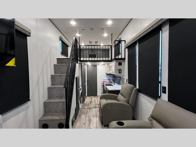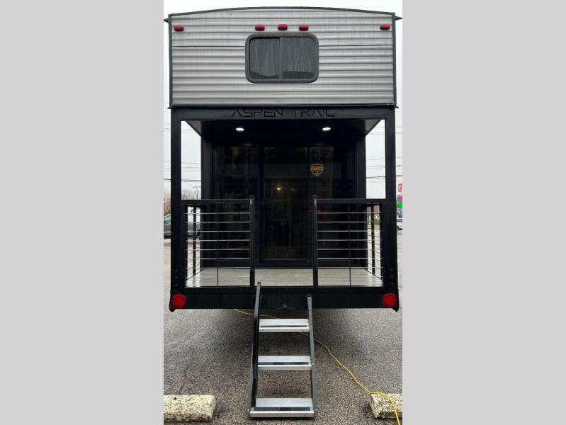 With any Aspen Trail Loft destination trailer, you can enjoy extended stays without the hassle. The fiberglass insulation throughout, 3/8" walk-on roof decking, and chambered chassis are just a few of the durable construction advantages. The high-efficiency 15k BTU A/C cooling system, second 13.5 BTU A/C, and 35,000k BTU furnace will keep you comfortable year around, and the tankless on-demand water heater is an added convenience you won't want to camp without. You'll enjoy spending time outdoors with the large awning and light strip, and the folding entry assist handle makes it easy to come and go. A central vacuum system will make it easier to clean up and an Aspen Trail command center provides a central place to control your unit's functions. The interior of the Aspen Trail Loft features the Home Series interior design package, seamless countertops, residential appliances, blackout roller shades throughout, and an 8 ft. ceiling height with a 7 ft. slide out height.