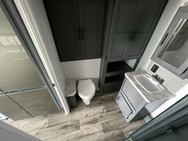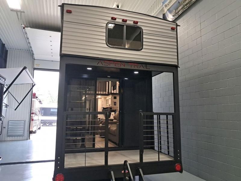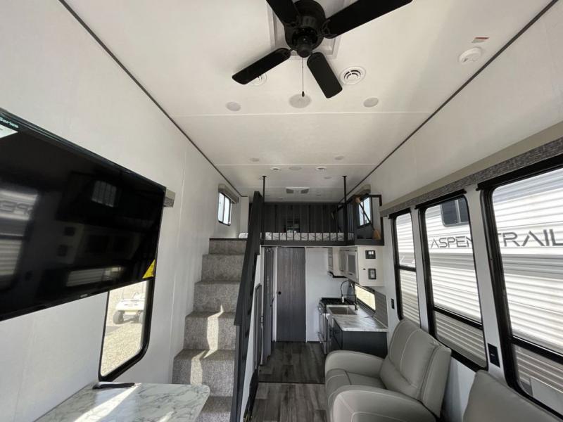 With any Aspen Trail Loft destination trailer, you can enjoy extended stays without the hassle. The fiberglass insulation throughout, 3/8" walk-on roof decking, and chambered chassis are just a few of the durable construction advantages. The high-efficiency 15k BTU A/C cooling system, second 13.5 BTU A/C, and 35,000k BTU furnace will keep you comfortable year around, and the tankless on-demand water heater is an added convenience you won't want to camp without. You'll enjoy spending time outdoors with the large awning and light strip, and the folding entry assist handle makes it easy to come and go. A central vacuum system will make it easier to clean up and an Aspen Trail command center provides a central place to control your unit's functions. The interior of the Aspen Trail Loft features the Home Series interior design package, seamless countertops, residential appliances, blackout roller shades throughout, and an 8 ft. ceiling height with a 7 ft. slide out height.