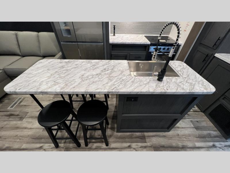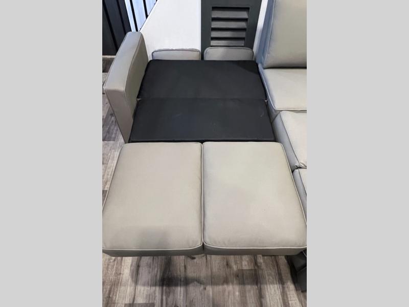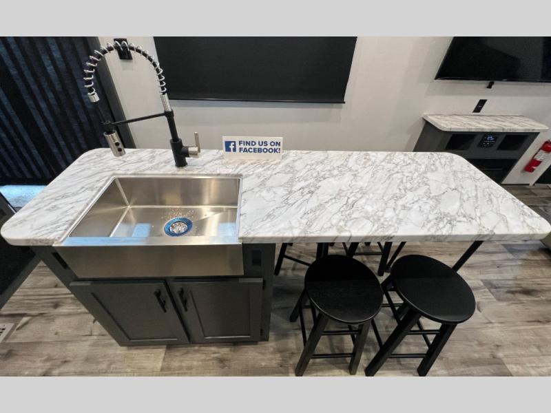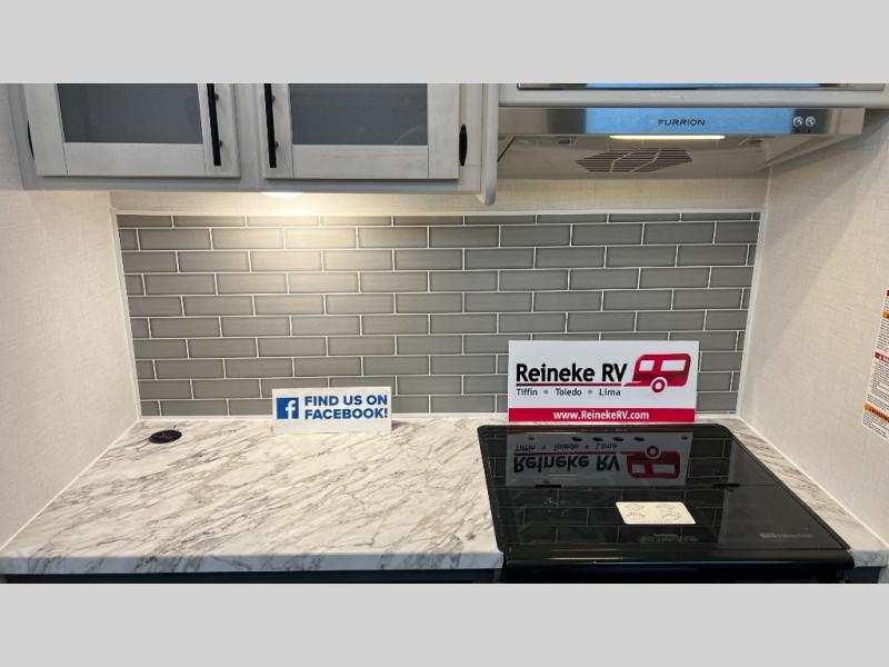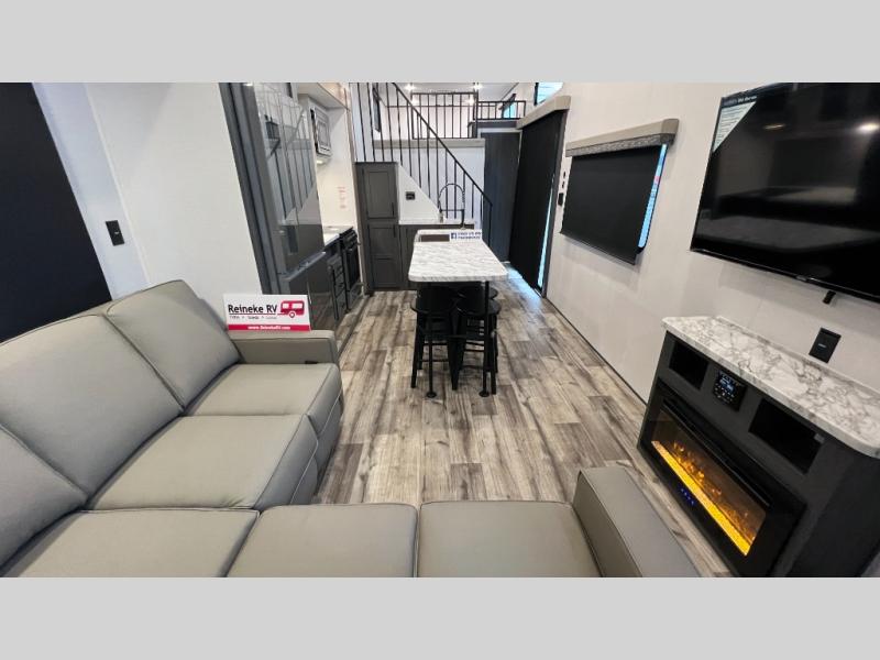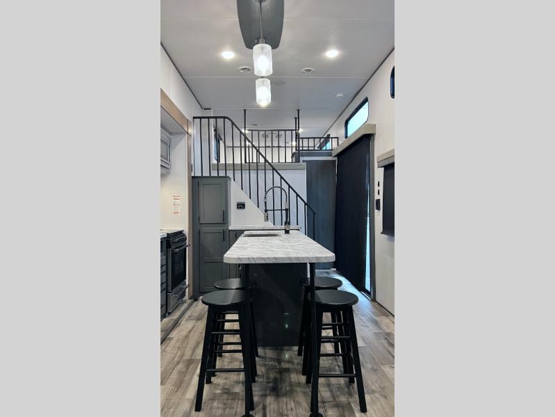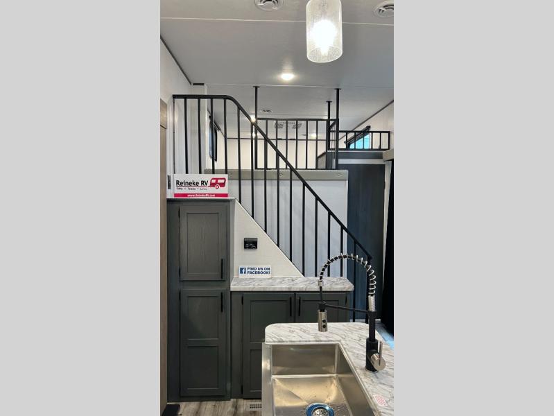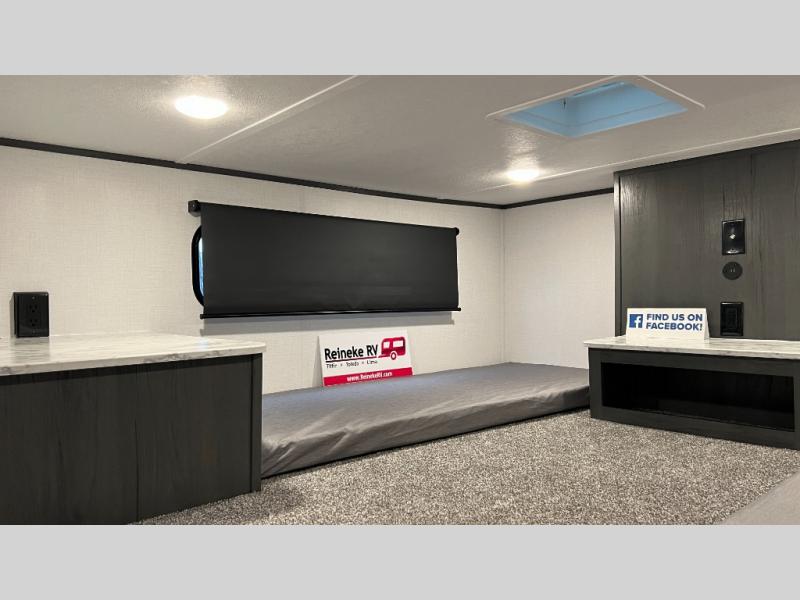 You won't believe all that this travel trailer has to offer! Starting with the two loft areas, one above the front private bedroom and the other above the full rear bathroom, both of which have two beds. There is enough space in the full rear bathroom for more than one to get ready at the dual sink vanity and the washer/dryer prepped area will come in handy for keeping everyone's clothes clean throughout the trip. The kitchen island has four bar stools for meals to be eaten, laughter to be enjoyed, and meals to be prepped. The unique L-shaped sofa has a recliner on one end and a tri-fold sofa portion for extra sleeping space all by the entertainment center with a LED fireplace with electric heat to warm you up on a chilly fall evening!