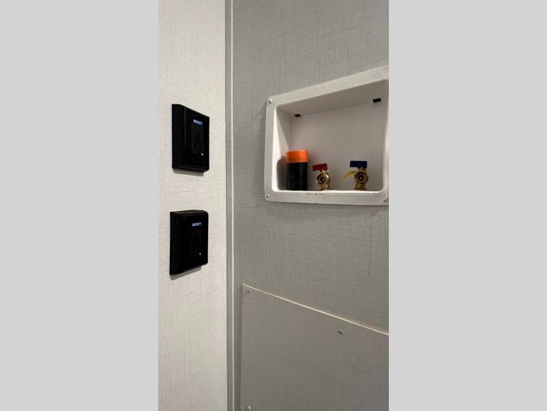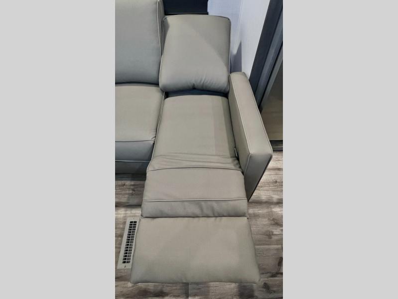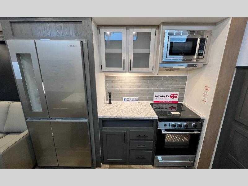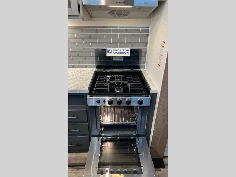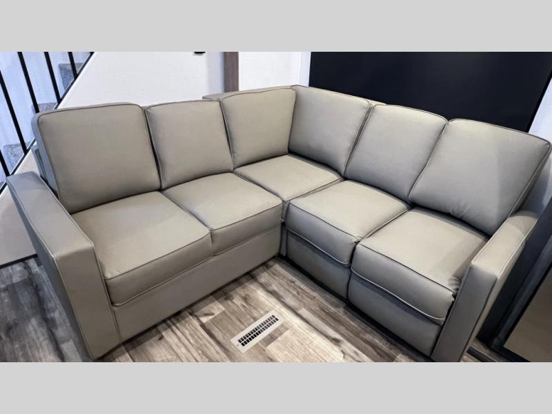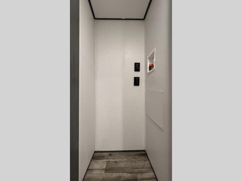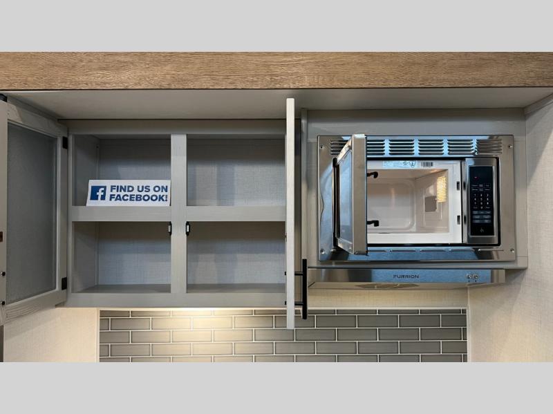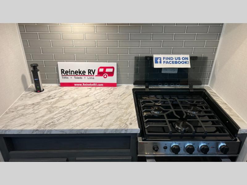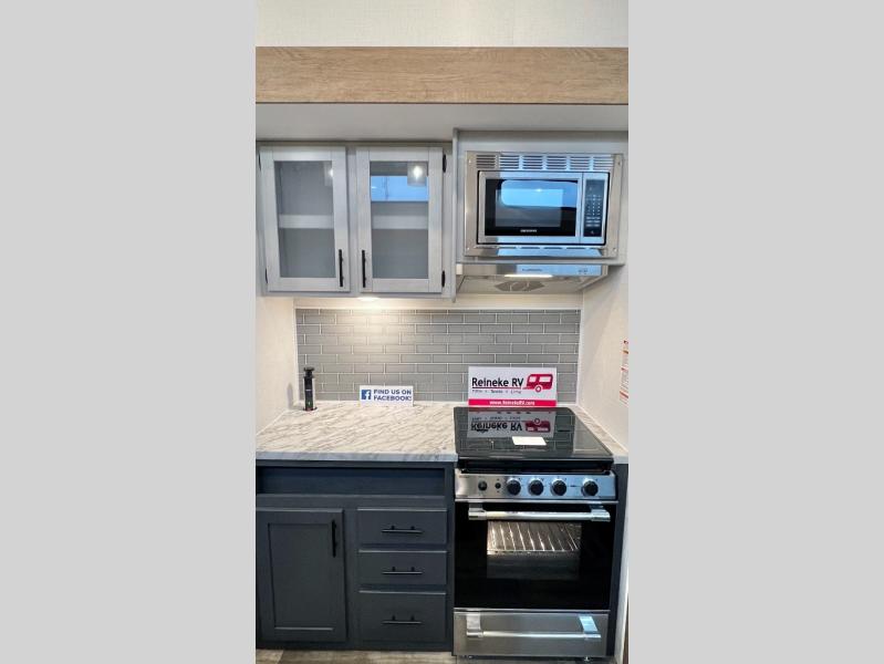 You won't believe all that this travel trailer has to offer! Starting with the two loft areas, one above the front private bedroom and the other above the full rear bathroom, both of which have two beds. There is enough space in the full rear bathroom for more than one to get ready at the dual sink vanity and the washer/dryer prepped area will come in handy for keeping everyone's clothes clean throughout the trip. The kitchen island has four bar stools for meals to be eaten, laughter to be enjoyed, and meals to be prepped. The unique L-shaped sofa has a recliner on one end and a tri-fold sofa portion for extra sleeping space all by the entertainment center with a LED fireplace with electric heat to warm you up on a chilly fall evening!