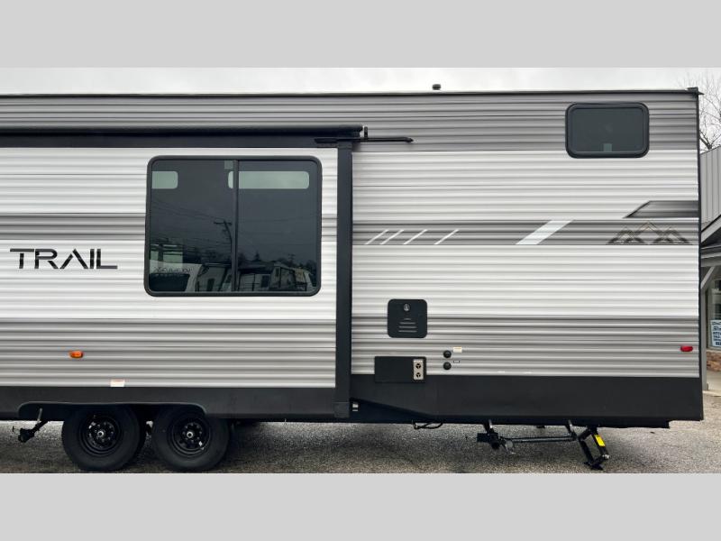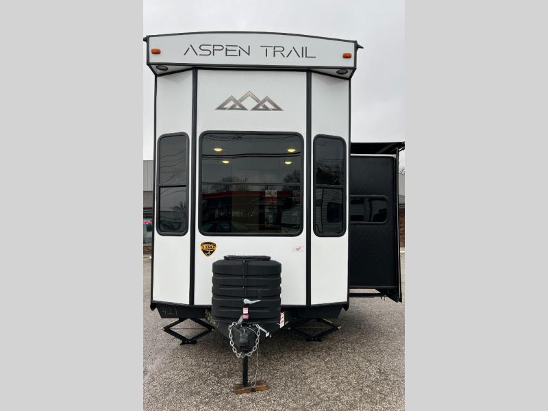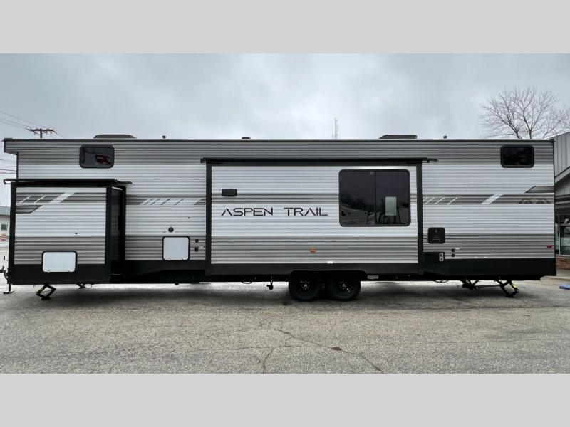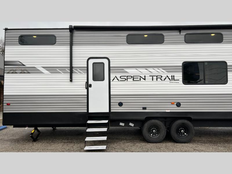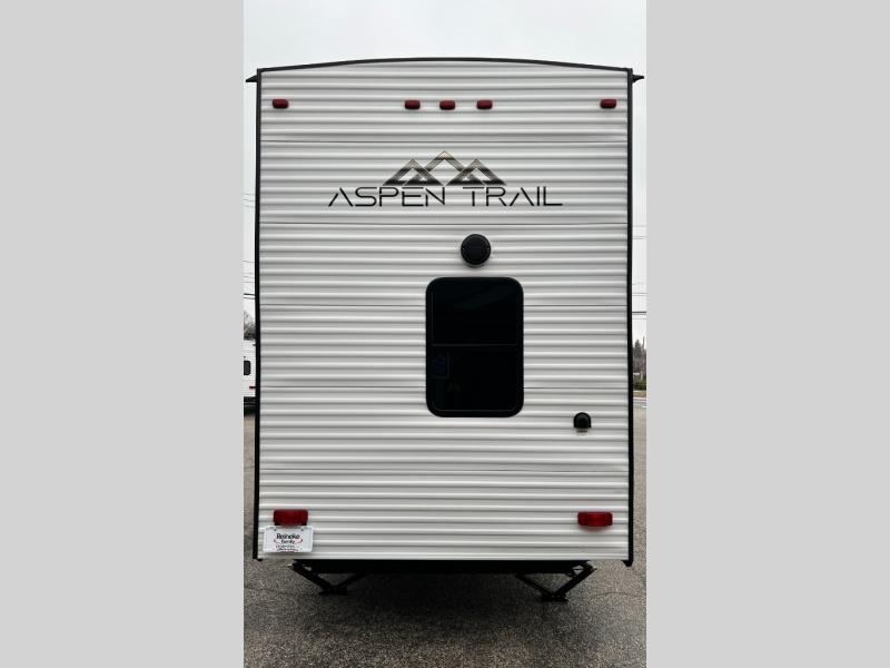 You will find more standard features and more value in each one of these Dutchmen RV Aspen Trail travel trailers! There is a smooth metal front end, diamond plate rock guard, a backup camera prep, plus many more exterior features. Experience all of the power with a power awning, and a power tongue jack for easy setting up and breaking down. The fully enclosed underbelly provides an extra layer of protection for your unit's vitals so you can camp further into the year. With aluminum steps at the main entry, you will have a solid platform of stability as you enter and exit, plus they are easy to expand or store away. And the hardwood cabinetry throughout, roller shades, and seamless countertops will have you feeling right at home!